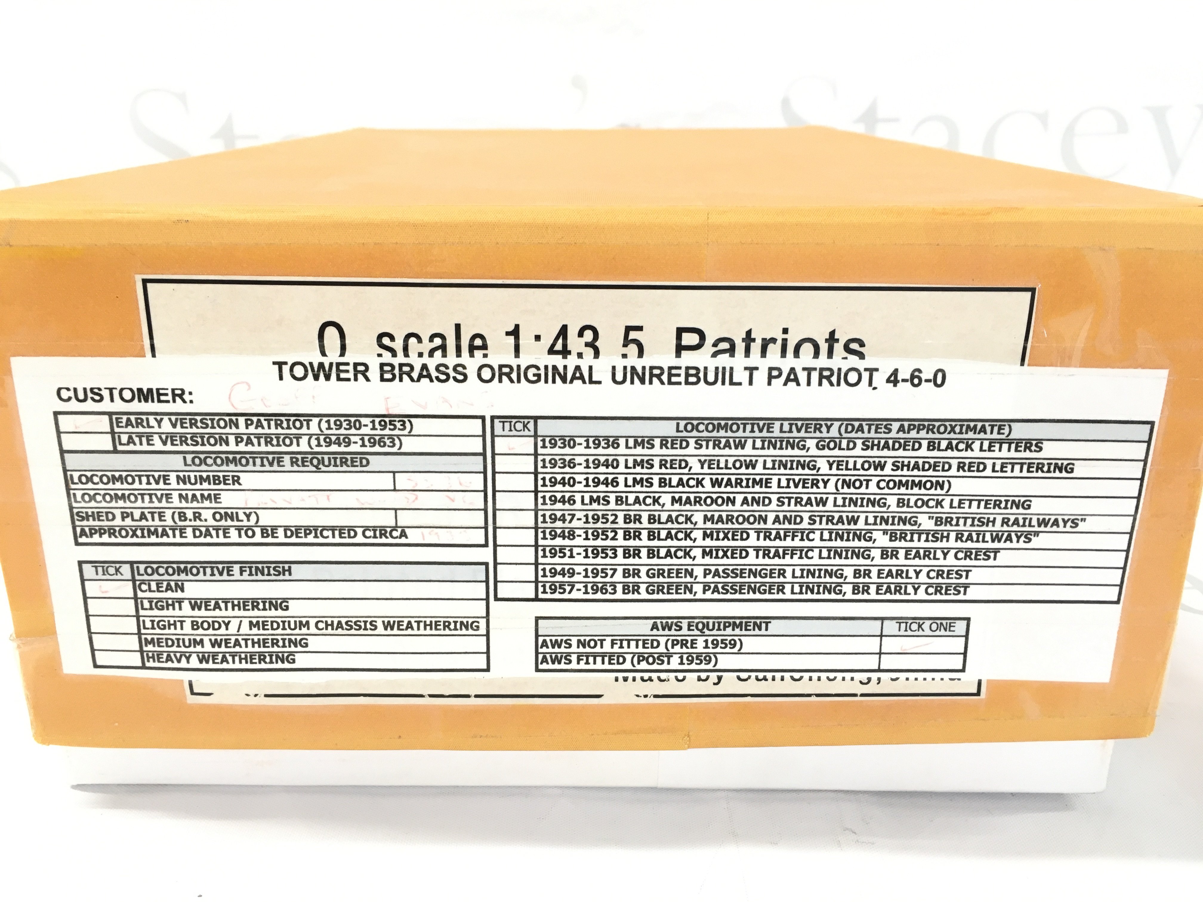 A Tower Models 0 Gauge 4-6-0 Patriot Locomotive With Tender.