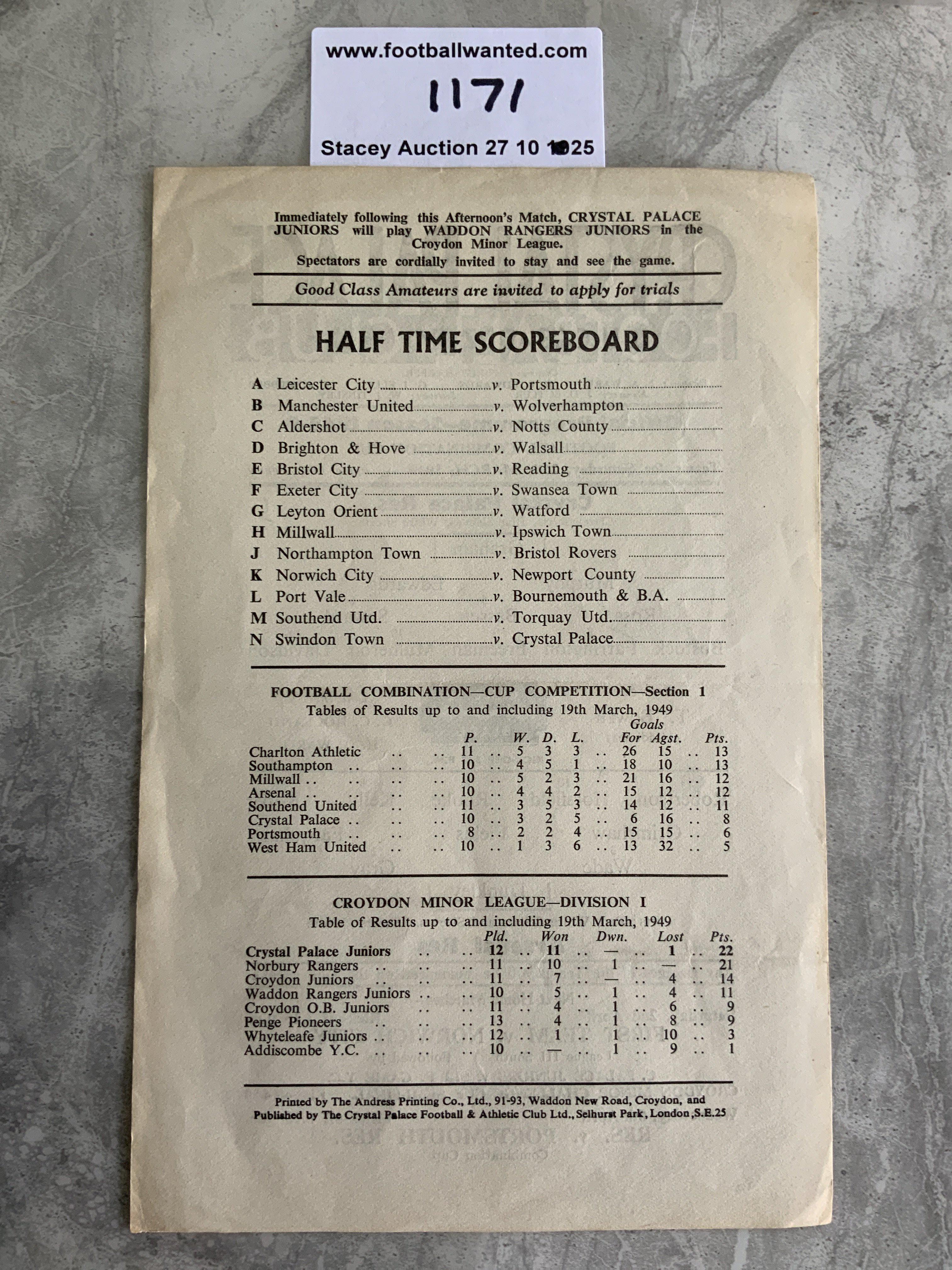 48/49 Crystal Palace v Arsenal Reserves Football Programme: Combination Cup match dated 26 3 1949. Excellent condition single sheet with score and scorers noted.