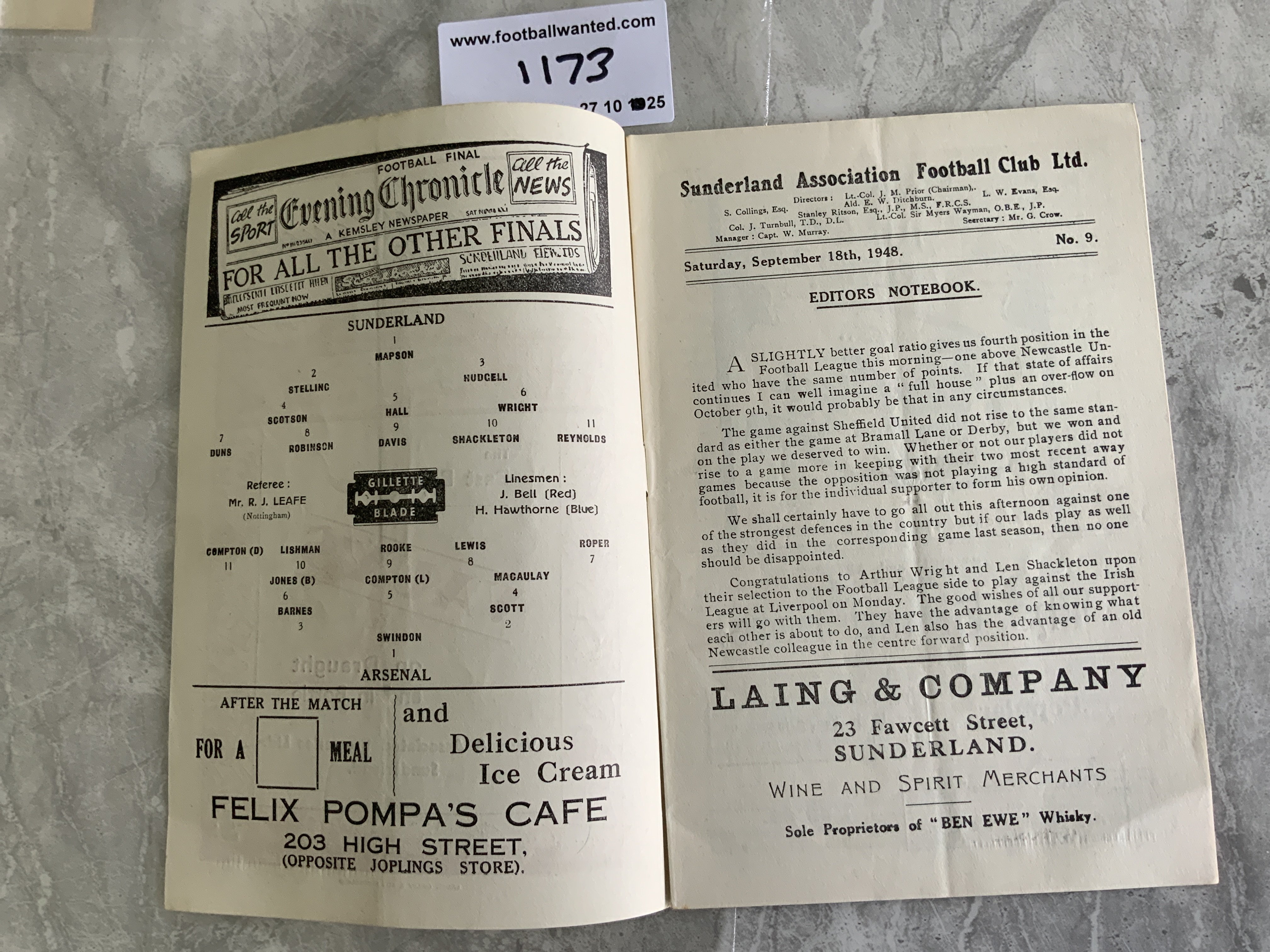 48/49 Sunderland v Arsenal Football Programme: Excellent condition league match with no team changes.