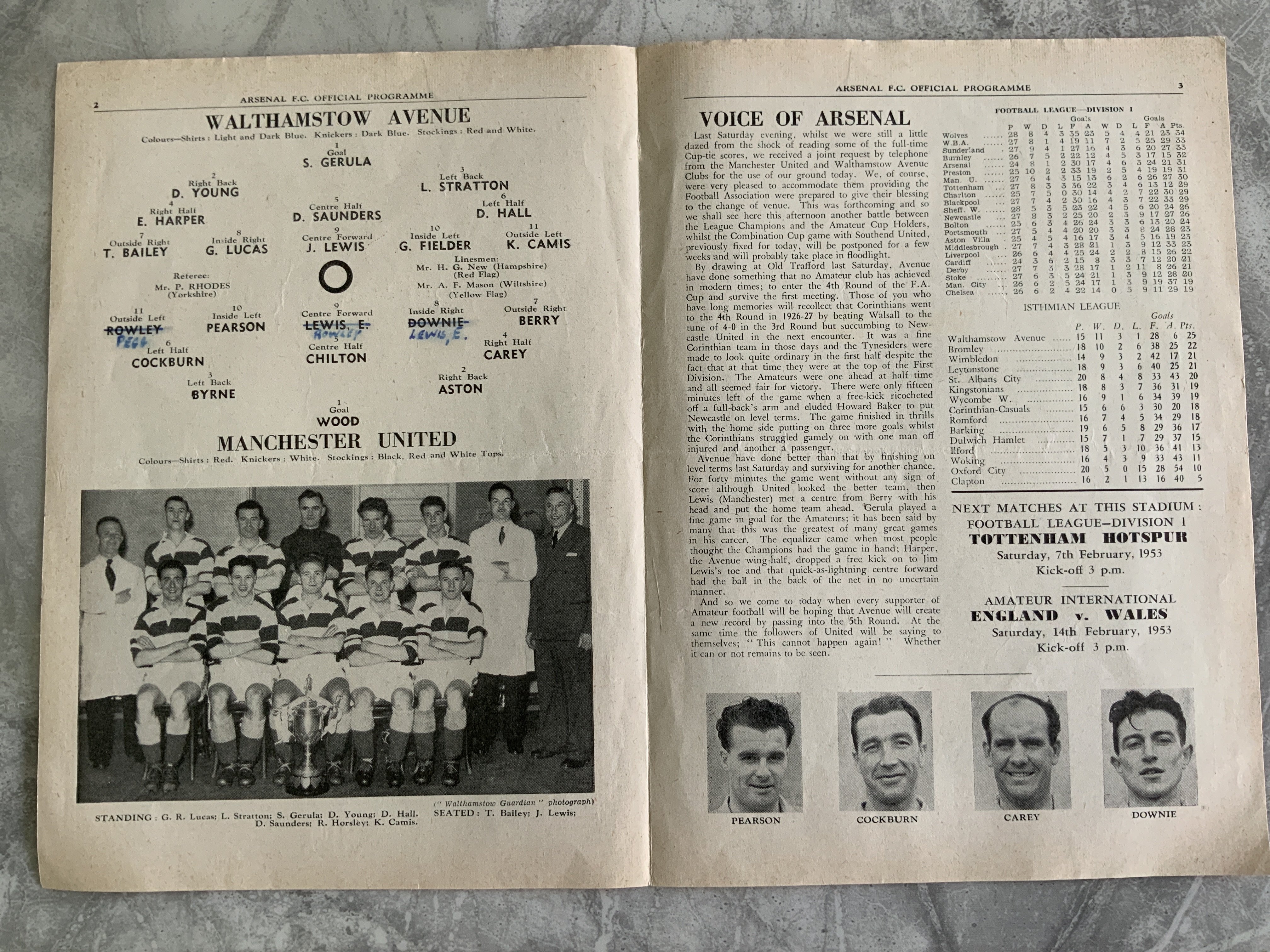 52/53 Walthamstow v Manchester United FA Cup Replay Football Programme: Played at Arsenal on 5 2 1953. Excellent condition 4 pager league match with team changes.