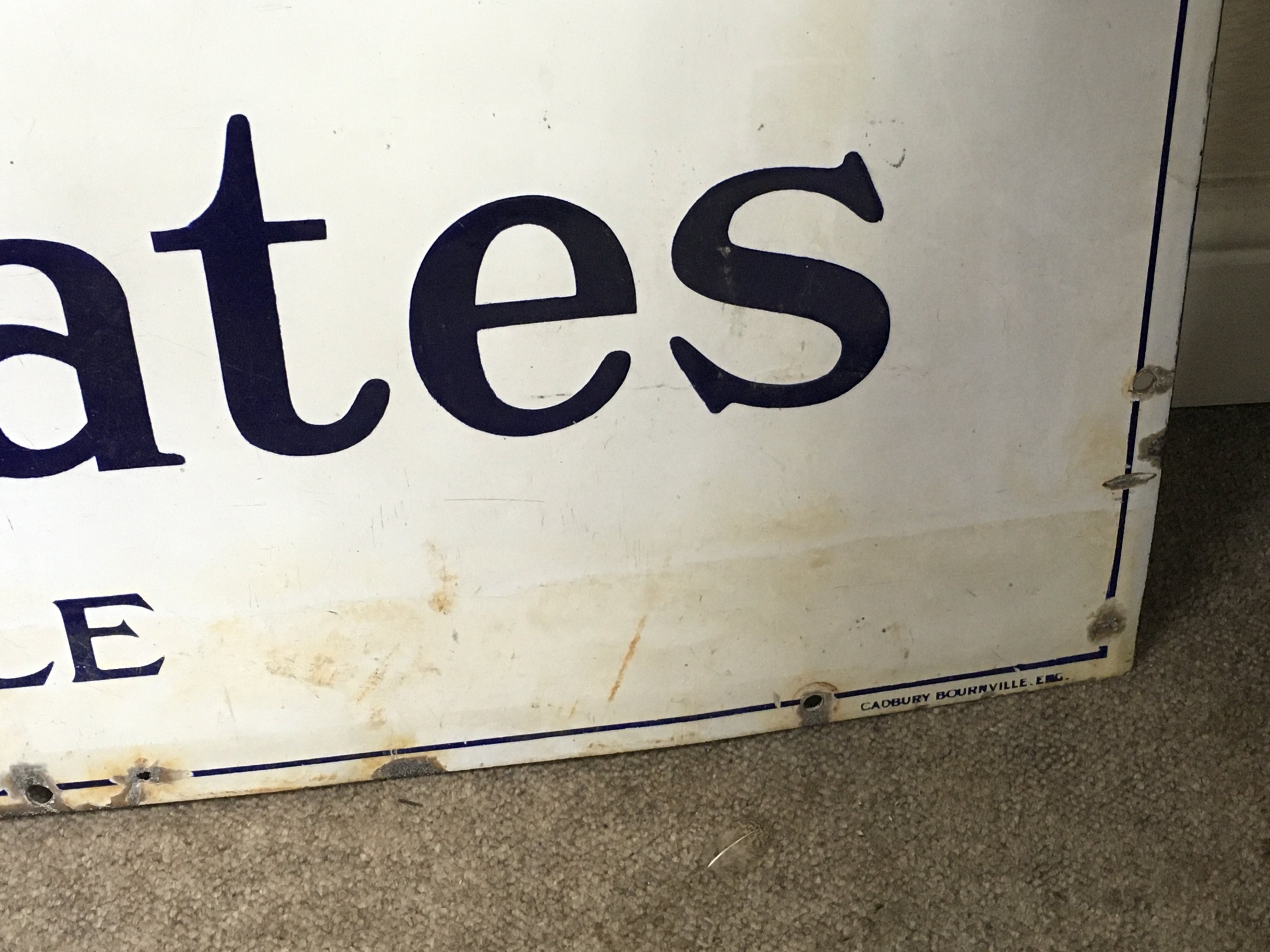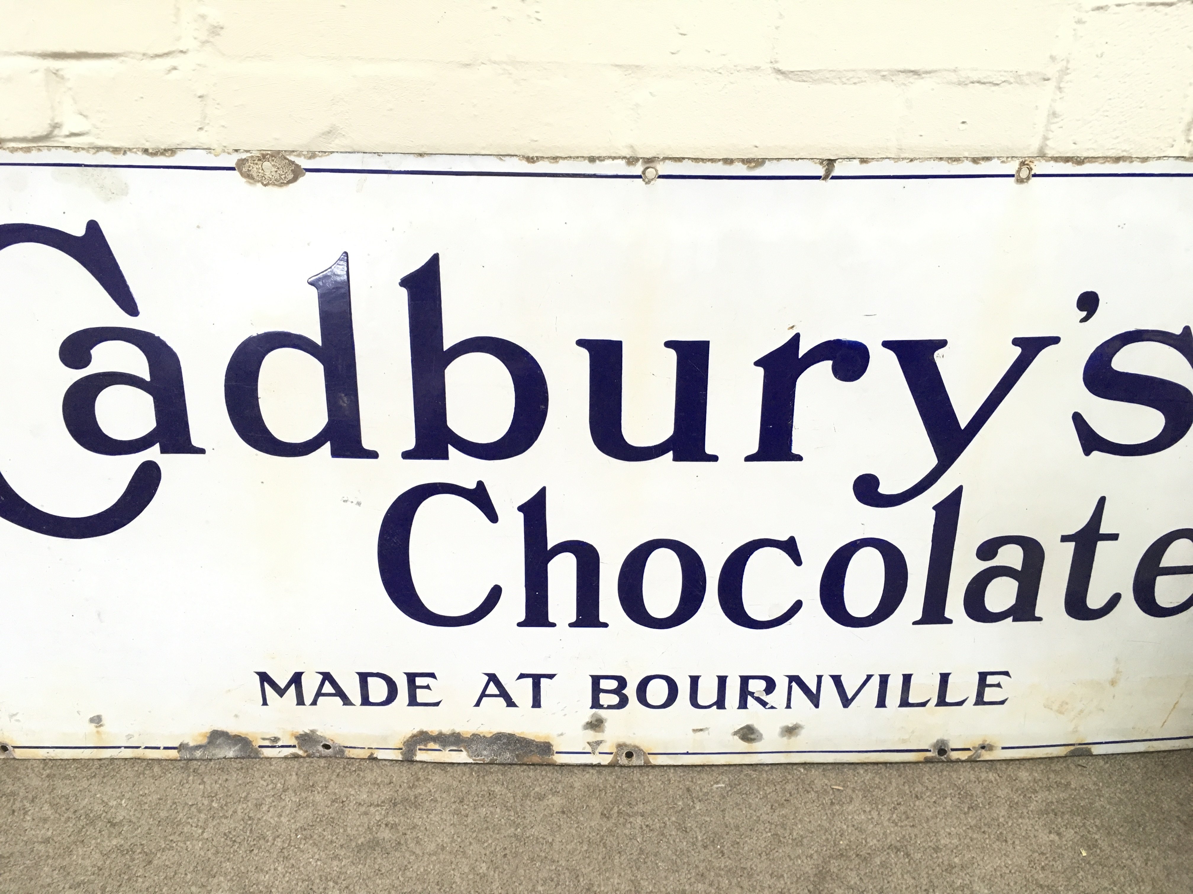 Cadbury chocolates made at bournville enamel sign 58 x 23 inches approximately