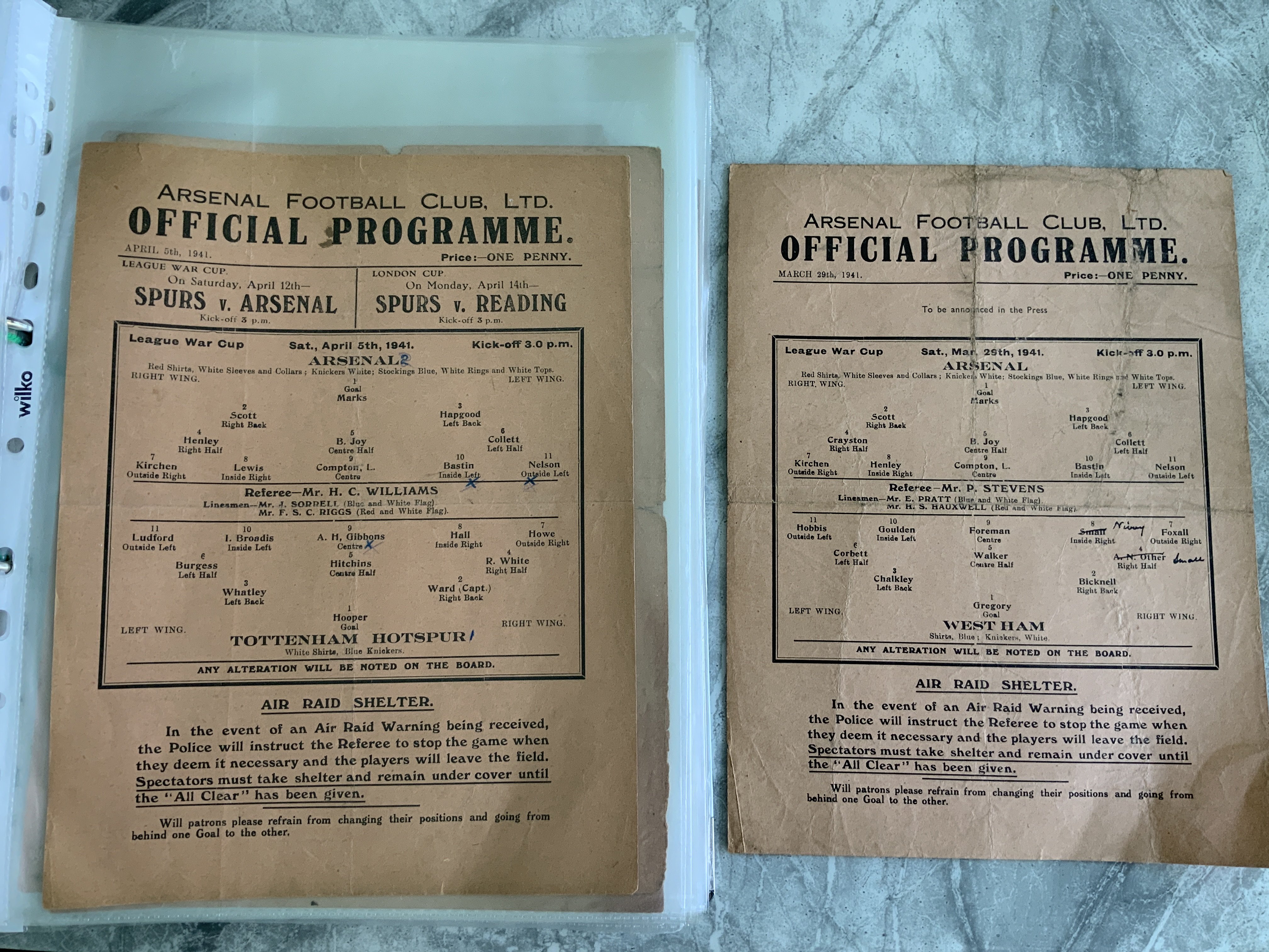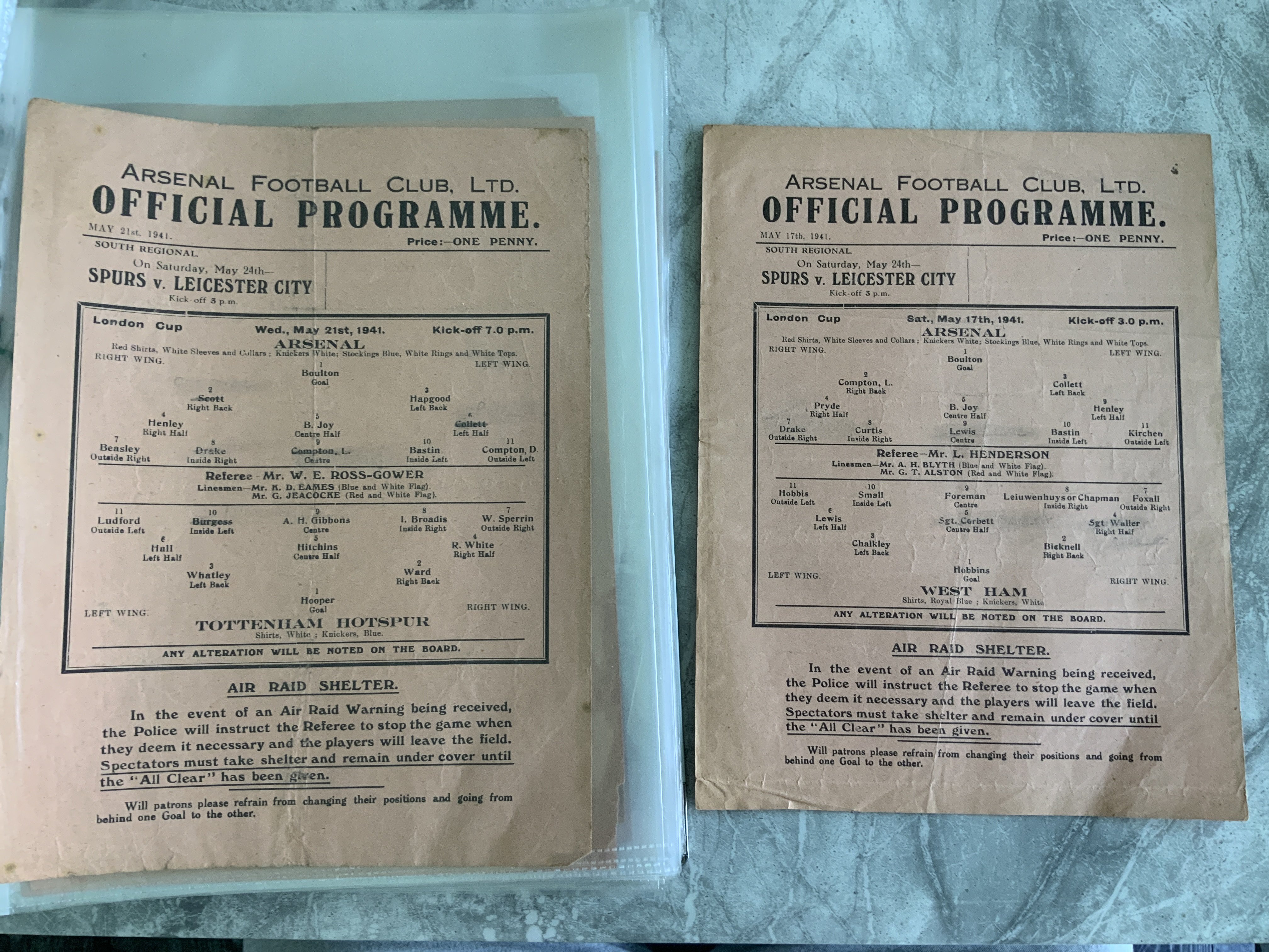 Arsenal 40/41 Home Football Programmes: Good condition single sheets. Includes League matches v Fulham Northampton, London War Cup v Clapton Orient Watford West Ham Tottenham and League War cup v Leicester West Ham and Tottenham. Some have team changes. Rare chance. (9)