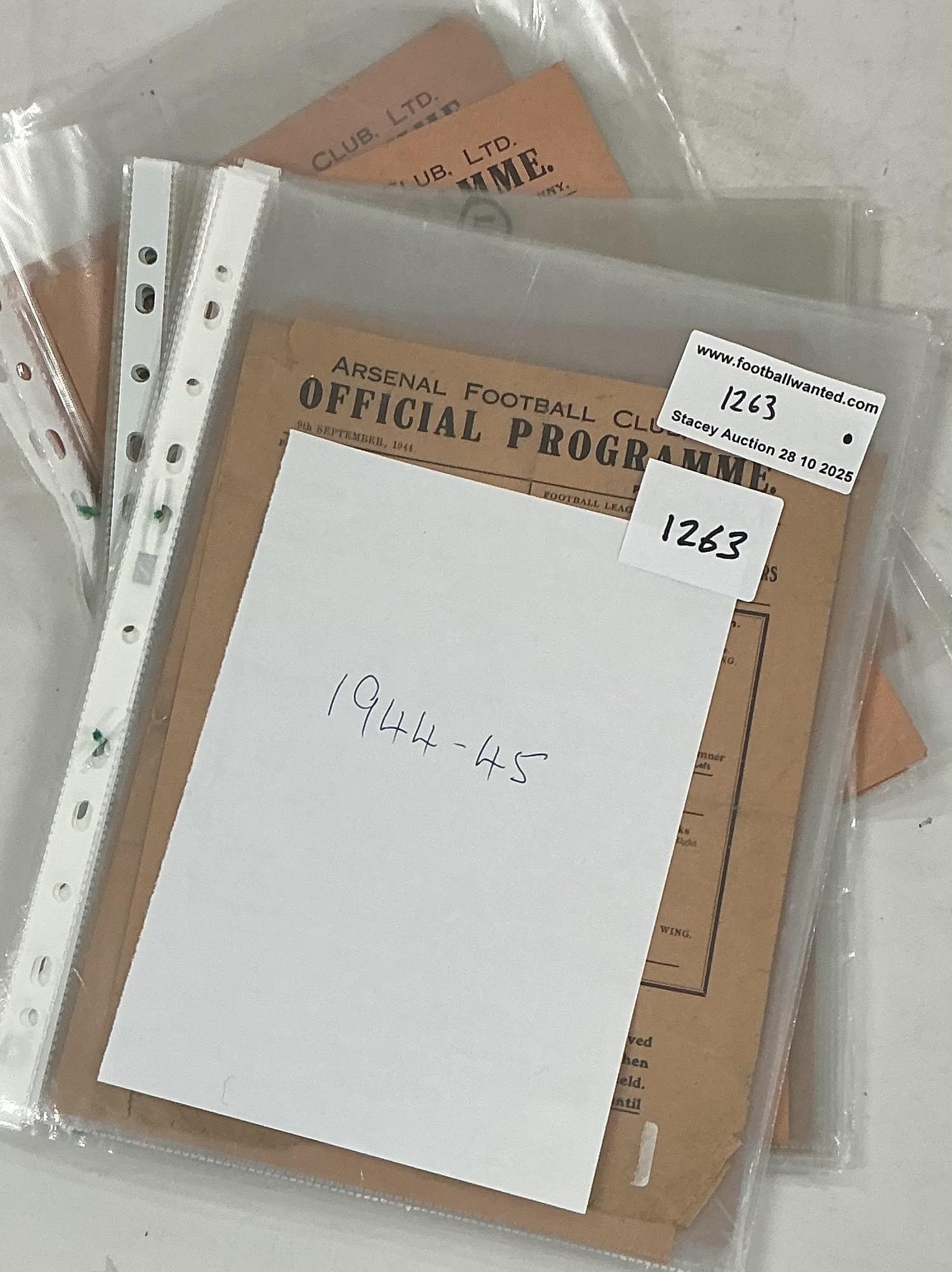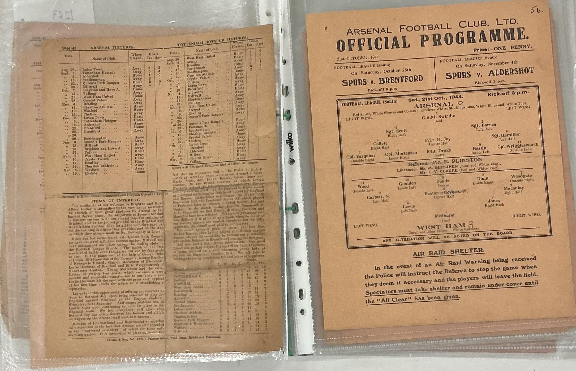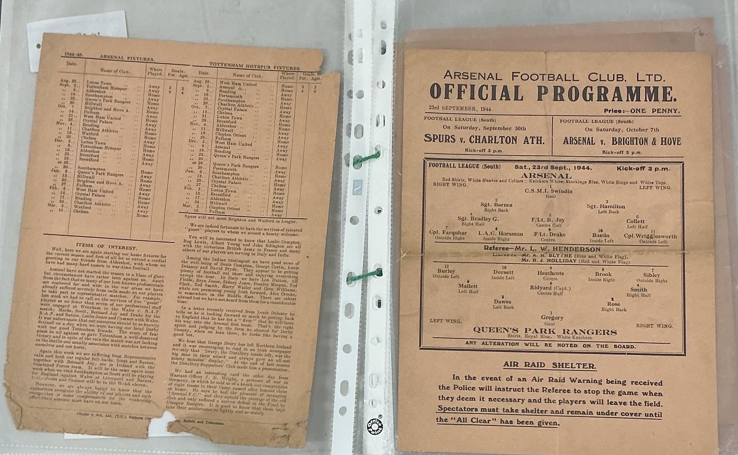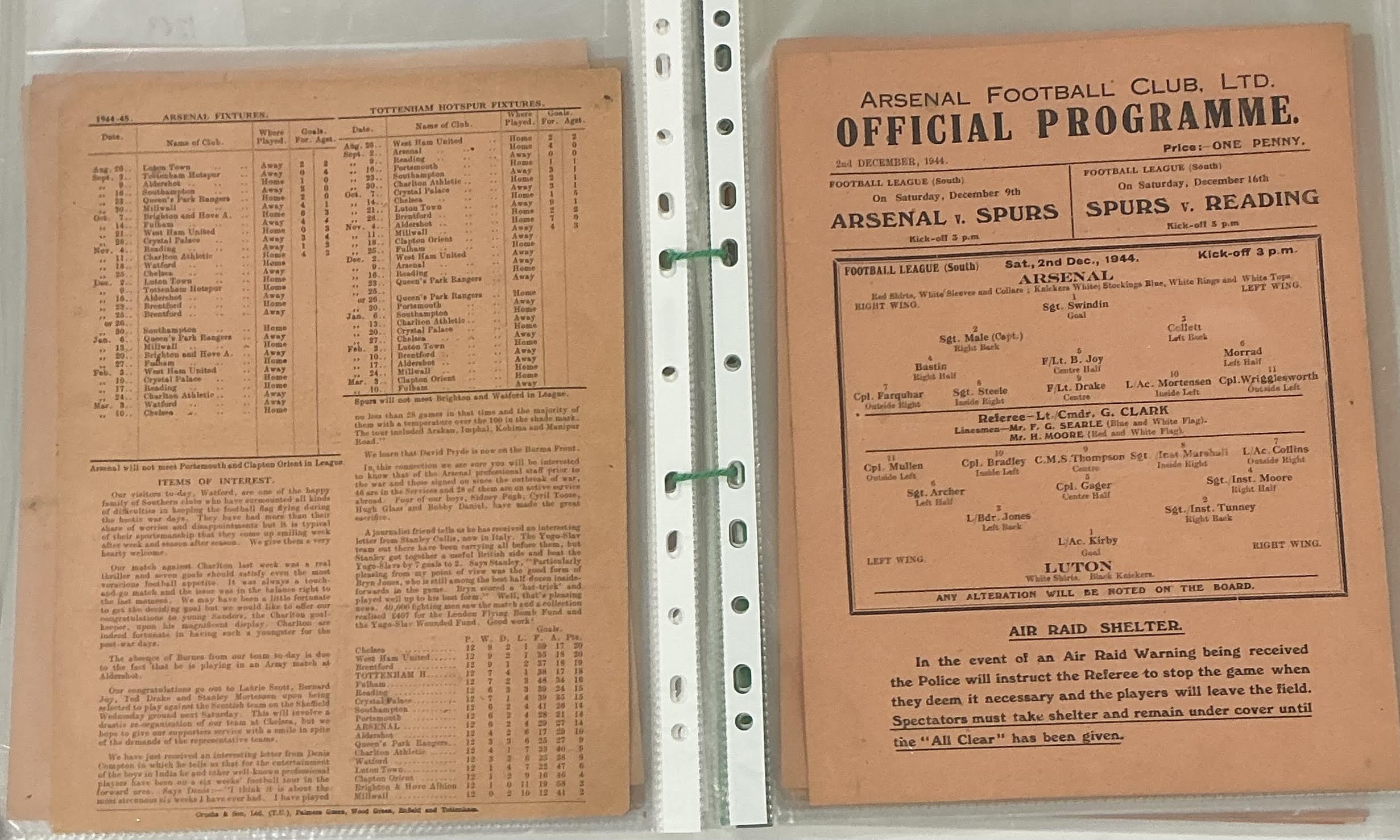 Arsenal 44/45 Complete Home Football Programmes: Single sheets to include League matches v Aldershot QPR Brighton West Ham Charlton Watford Luton Tottenham Brentford Southampton Millwall Fulham Crystal Palace Reading Chelsea and Cup v Clapton Orient Reading Portsmouth. Some have team changes a couple are poor but mainly good. (18)