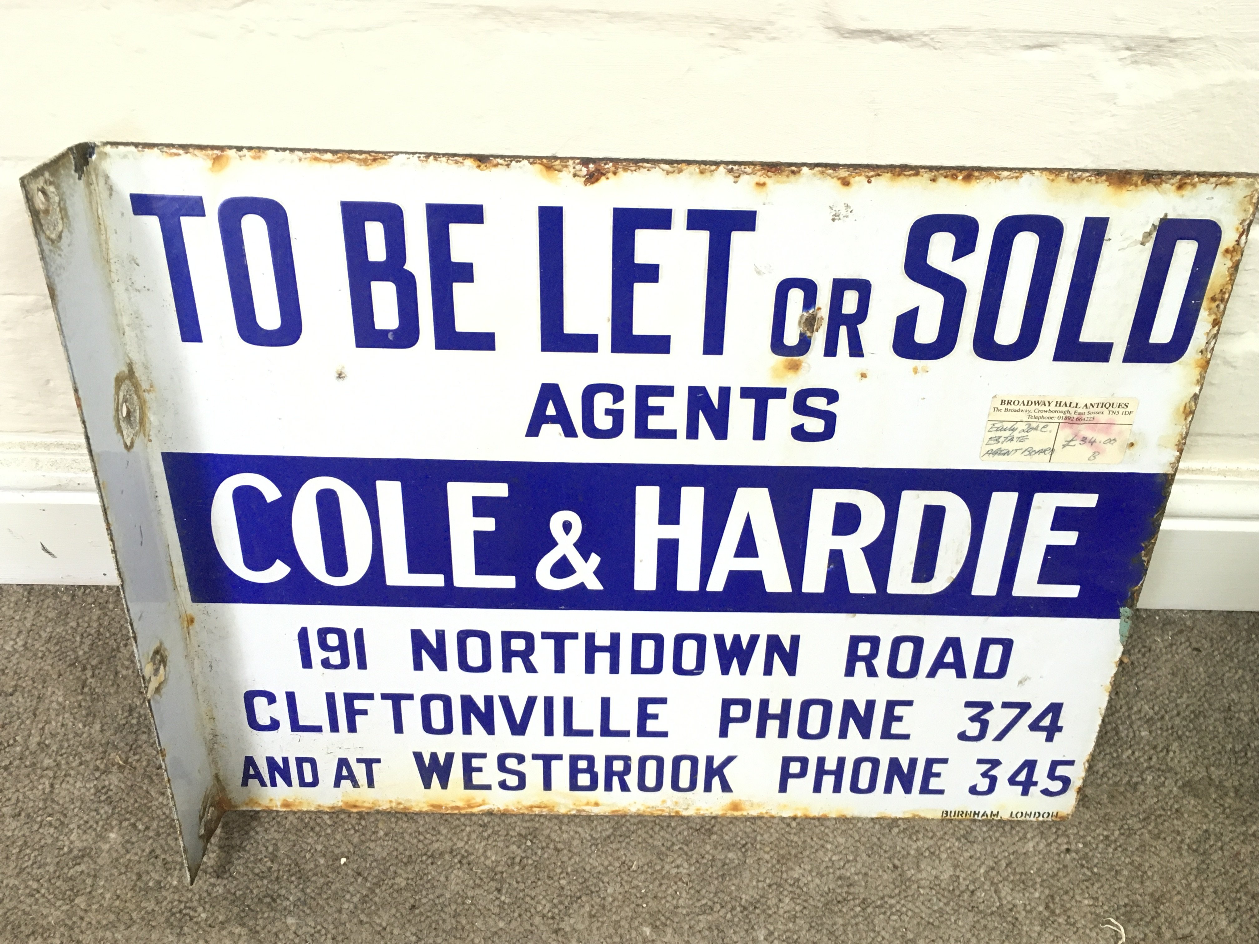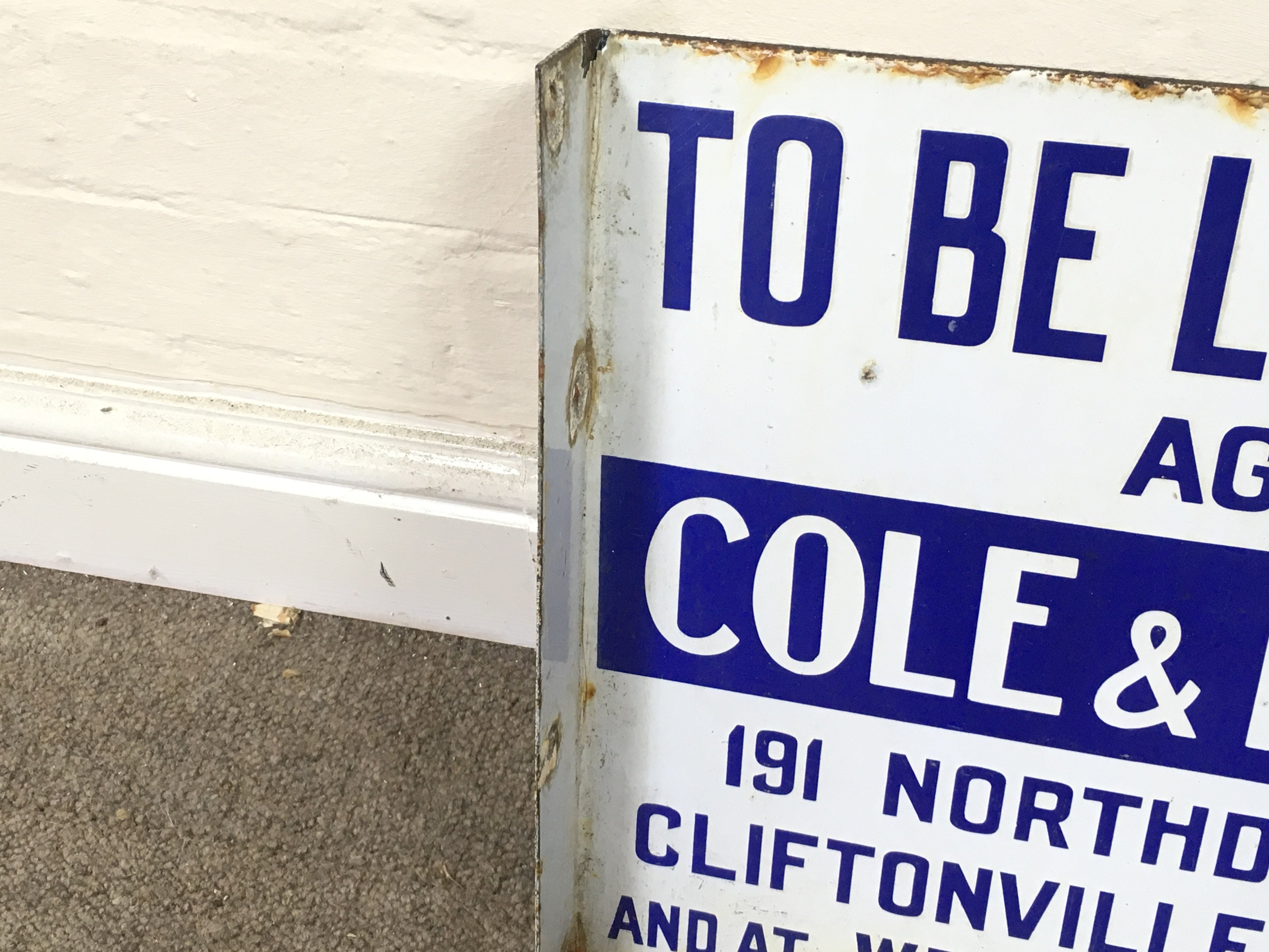 Flanged enamel sign for the estate agents "Cole & Hardie" advertising properties "To Be Let or Sold 18 x 14 inches approximately