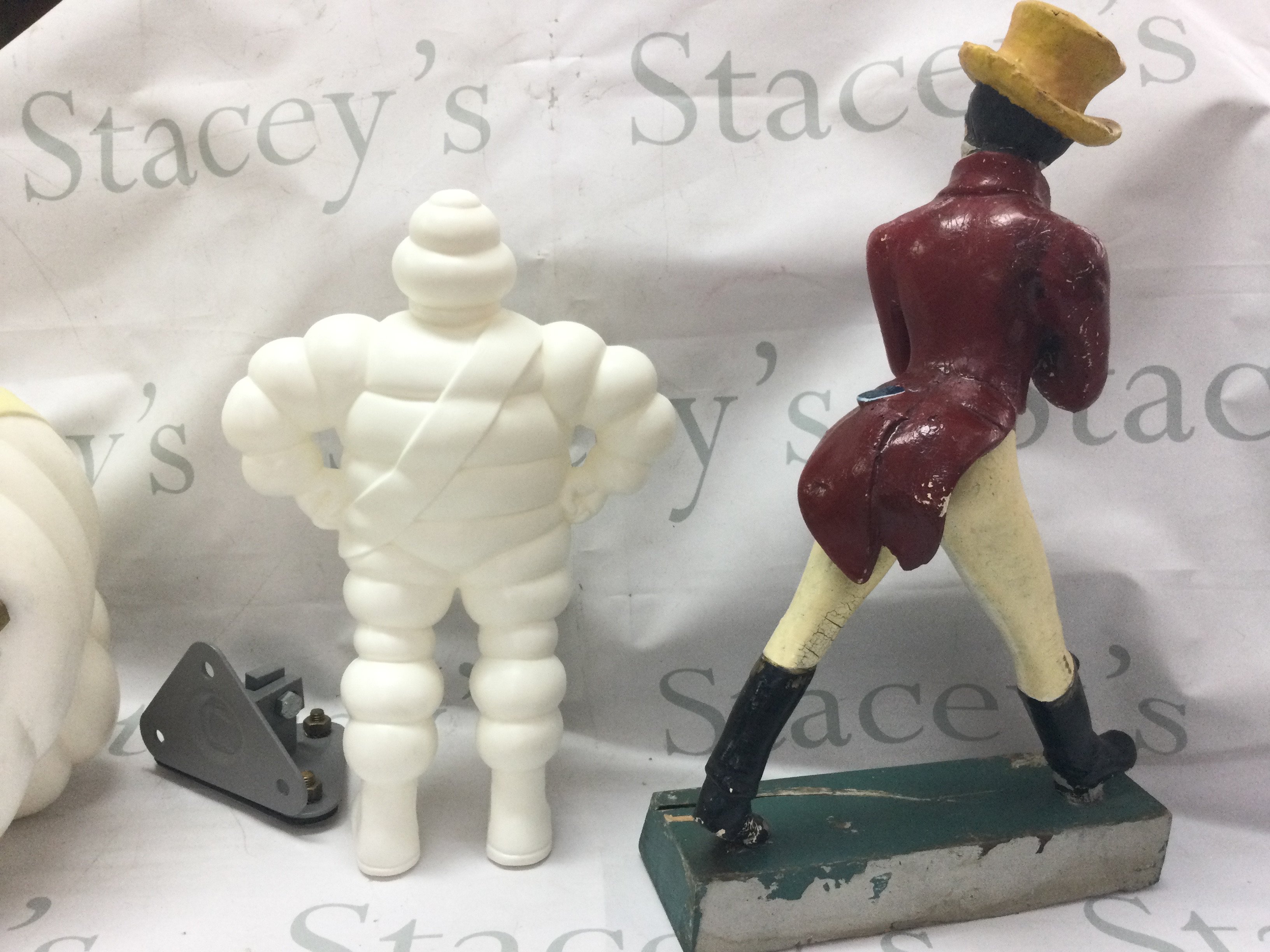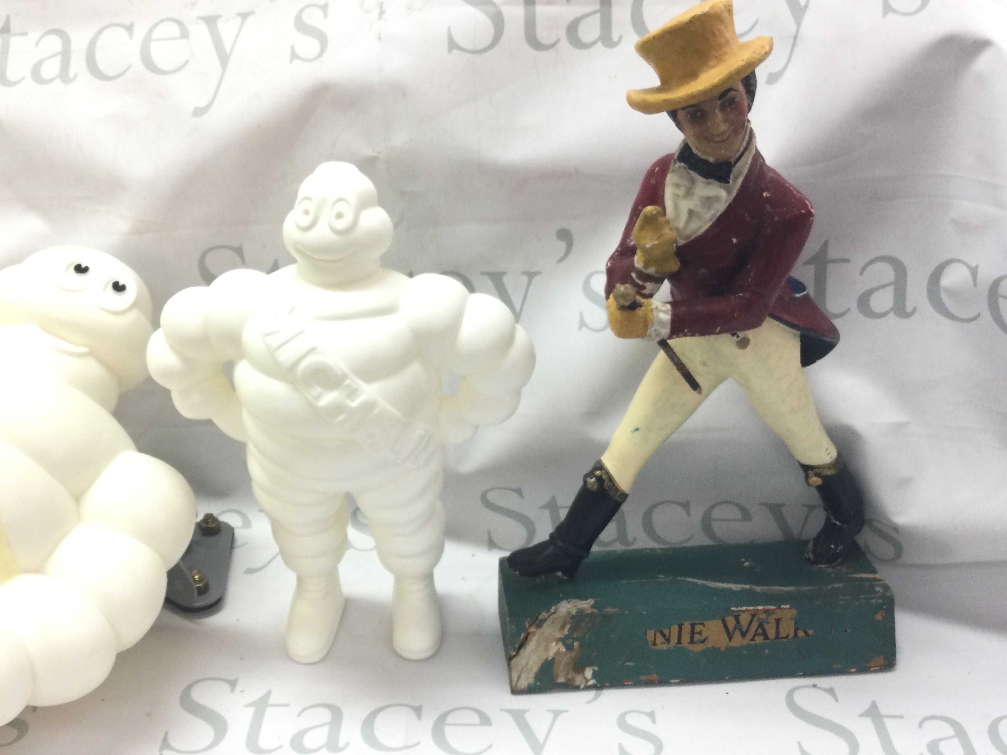 Three vintage advertising figures including Johnnie Walker (39cm tall) and Michelin Men (31cm & 47cm tall) both made in France, one with a mount.