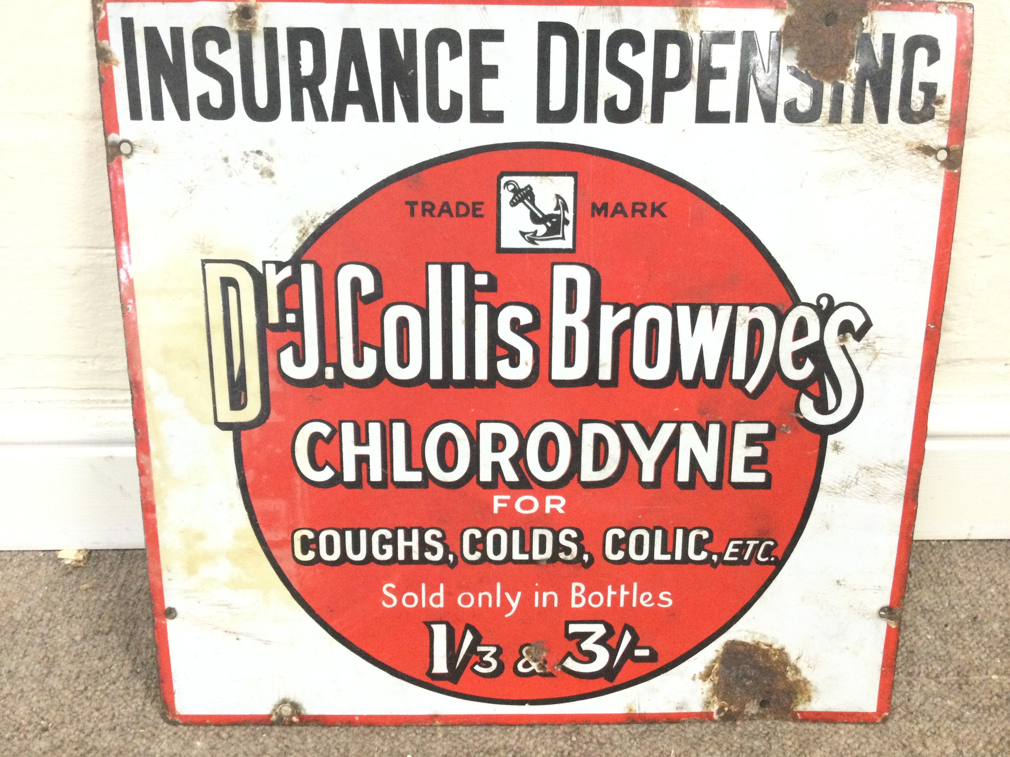 enamel advertising sign for Doctor J Collis Browne's Chlorodyne for Coughs Colds and Colic? 17 x 16 inches approximately