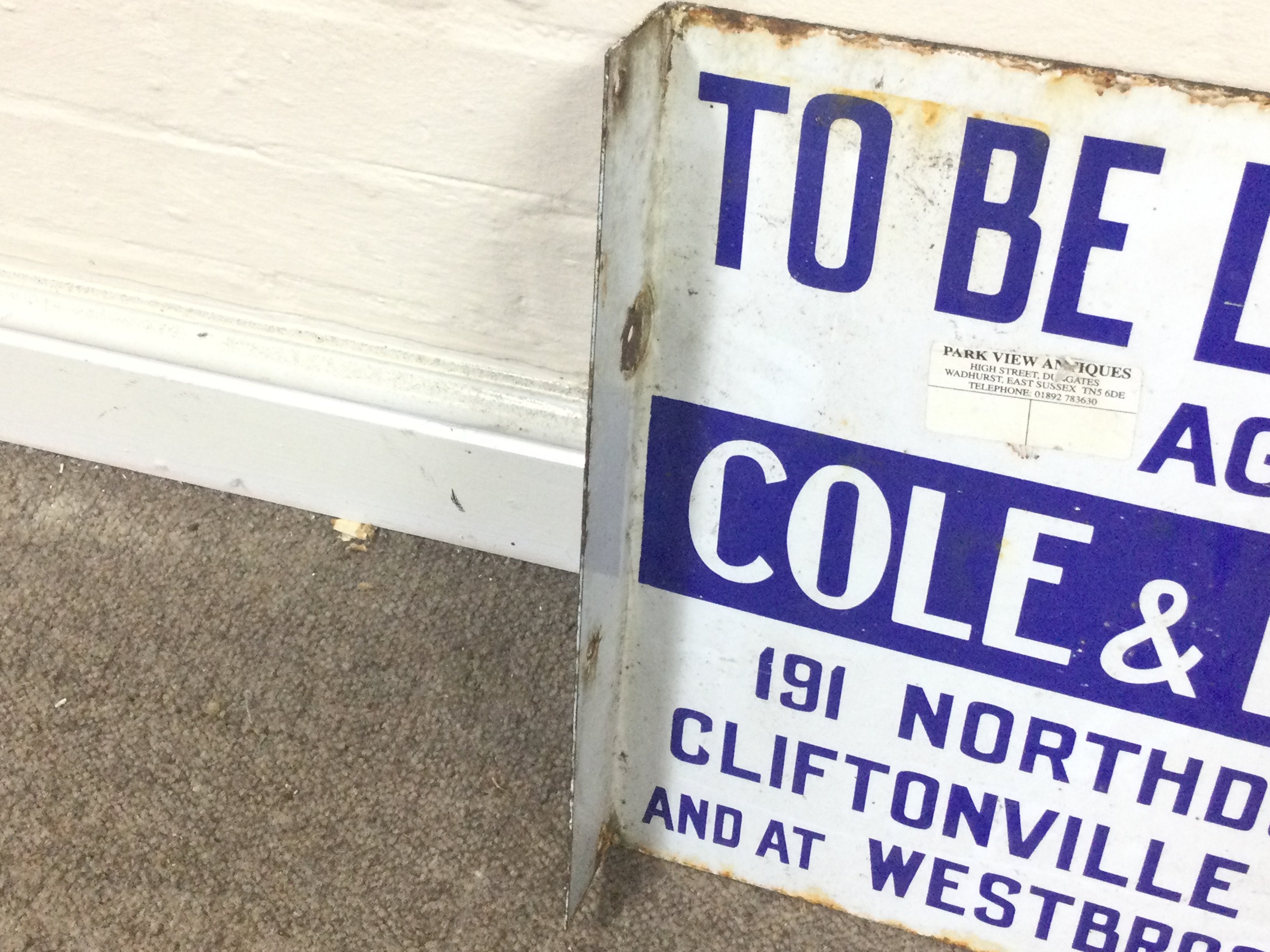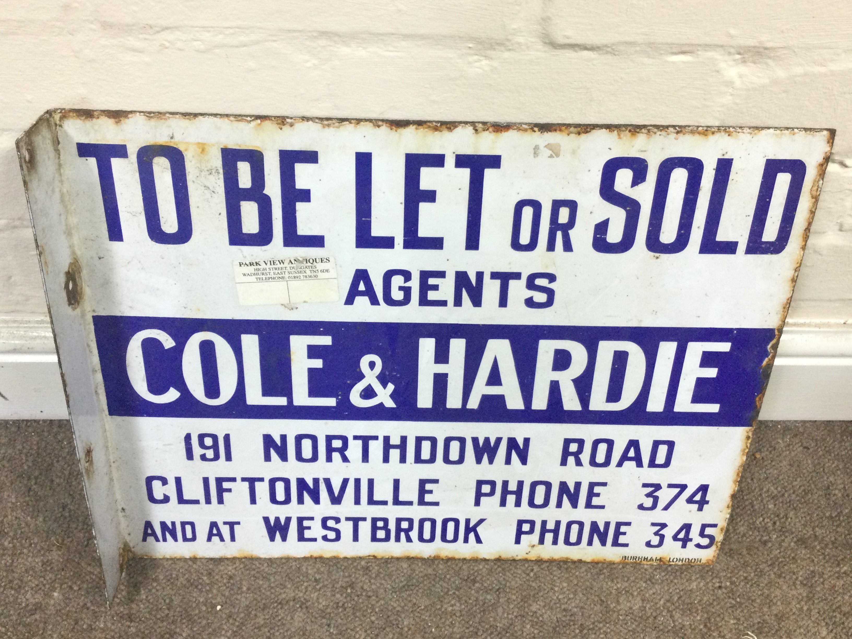 Flanged enamel sign for the estate agents "Cole & Hardie" advertising properties "To Be Let or Sold 18 x 14 inches approximately