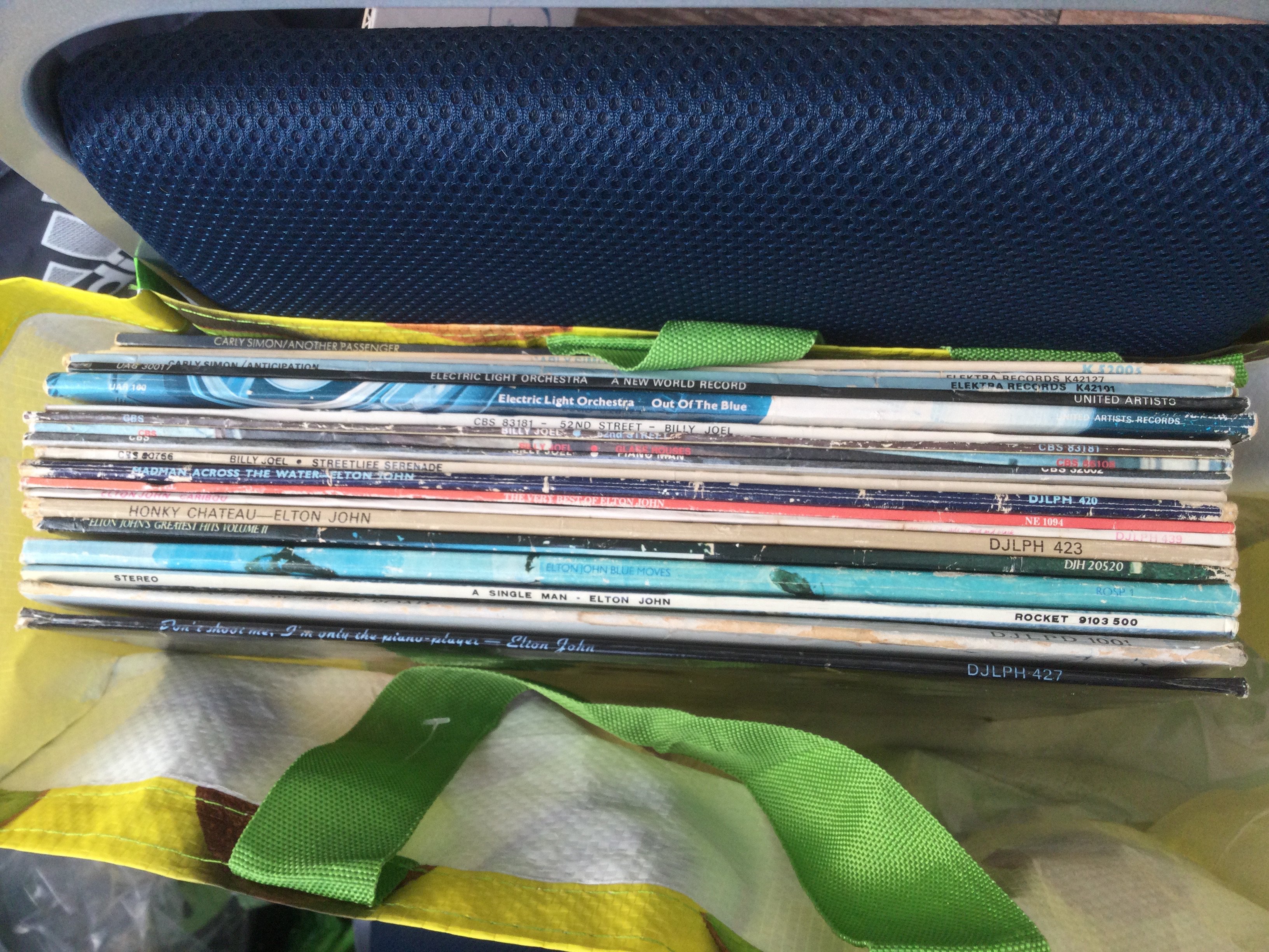 A box and a bag of LPs by various artists including Abba, Elton John, ELO and many more.