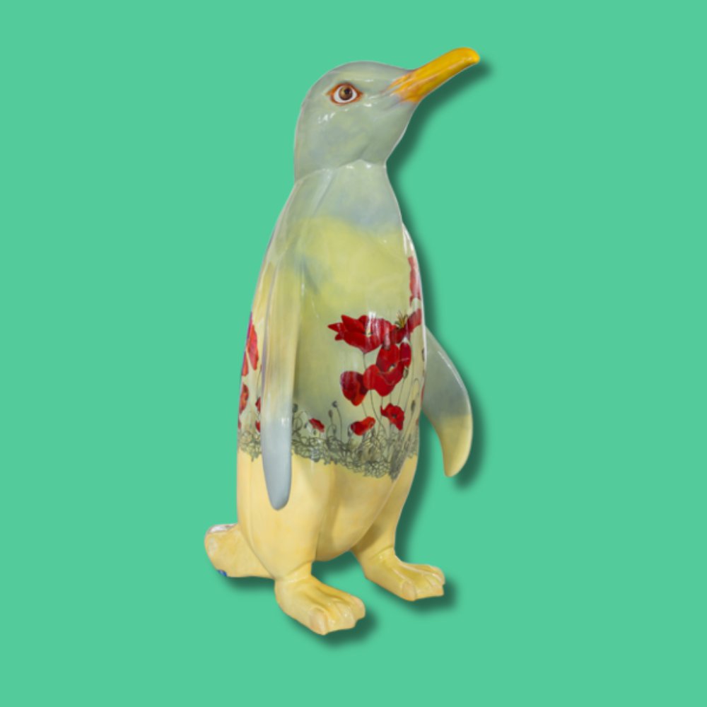 Poppy - Sponsor: S.Stibbards & Sons Ltd / Artist: Allison Allan / In 1921, poppies were adopted by the Royal British Legion as a symbol of remembrance and peace. In 2002, Plantlife conducted a "County Flowers" public survey to assign flowers to each of the counties of the United Kingdom and the common poppy was assigned as the county flower of Essex. Poppy the Penguin celebrates both these symbols. Allison constantly explores new techniques and subject matter, drawn to extremes; youth and age, brokenness and joy, light and dark. Her expressionistic oils, acrylics, inks and mixed media work reflect these contrasts in bold, evocative ways. She is a published author and exhibits with THAT Gallery in Basingstoke - Height 1600mm width 890mm Depth 1090mm weight 30kg