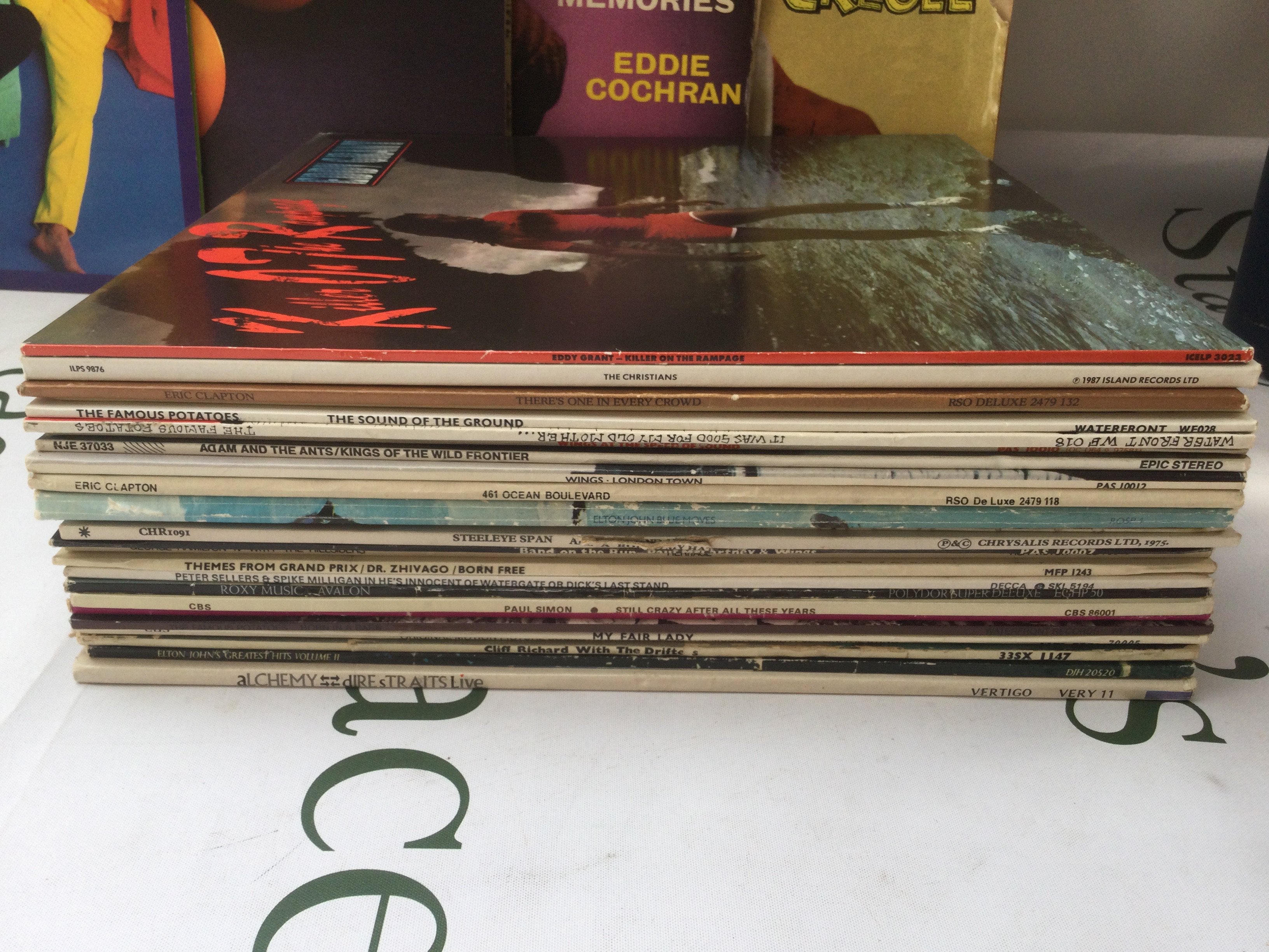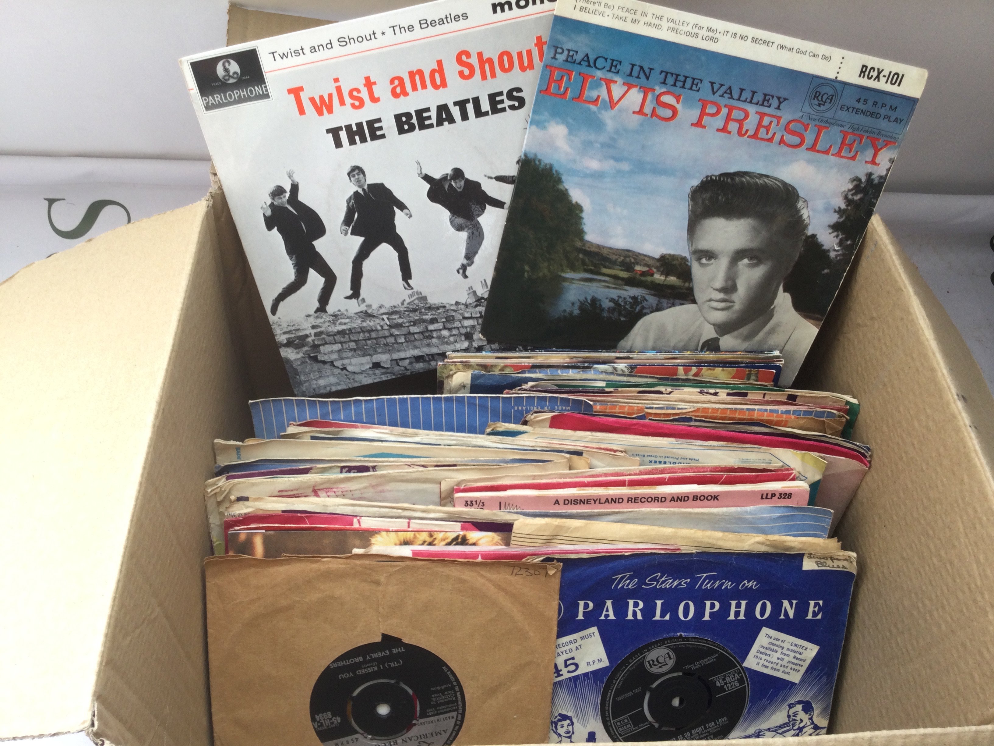 A box and bag of LPs, EPs and 7" singles by various artists including Elvis Presley, Eddie Cochran, The Beatles and many more.