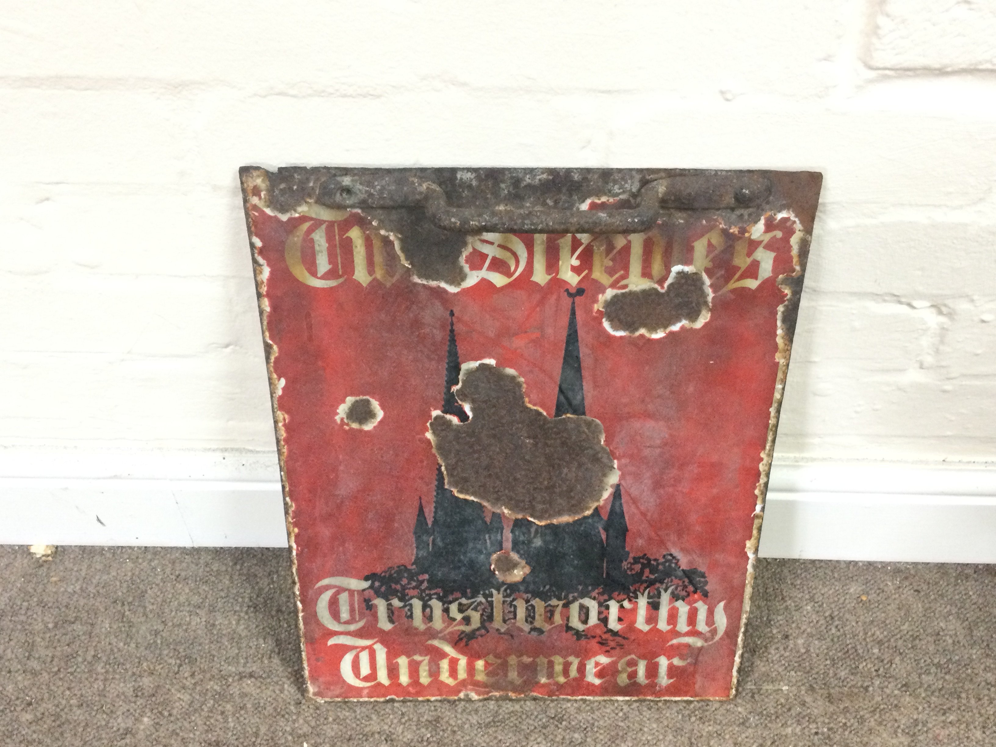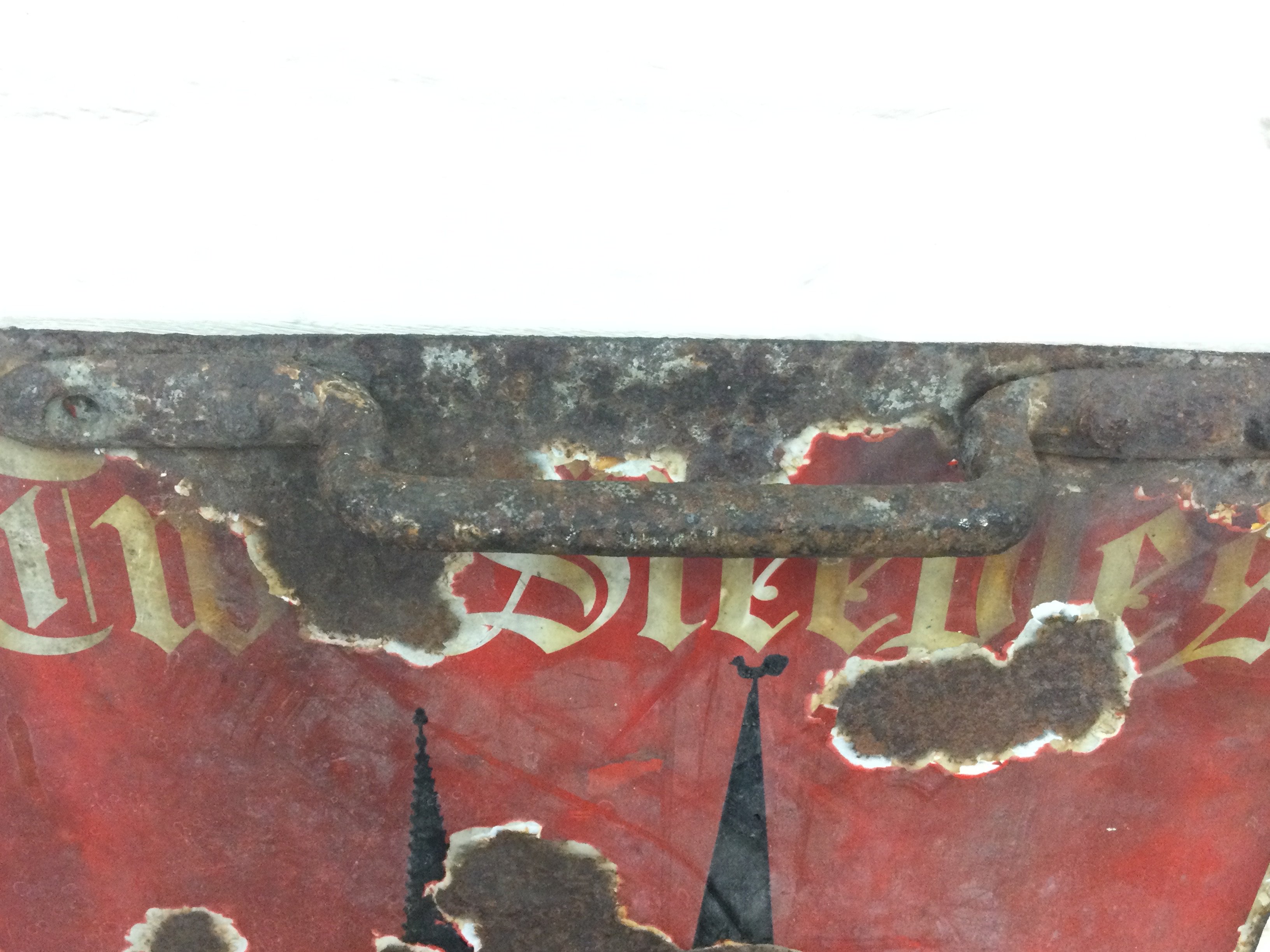 TWO STEEPLES VINTAGE ENAMEL SIGN DOUBLE SIDED WITH HANDLE. 13 x 17 inches