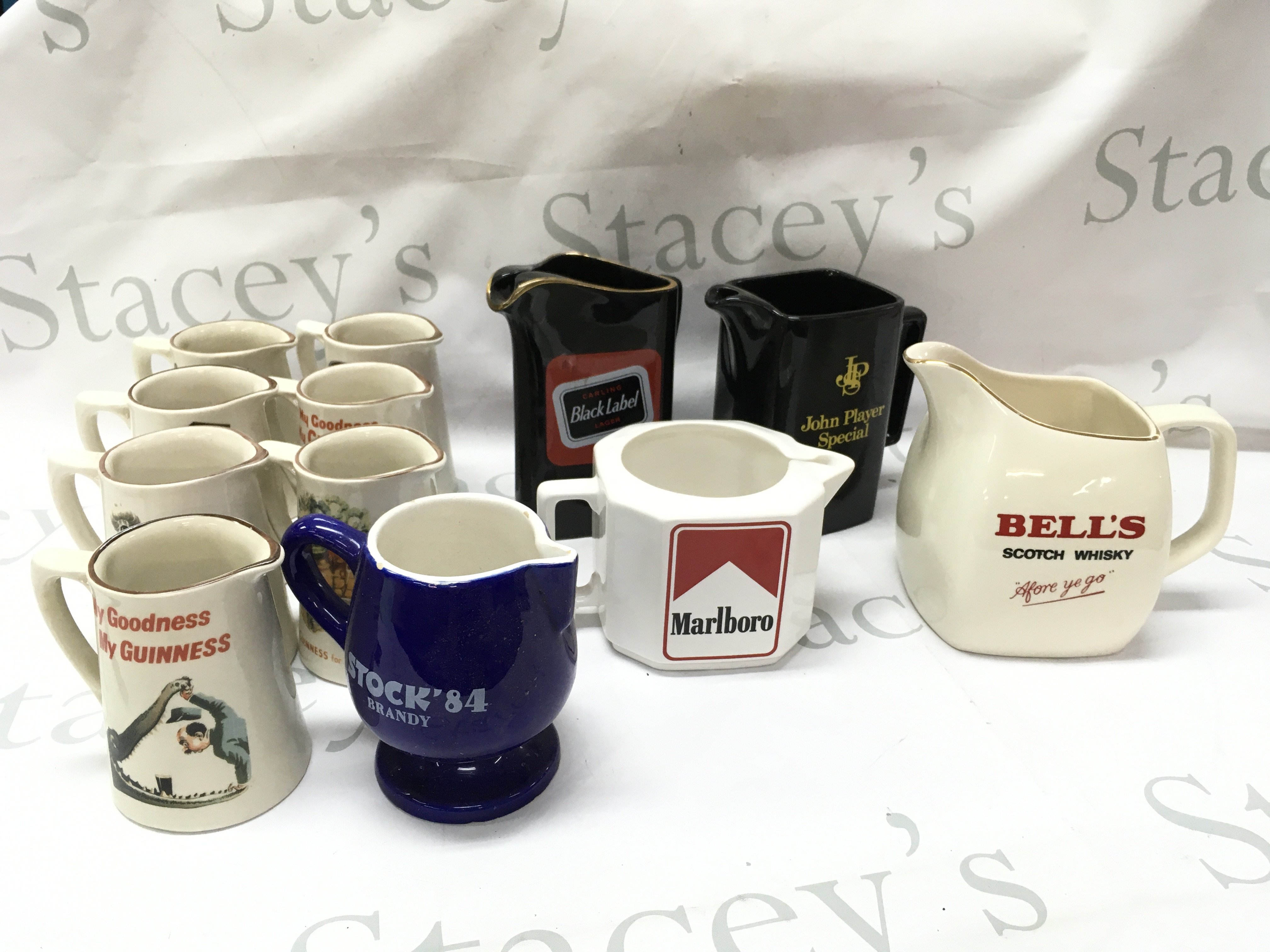 A collection of ceramic bar advertising jugs including Guinness , Marlboro, Stock 84 brandy, Bells Scotch, John Player . This lot cannot be posted