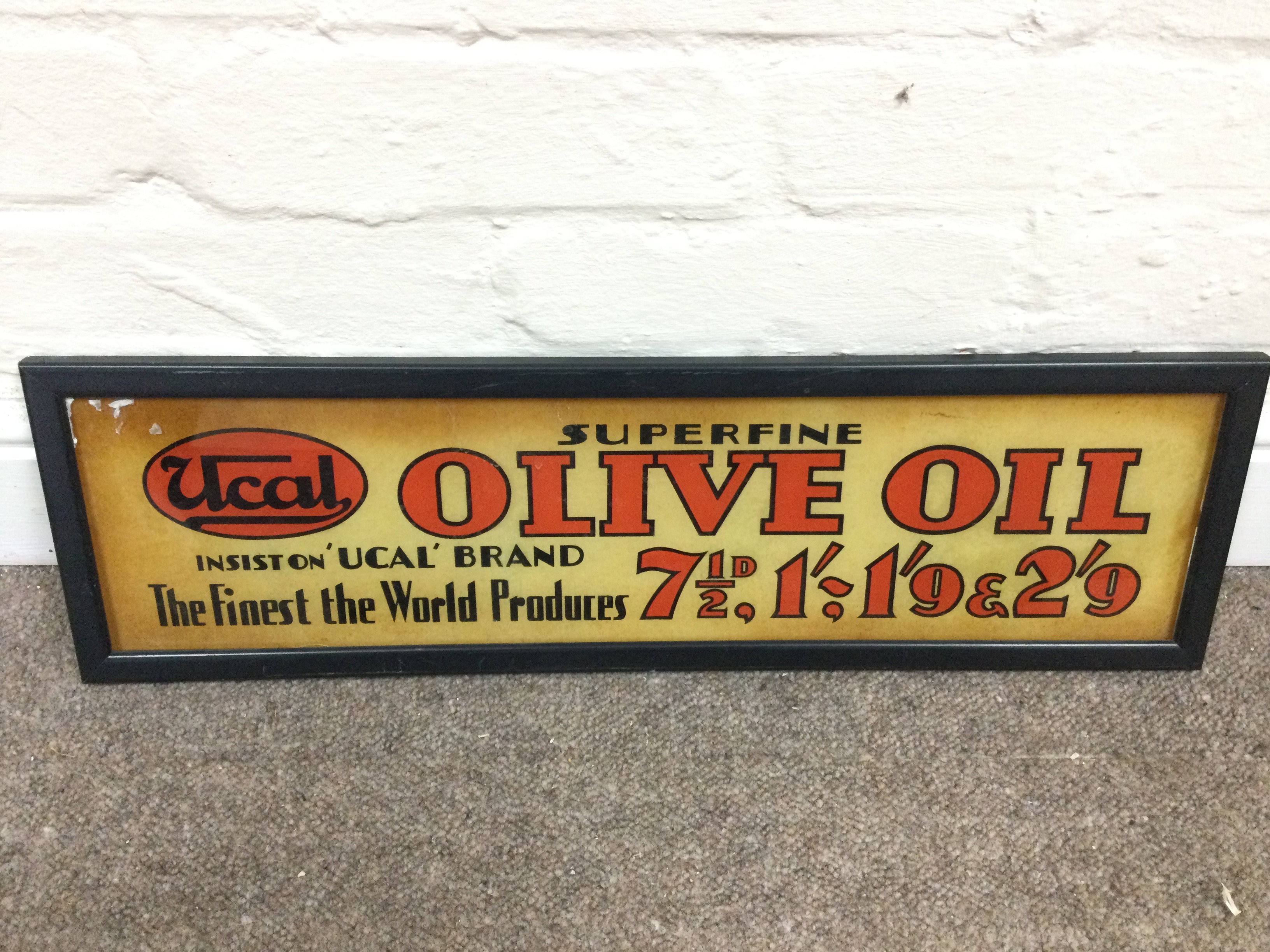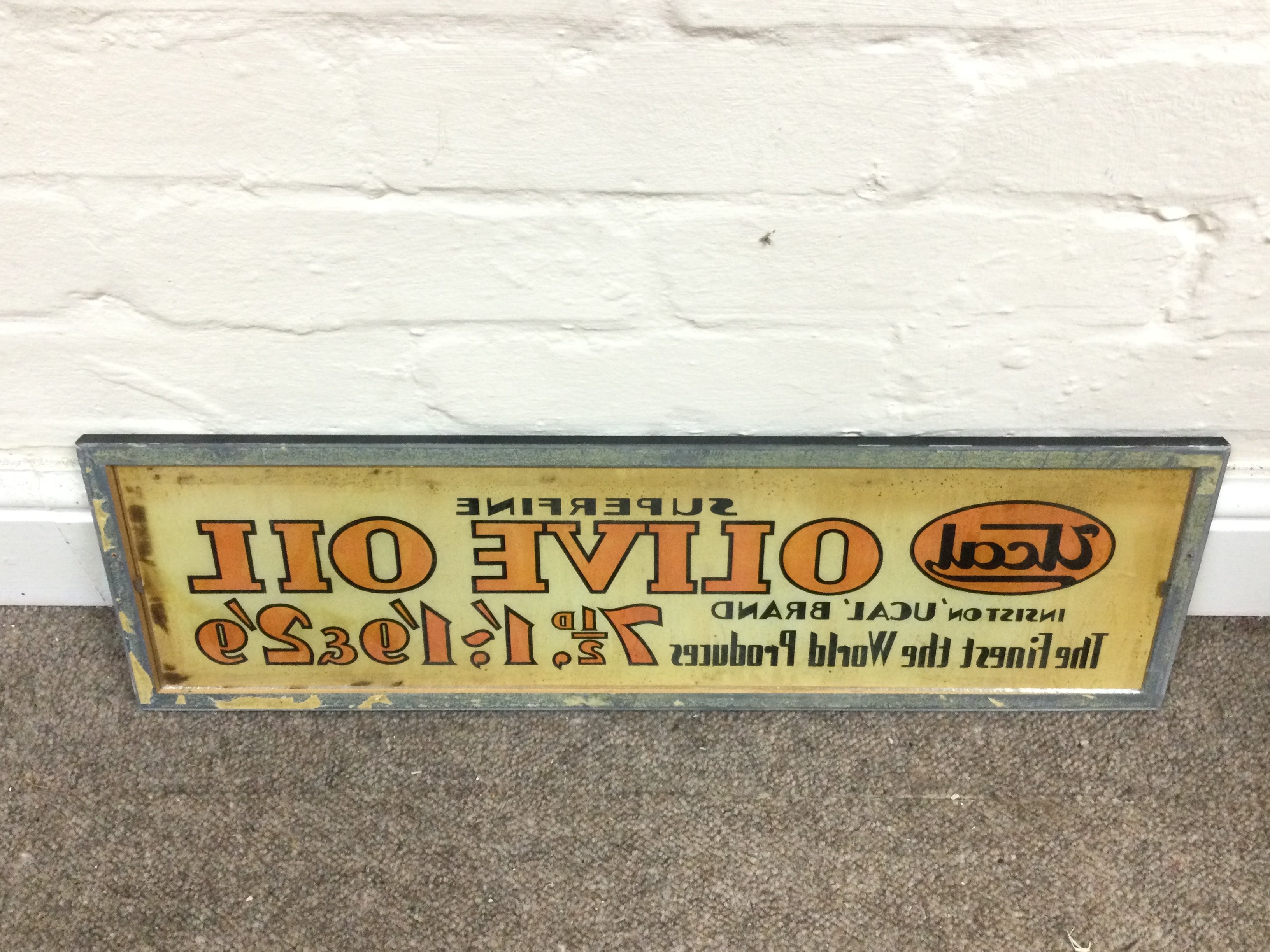 A Ucal 'Superfine Olive Oil' glass advertising sign 22 x 7 inches approximately