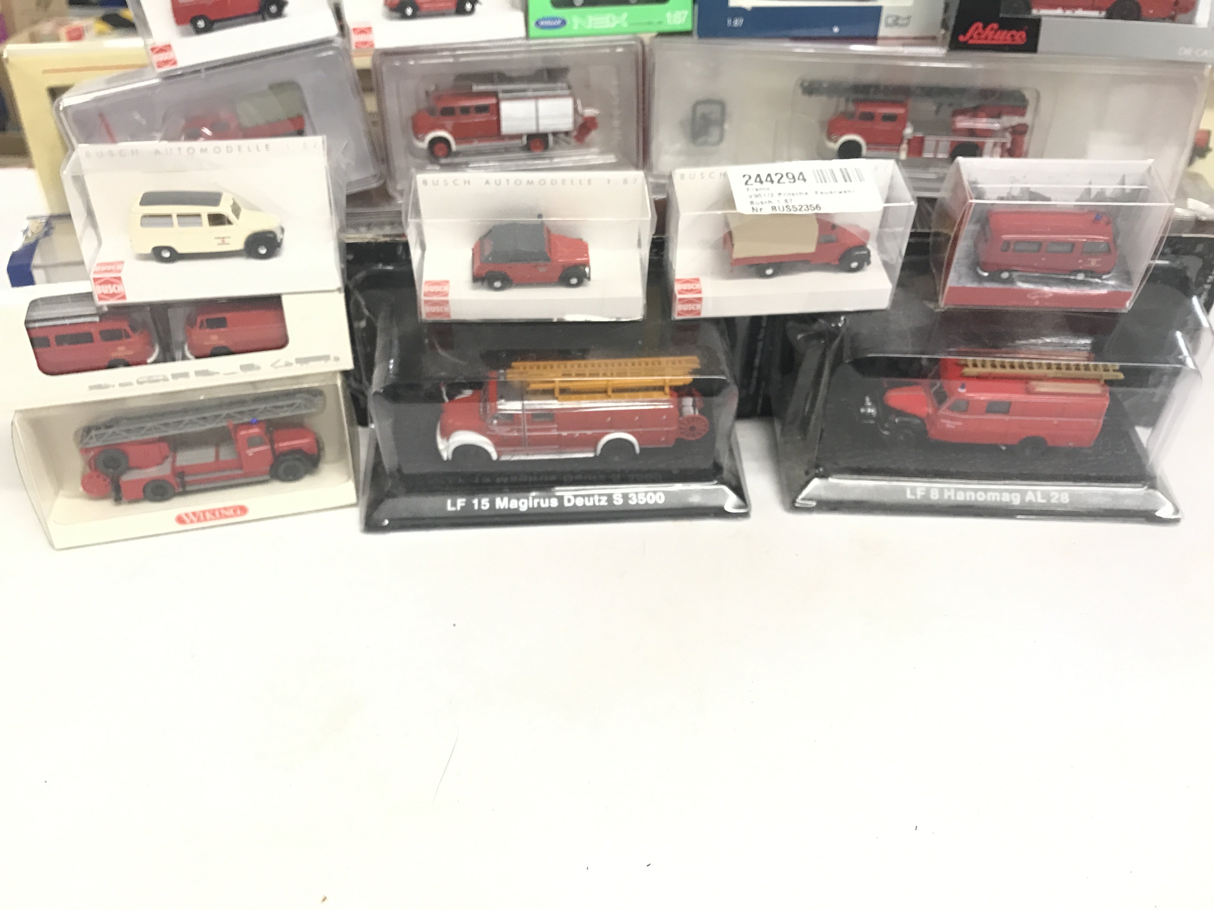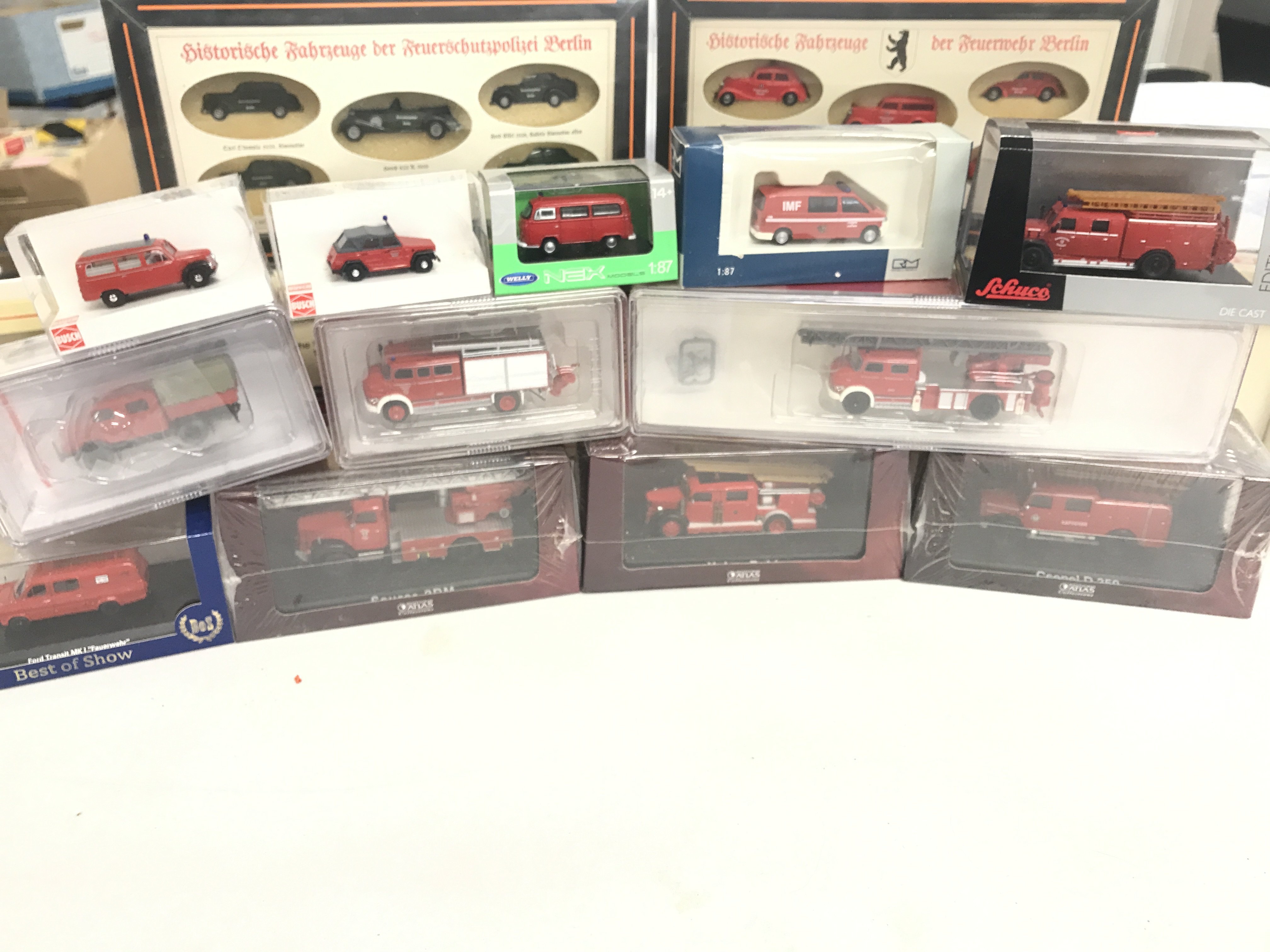 A box containing a collection of model fire engines.