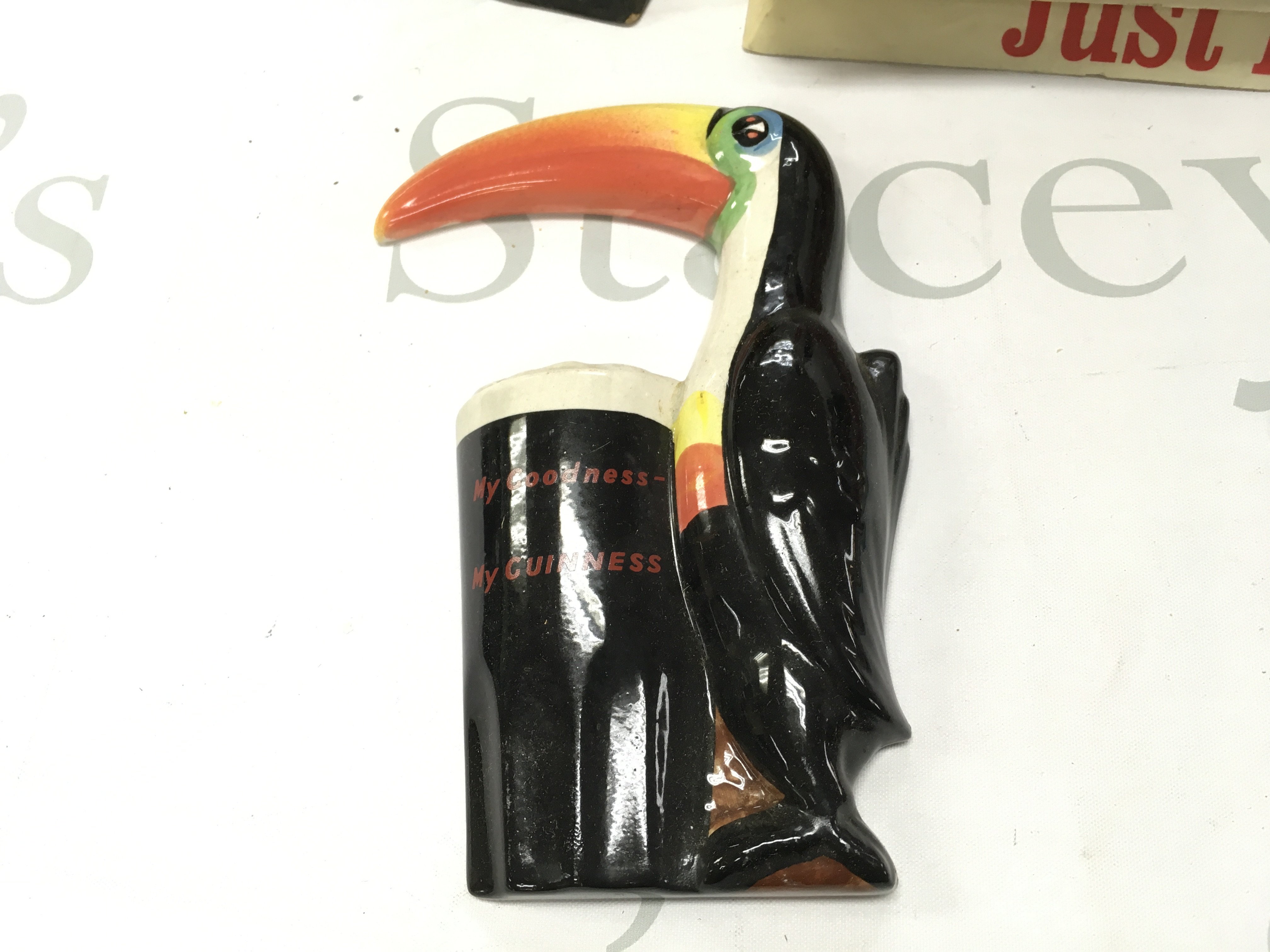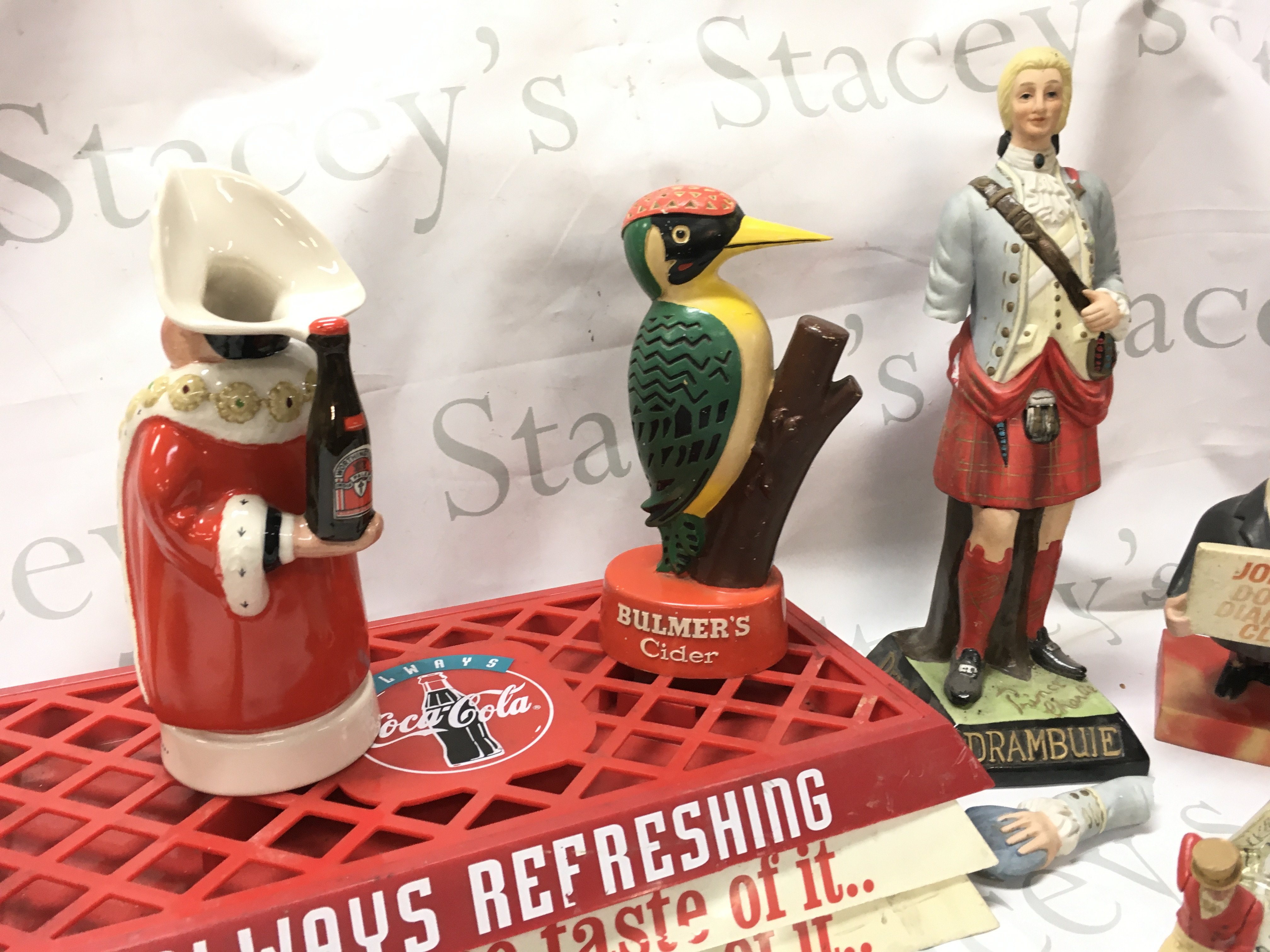 Pub advertising figures including Worthingtons behind every great man Beswick porcelain figure, a Youngers Tartan beer, Bulmers cider, Drambuie, porcelain Guinness toucan wall plaque by Carltonware. ( damaged) , Coca Cola tray etc . Also including a box of other merchandise including a Players cigarettes dish, Britivic dish etc .This lot cannot be posted