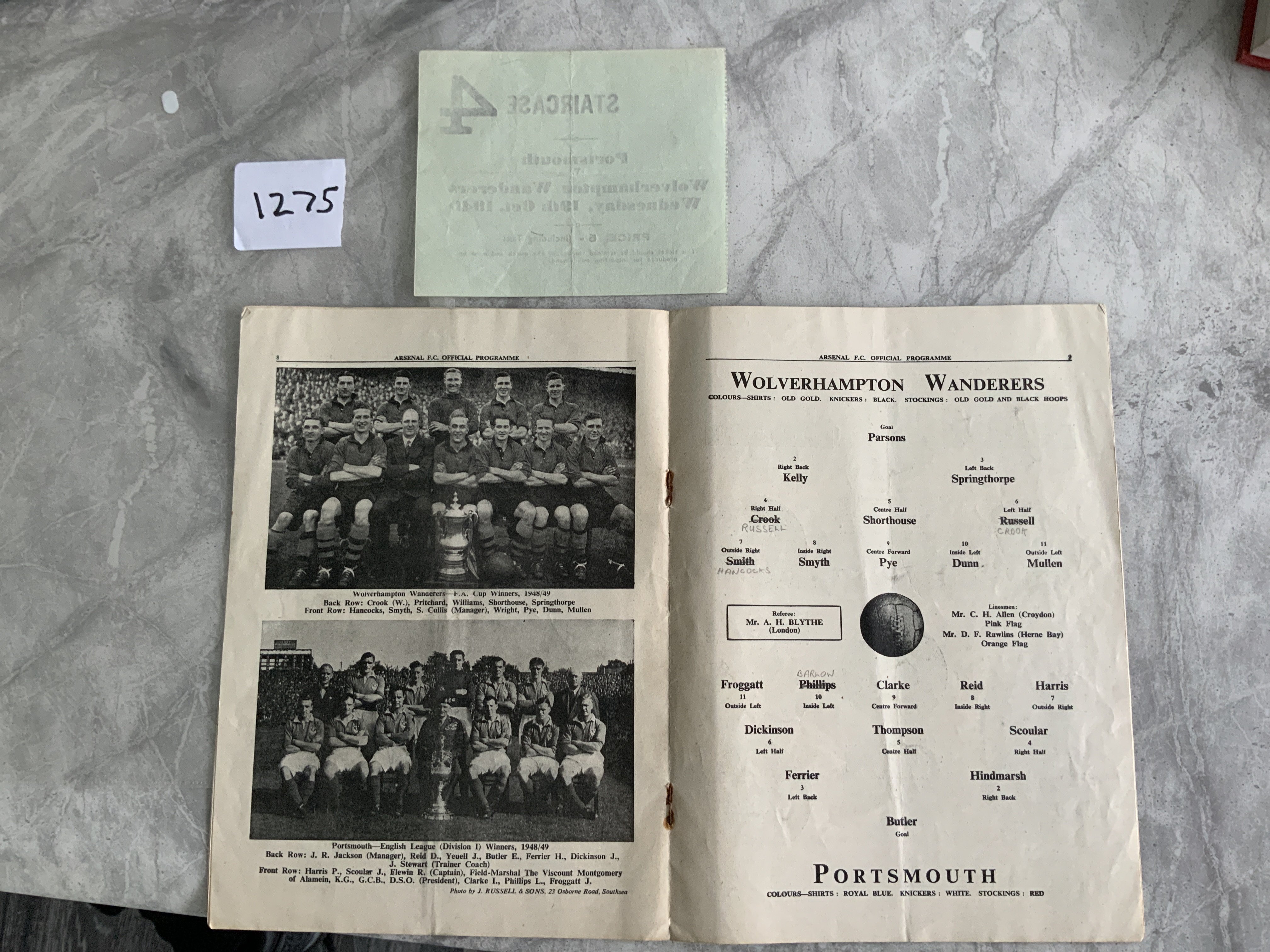 1949 Charity Shield Football Programme + Ticket: Portsmouth v Wolves played at Arsenal. Both very good with pencilled team changes to programme. Light folding. (2)