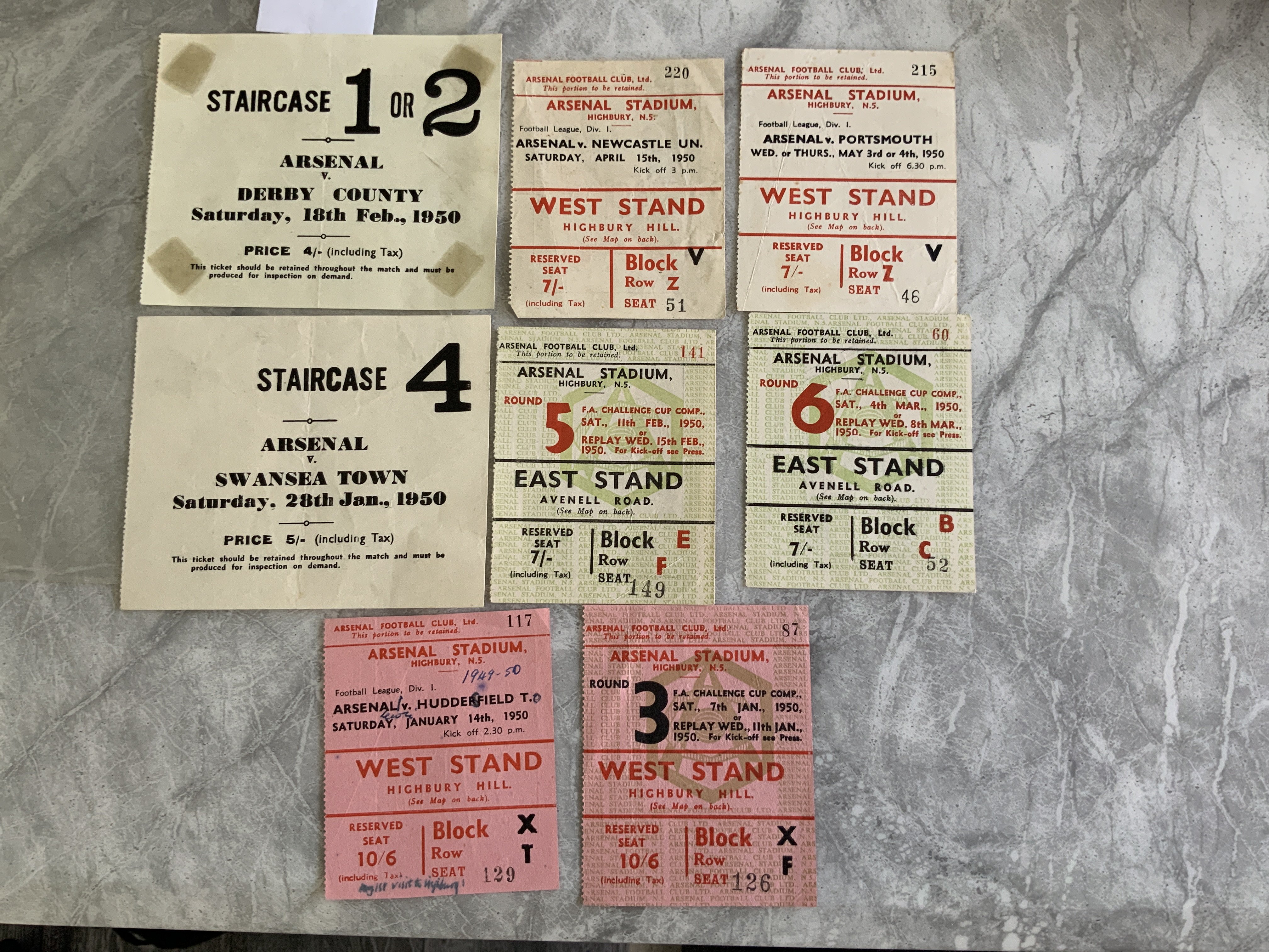 49/50 Arsenal Home Football Tickets: 20 different tickets which are mainly league matches but include all 4 tickets in the FA Cup winning season. Excellent condition with both the smaller seat tickets and the larger standing tickets. Sunderland has a piece missing and Derby has been previously stuck down. Very rare chance. No duplication. (20)
