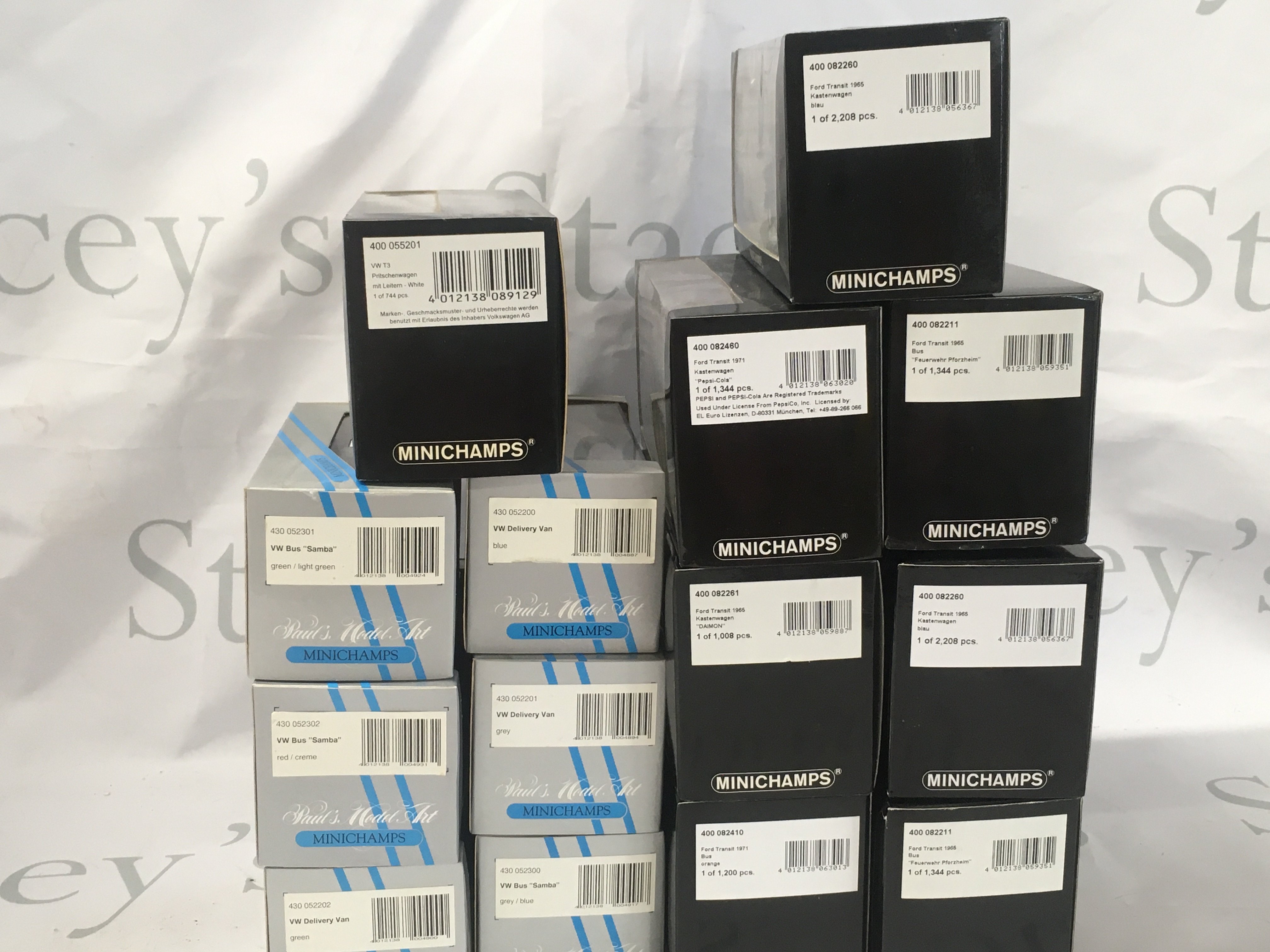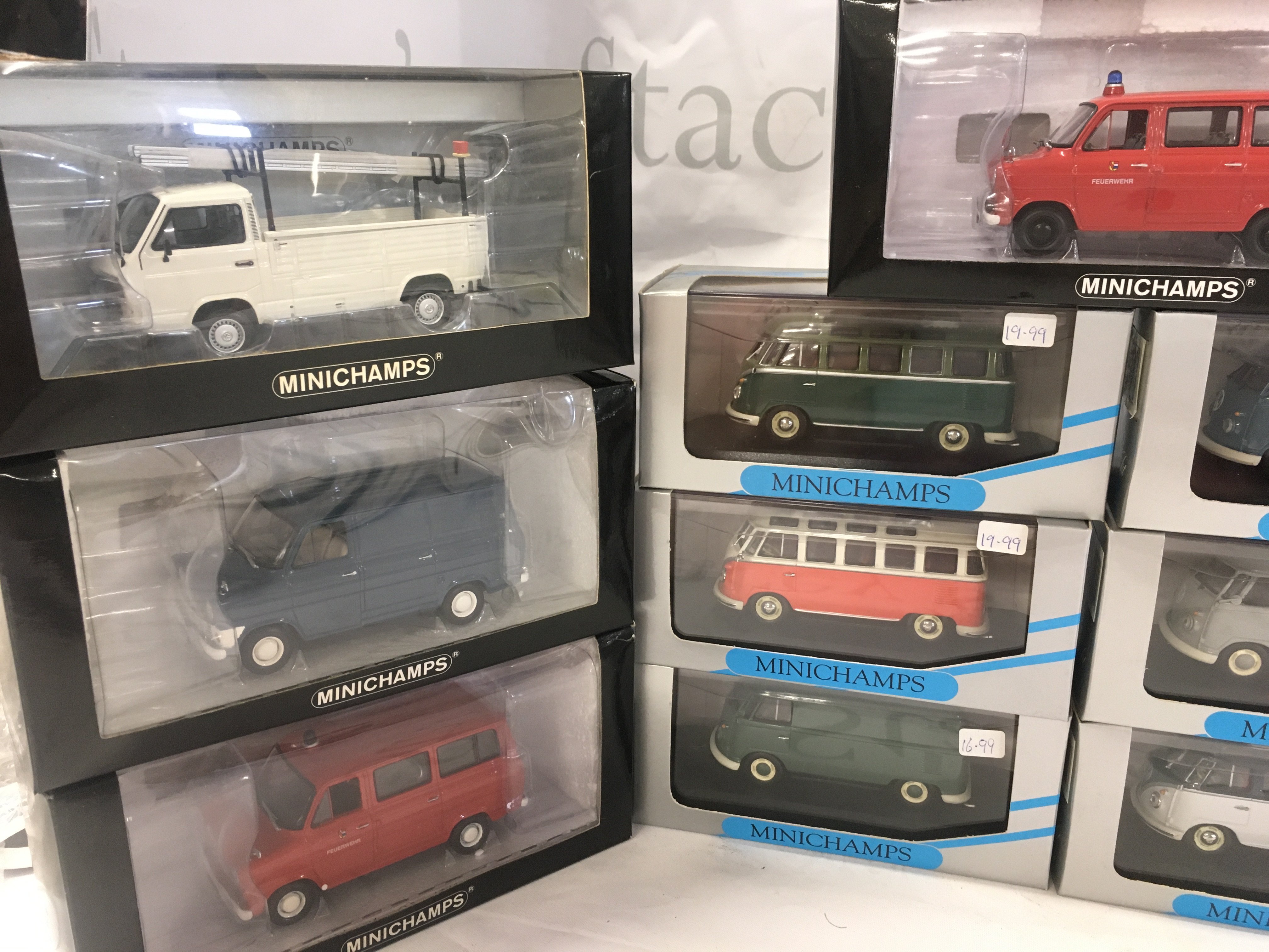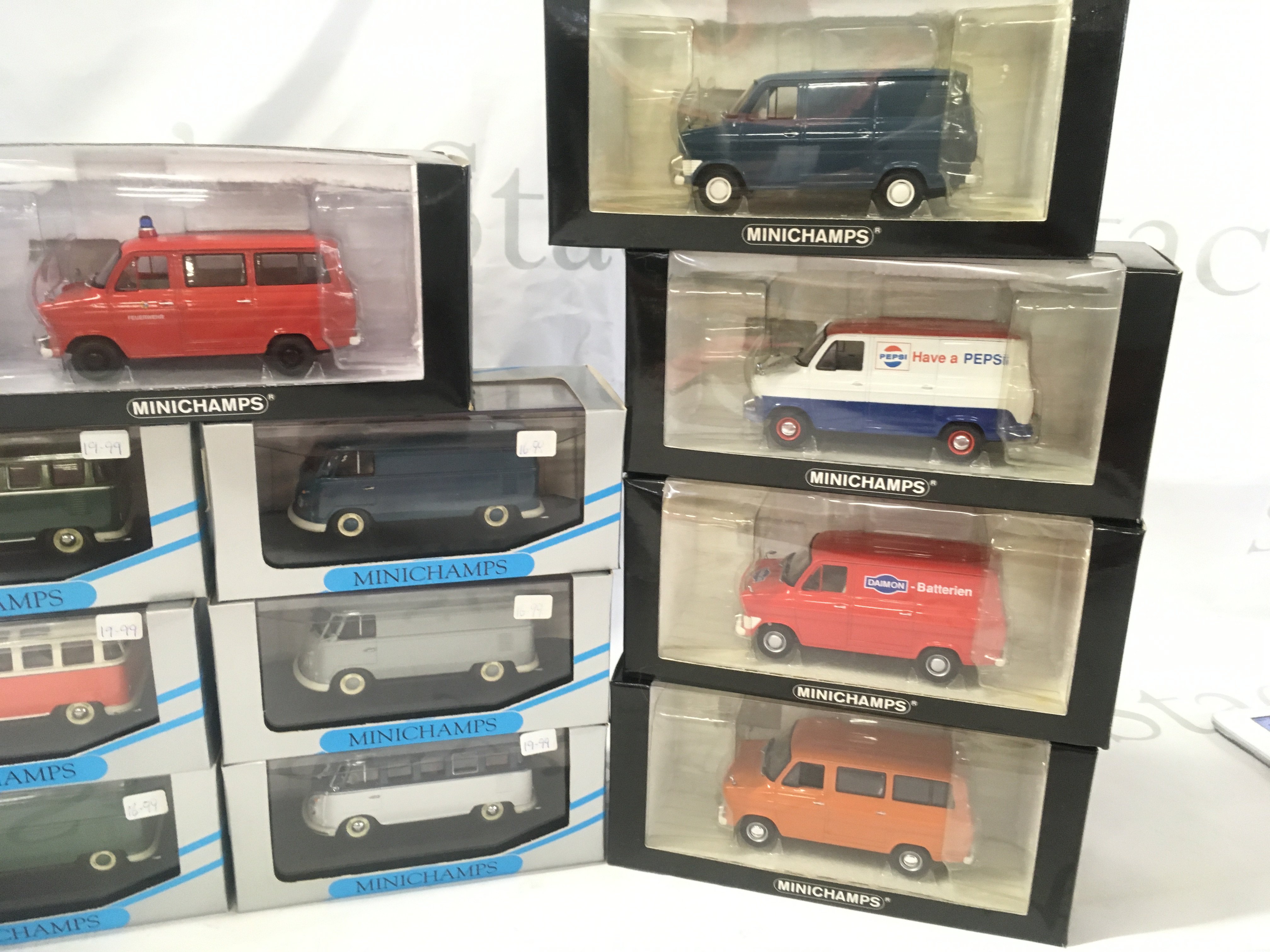 A collection of boxed diecast model vehicles comprising Ford Transit vans and Volkswagen camper vans and truck. No reserve