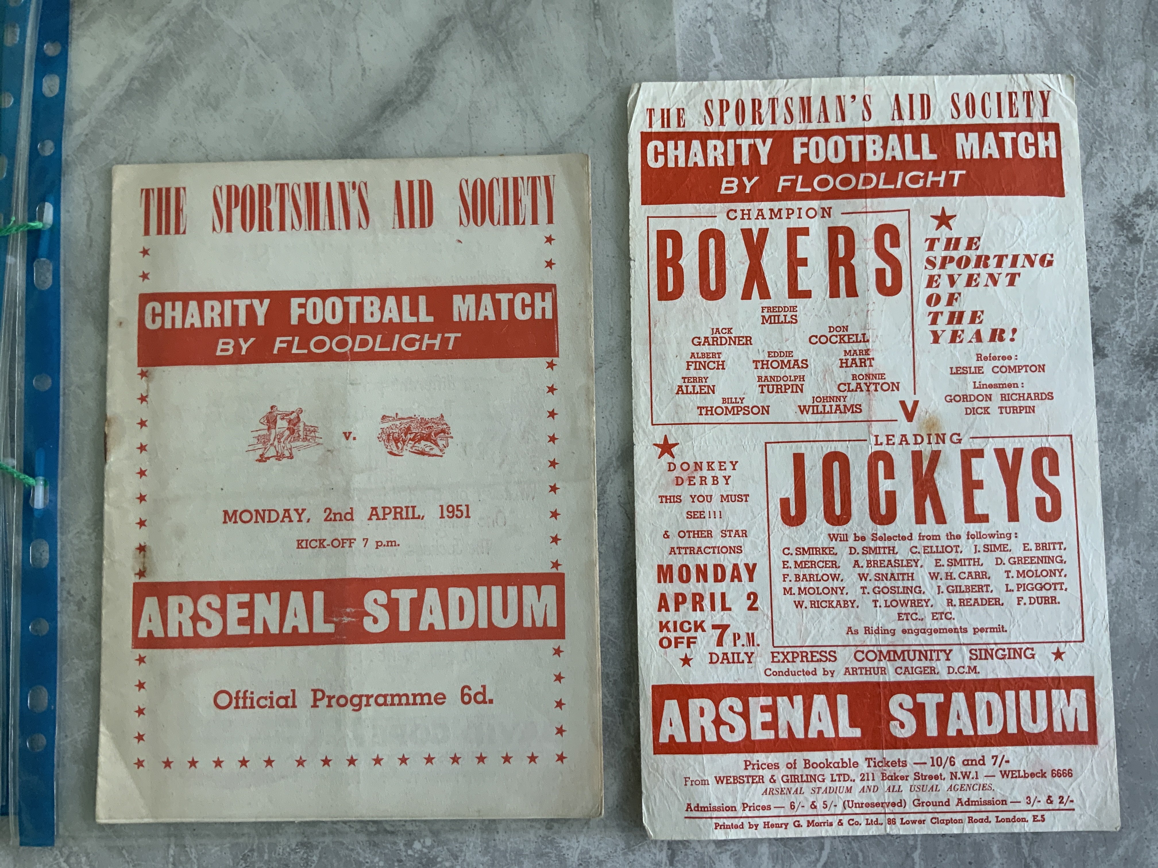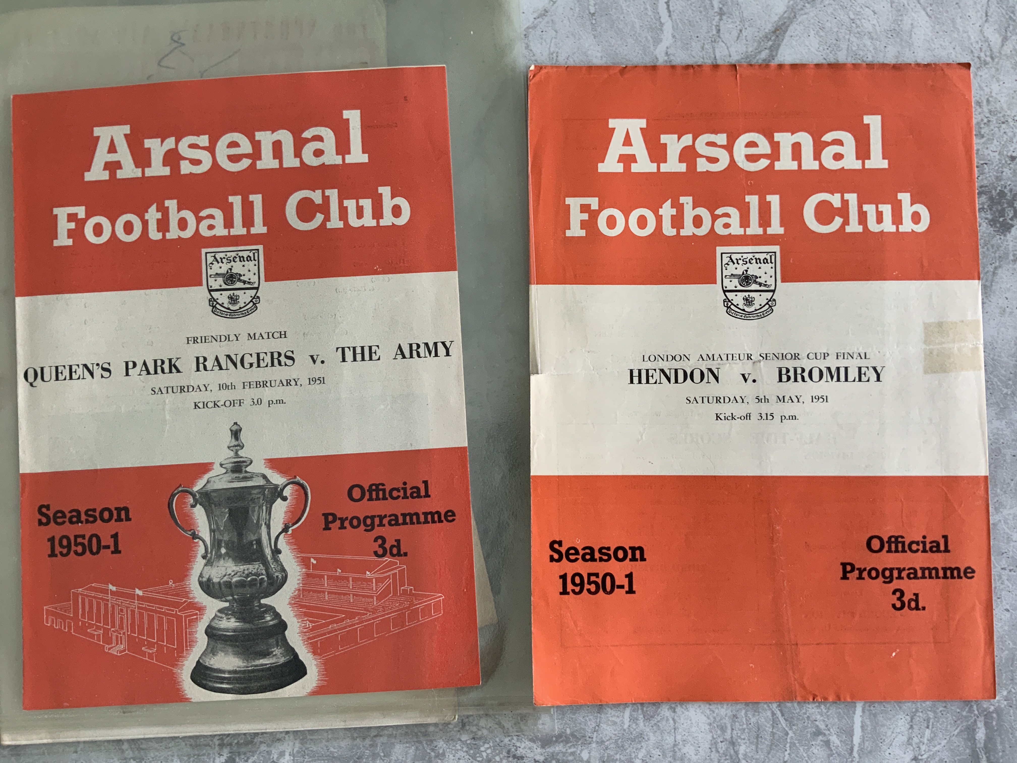 50/51 Football Programmes Played At Arsenal: FA X1 v The Army, QPR v The Army, Hendon v Bromley London Amateur Senior Cup Final, Met Police v Paris Police, Stoke Newington v Hackney Youth, Boxers v Jockeys including advertising poster. Good. (7)