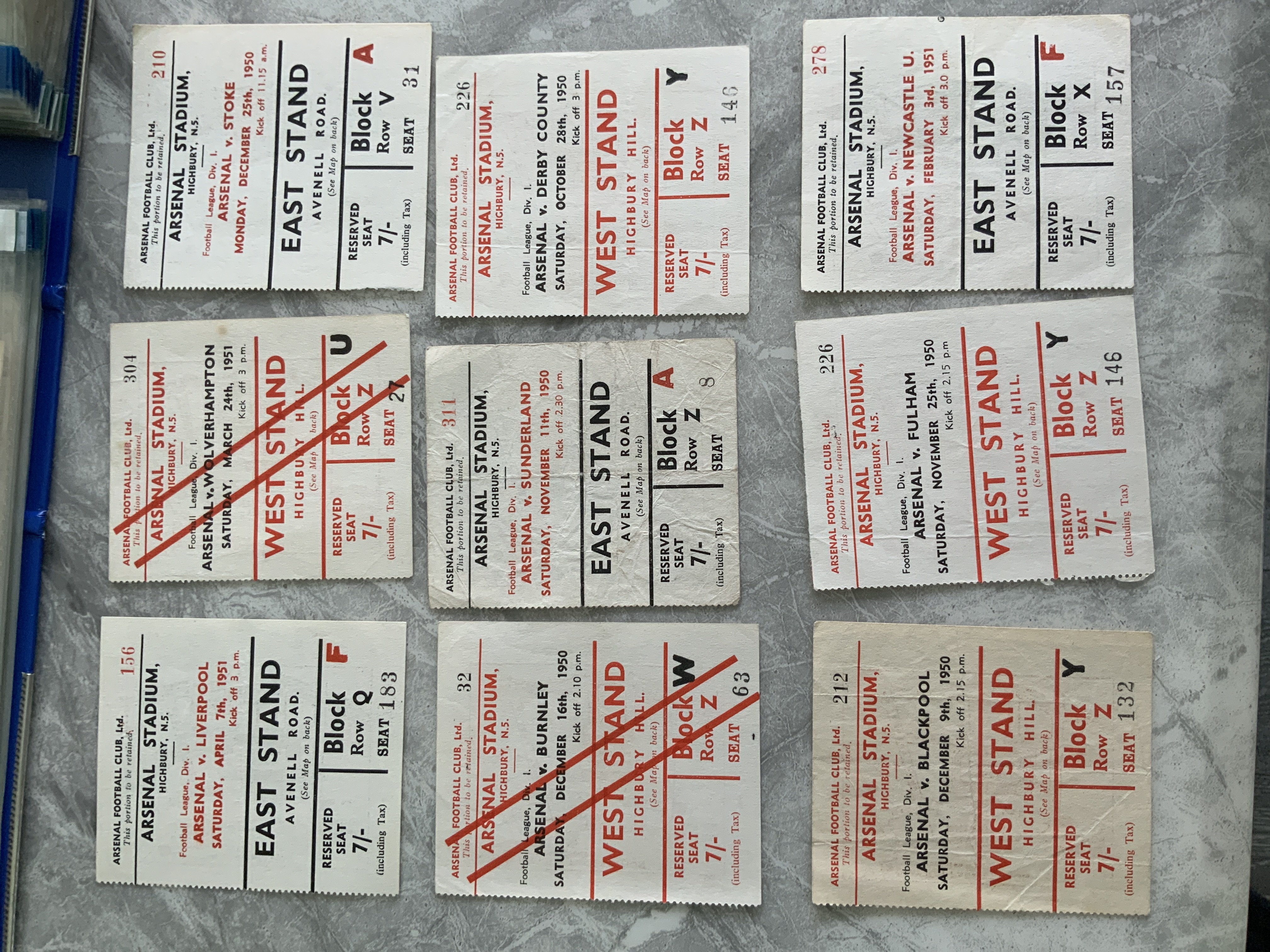 50/51 Arsenal Home Football Tickets: 20 different good condition tickets which are league and FA Cup matches. Excellent condition with both the smaller seat tickets and the larger standing tickets. Very rare chance. No duplication. (18)