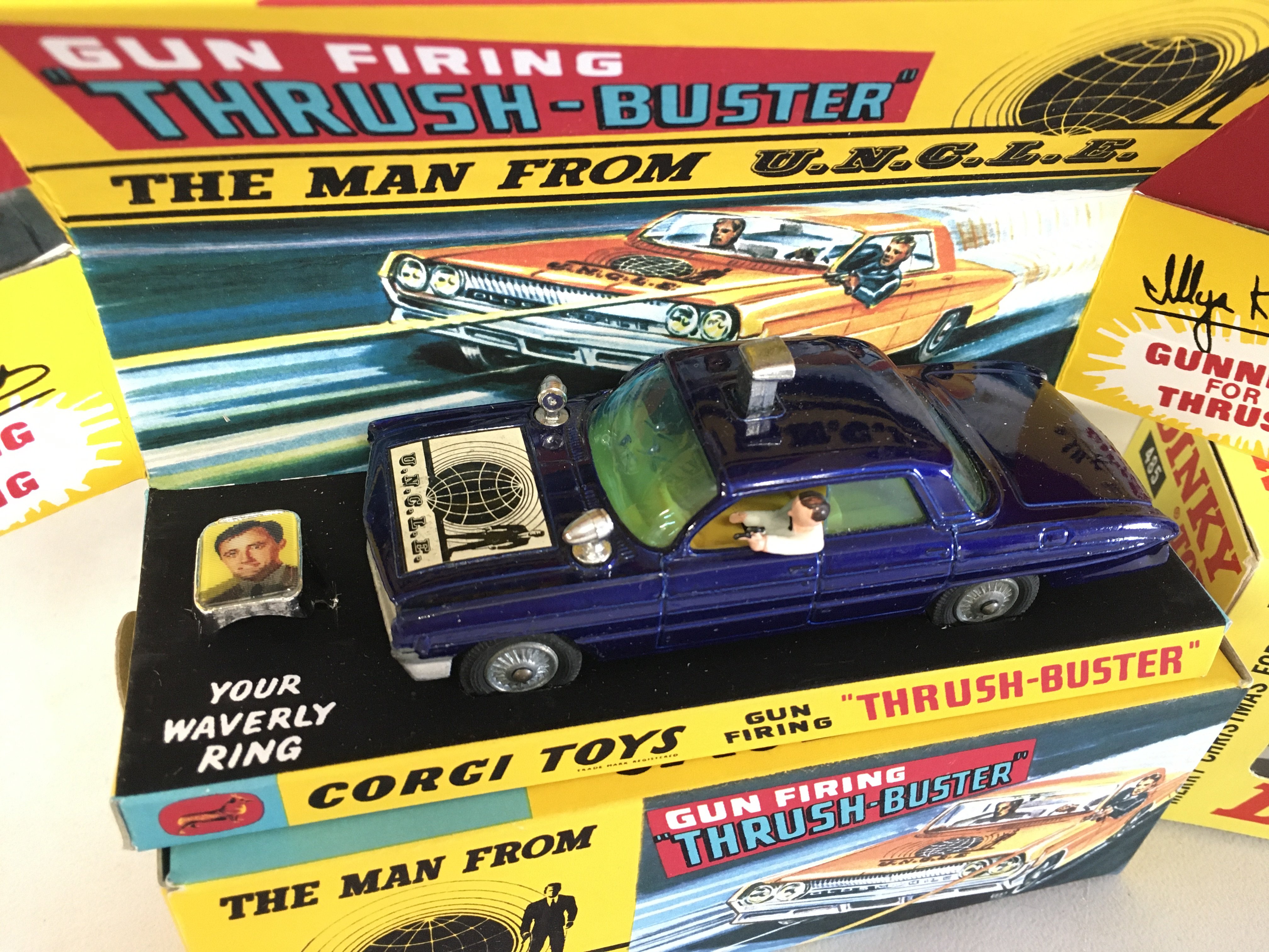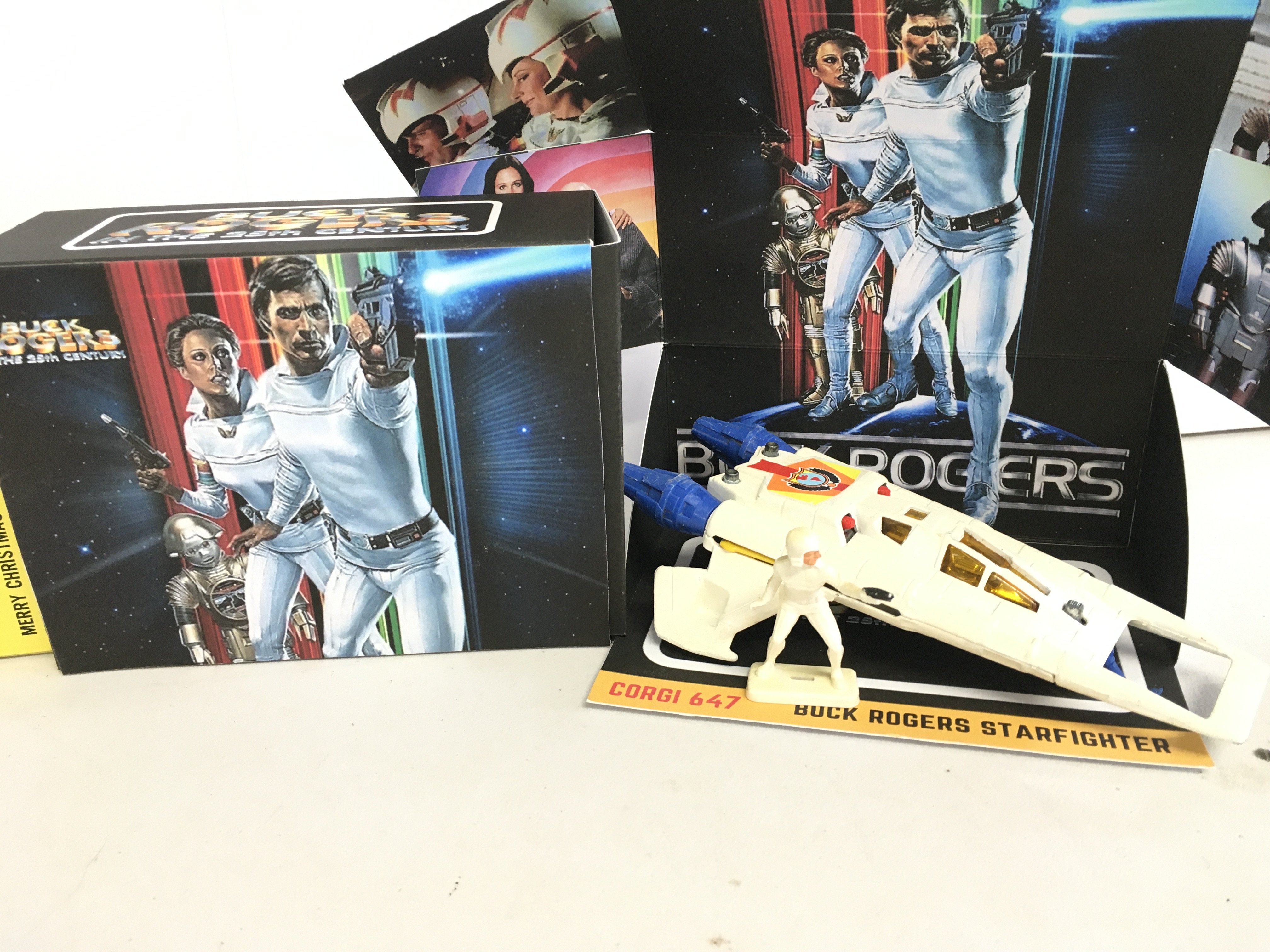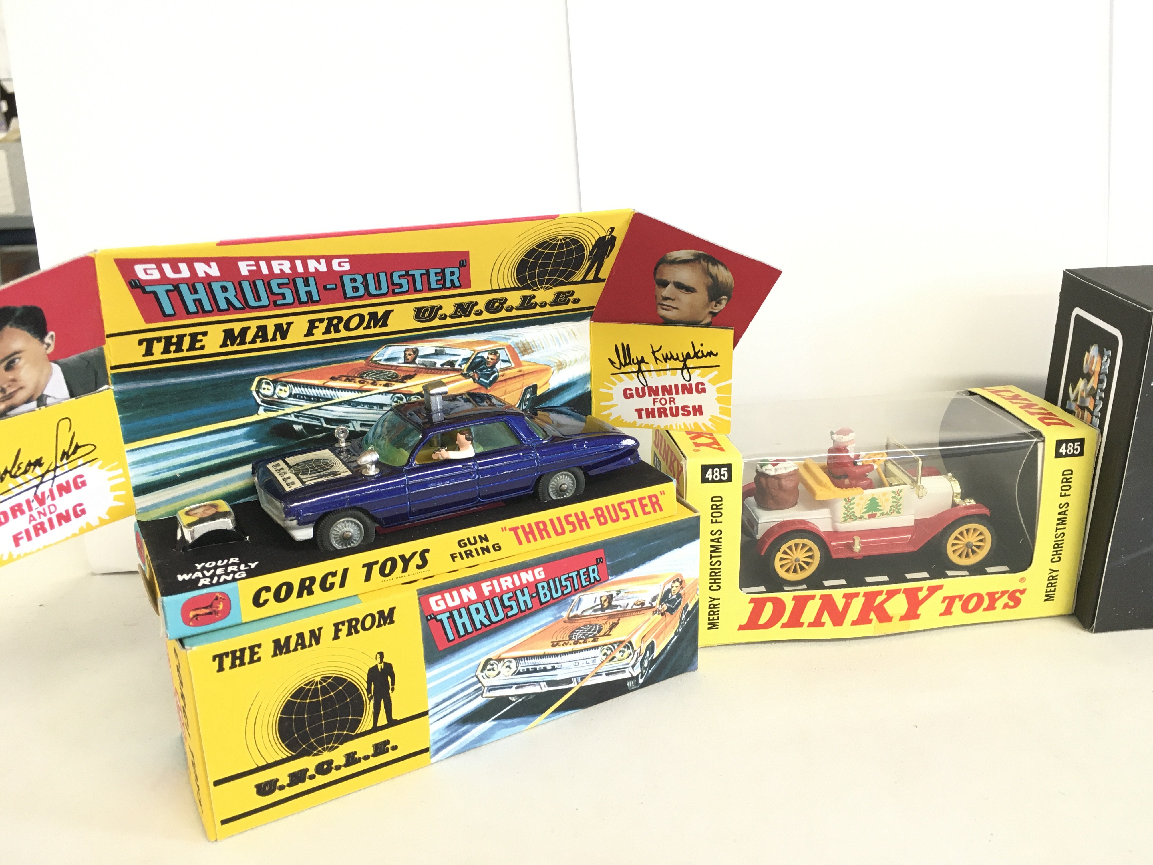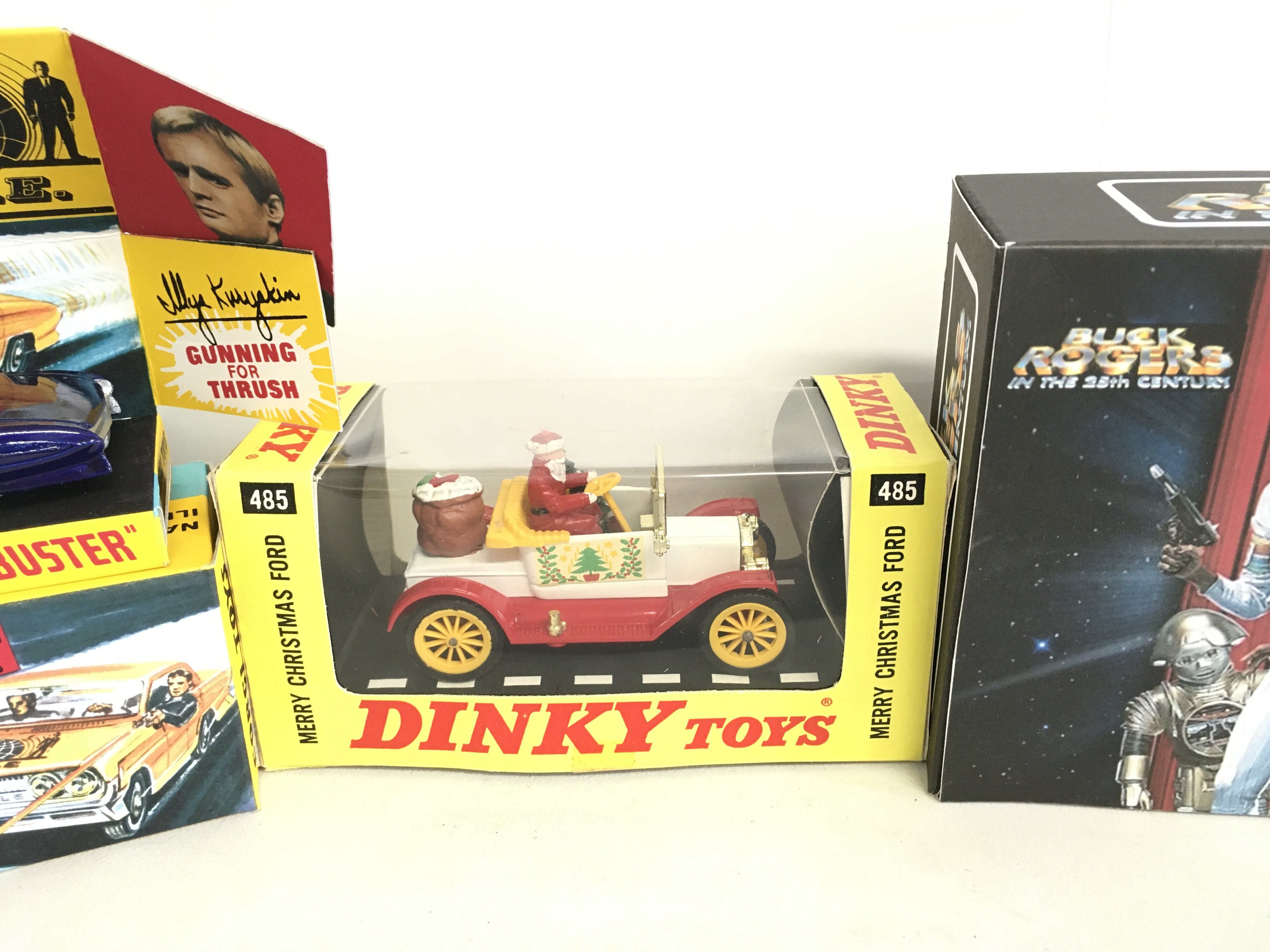A Corgi Thrush Buster #497. A Dinky Merry Christmas Ford And A Corgi Buck Rogers Star Fighter With Figure In Repro Boxes.