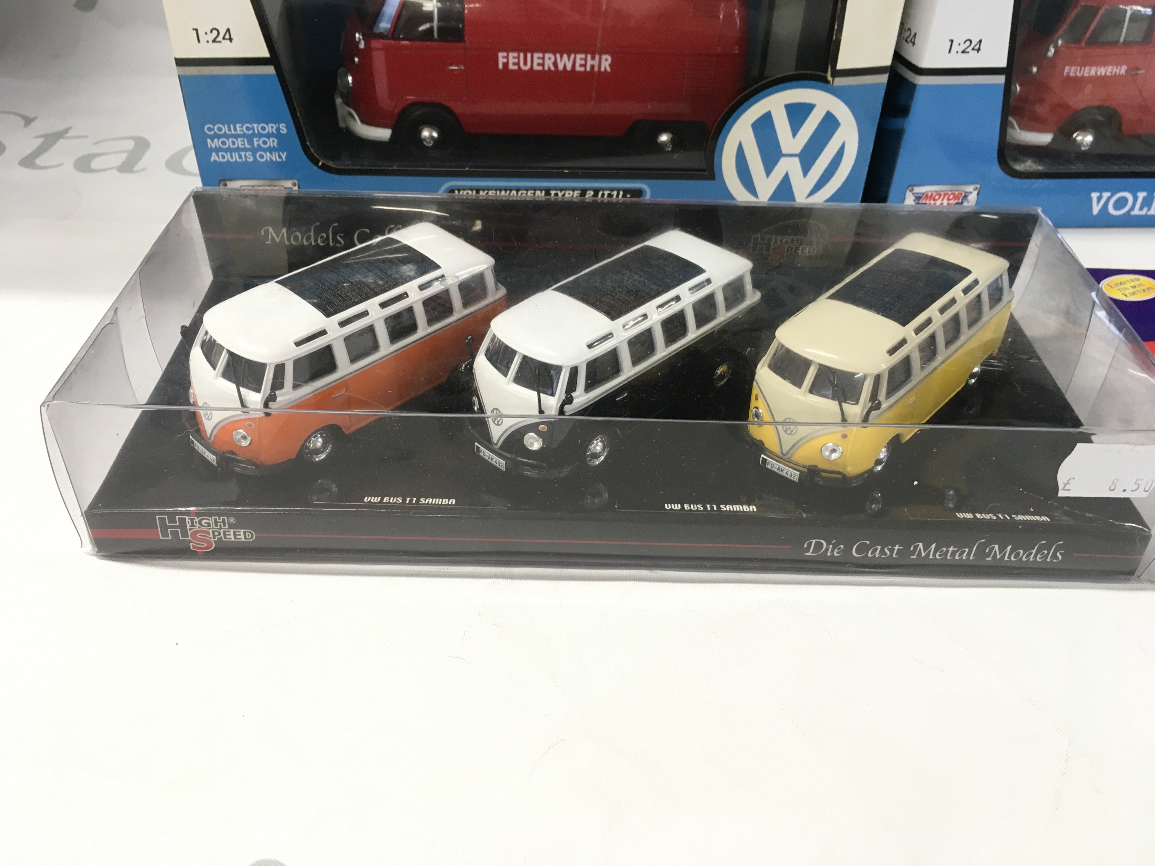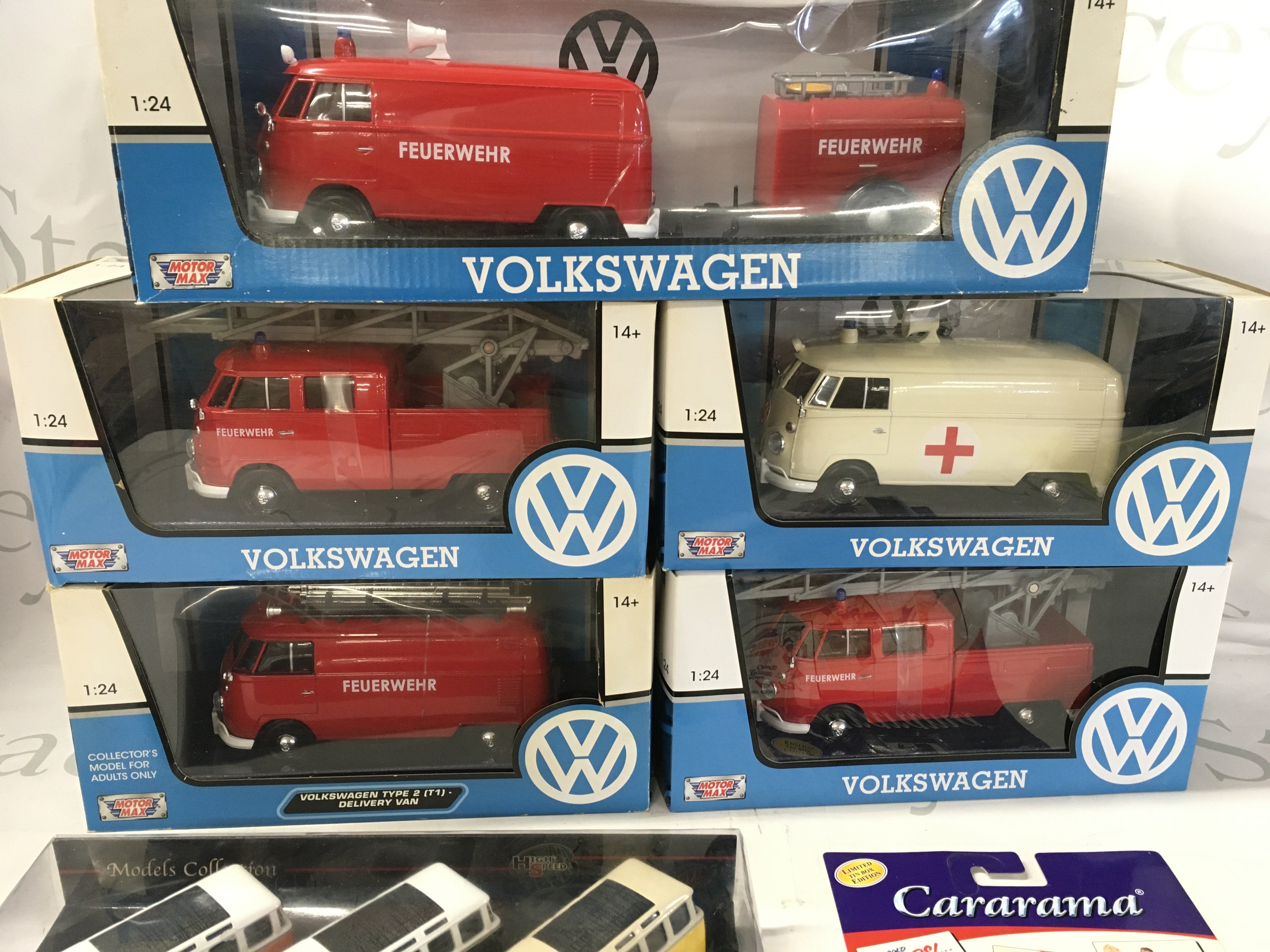 A collection of boxed model diecast Volkswagen vehicles including some emergency service vehicles. No reserve.