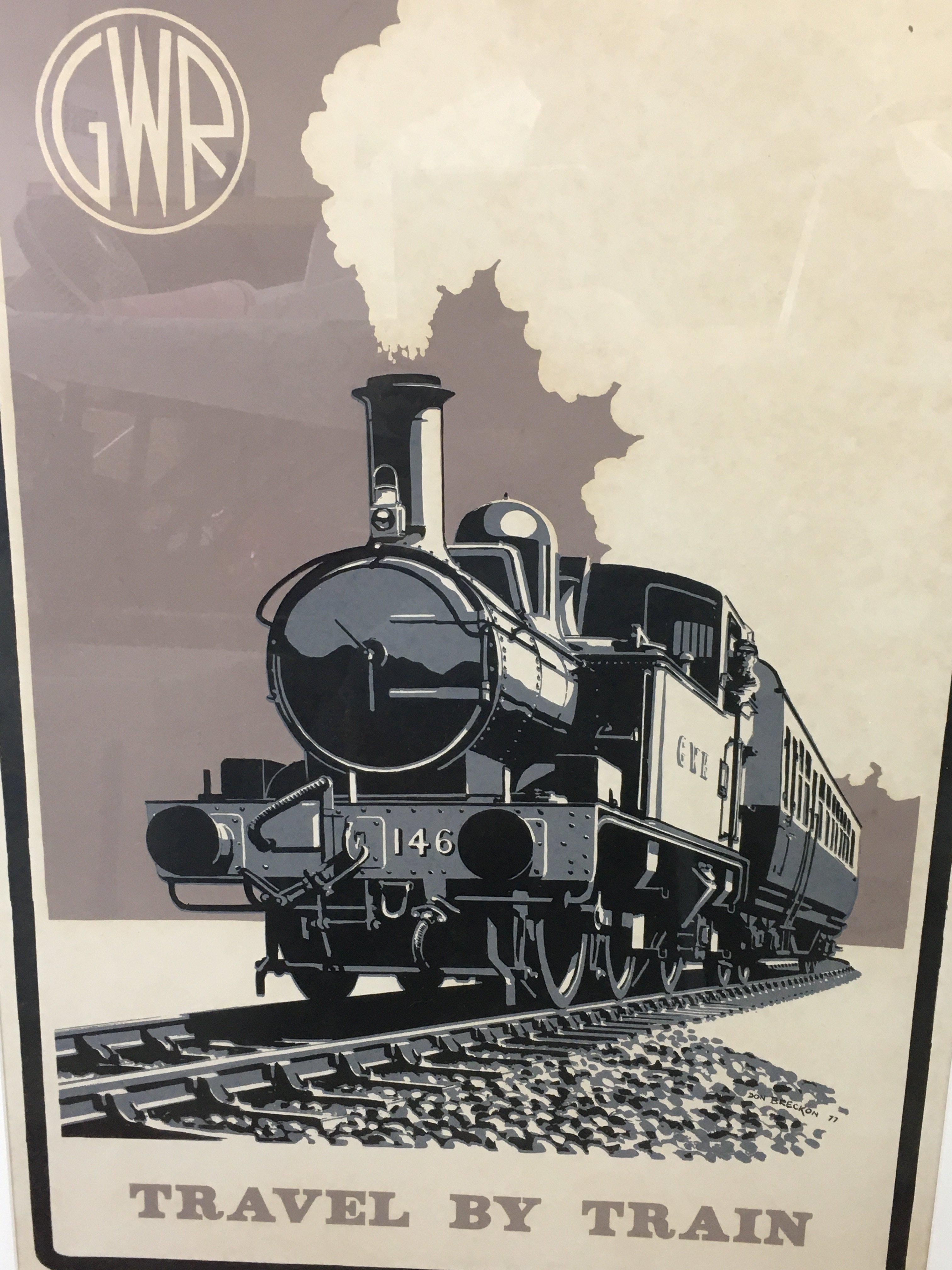 A framed vintage GWR Station room poster signed Don Breckon, Travel by Train. Frame Dimensions 59x84cm
