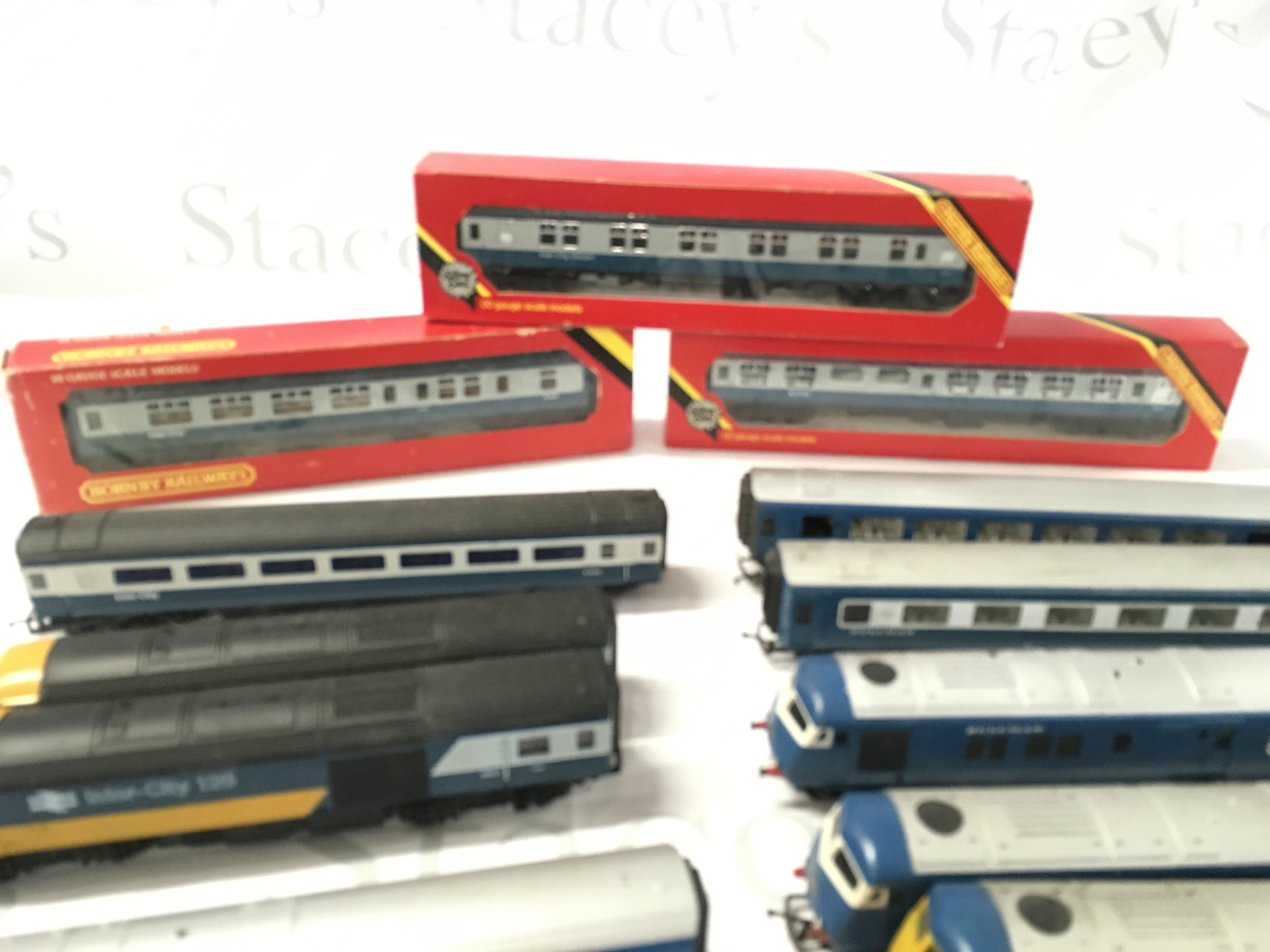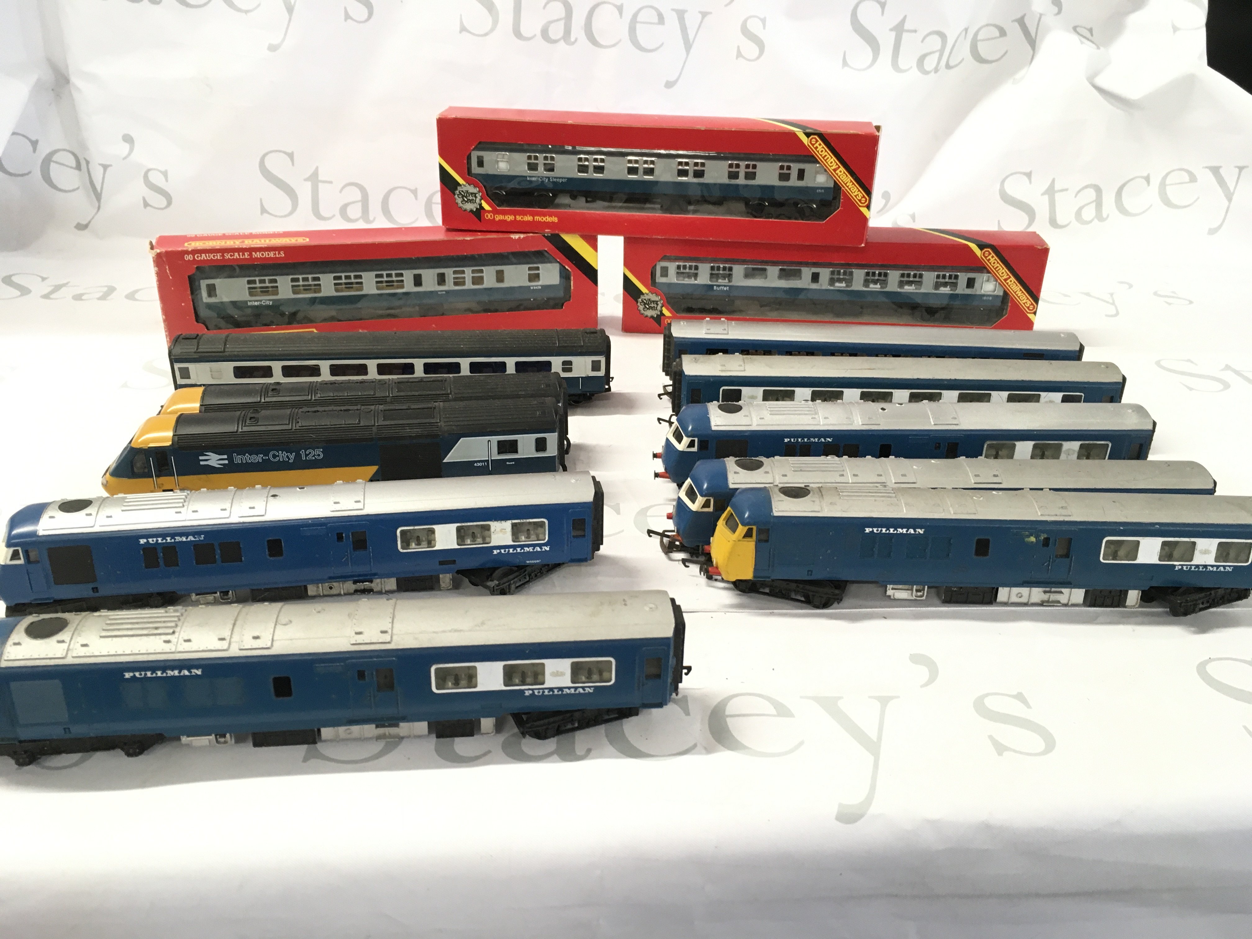 A collection of 00 gauge model railway coaches and 2 locomotives by Triang and Hornby. No reserve.