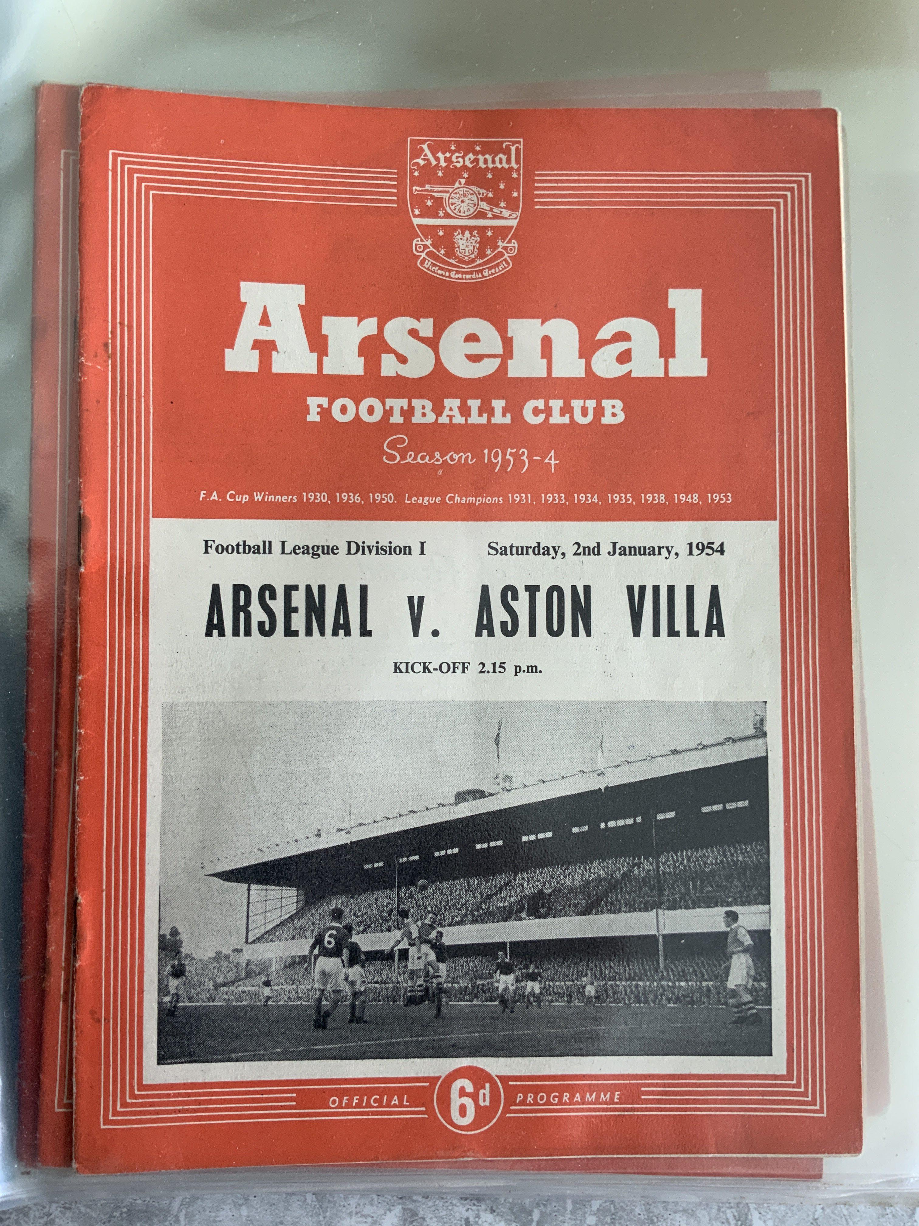 53/54 Arsenal Complete 1st Team + Reserves Football Programmes: Home programmes with all 30 first team including Aston Villa postponed, Charity Shield and friendlies. C/W 22 from the Football Combination + Cup plus 4 London FA Cup matches which includes Chelsea final replay. Majority good. (56)
