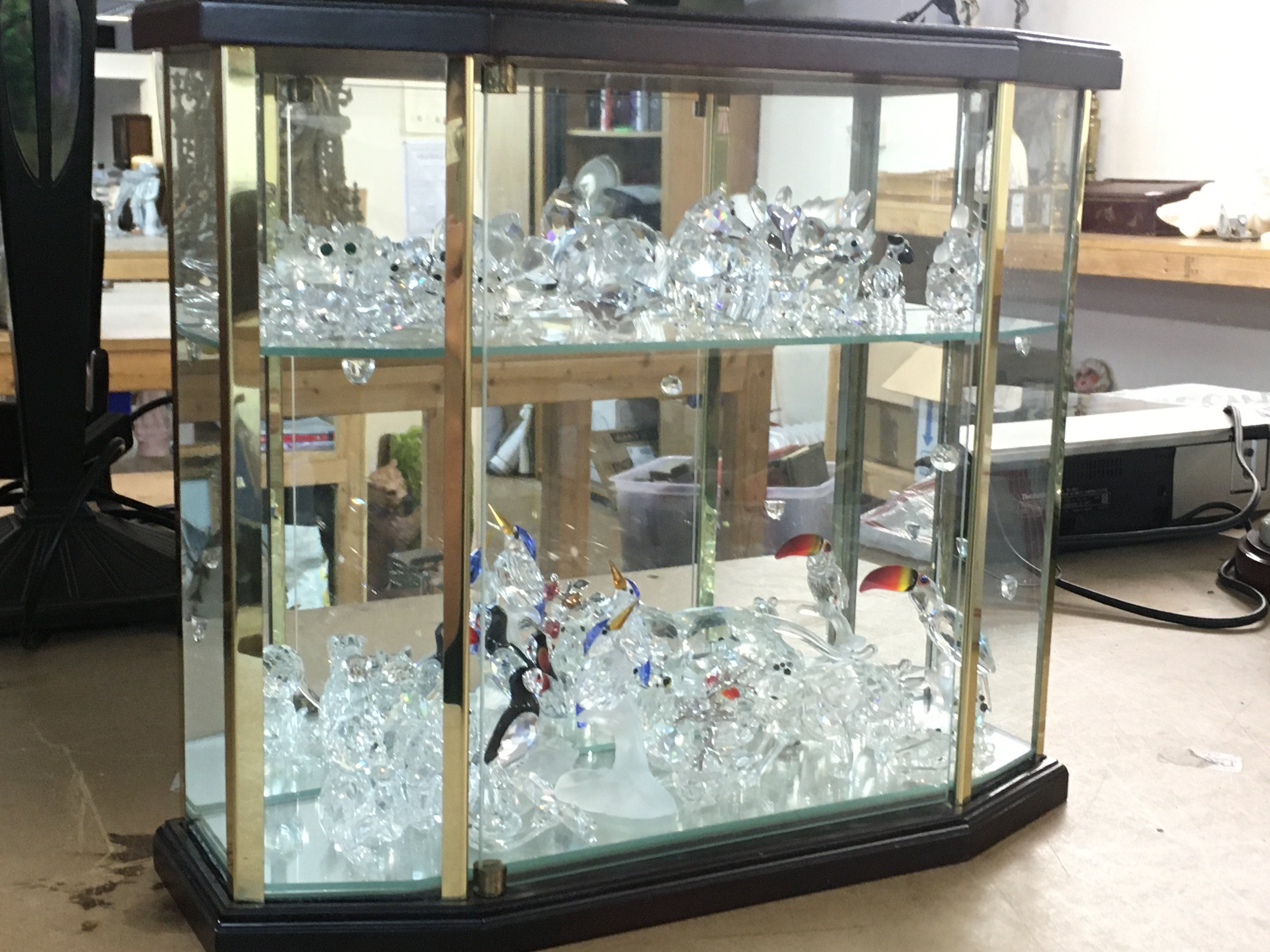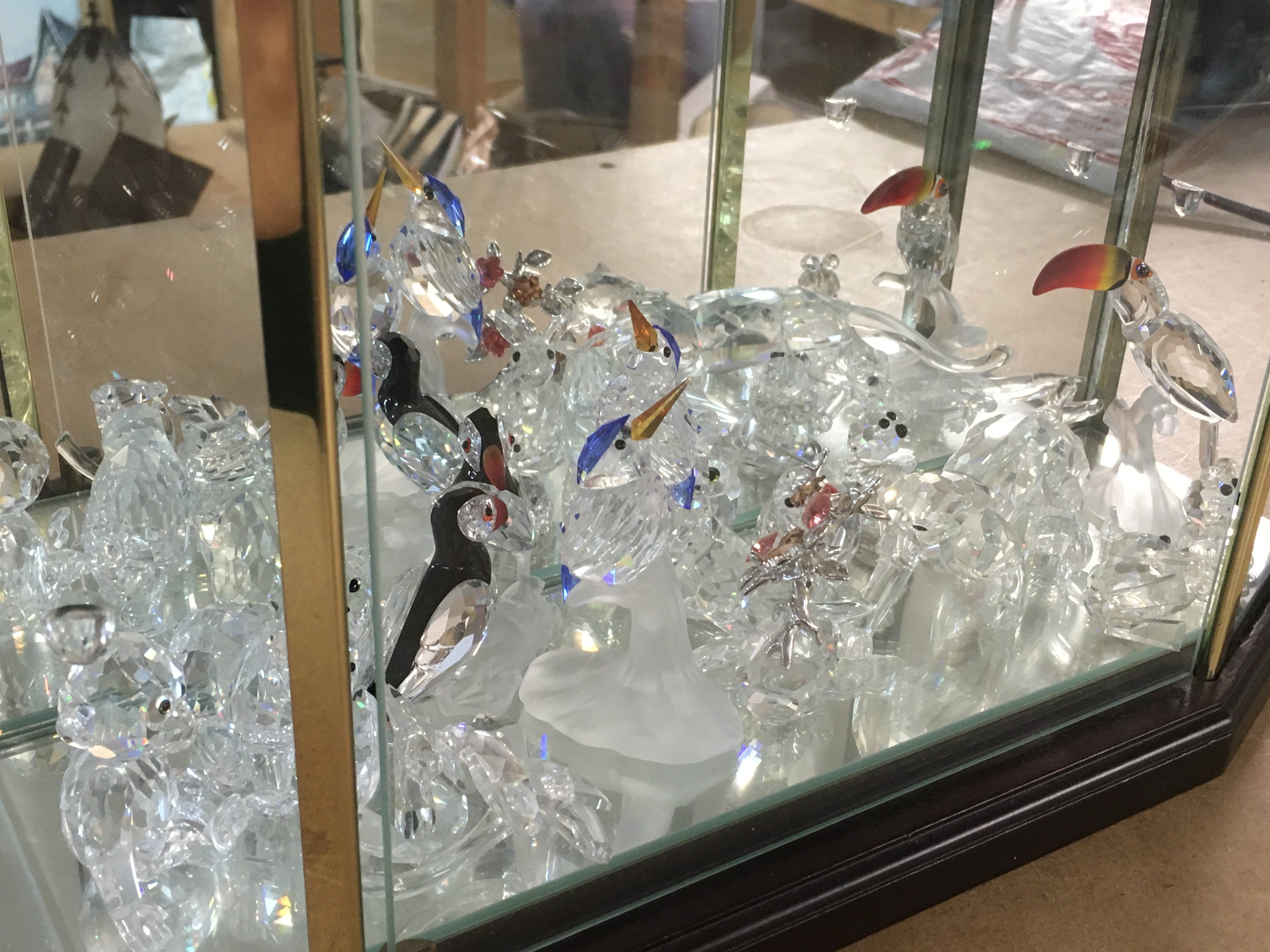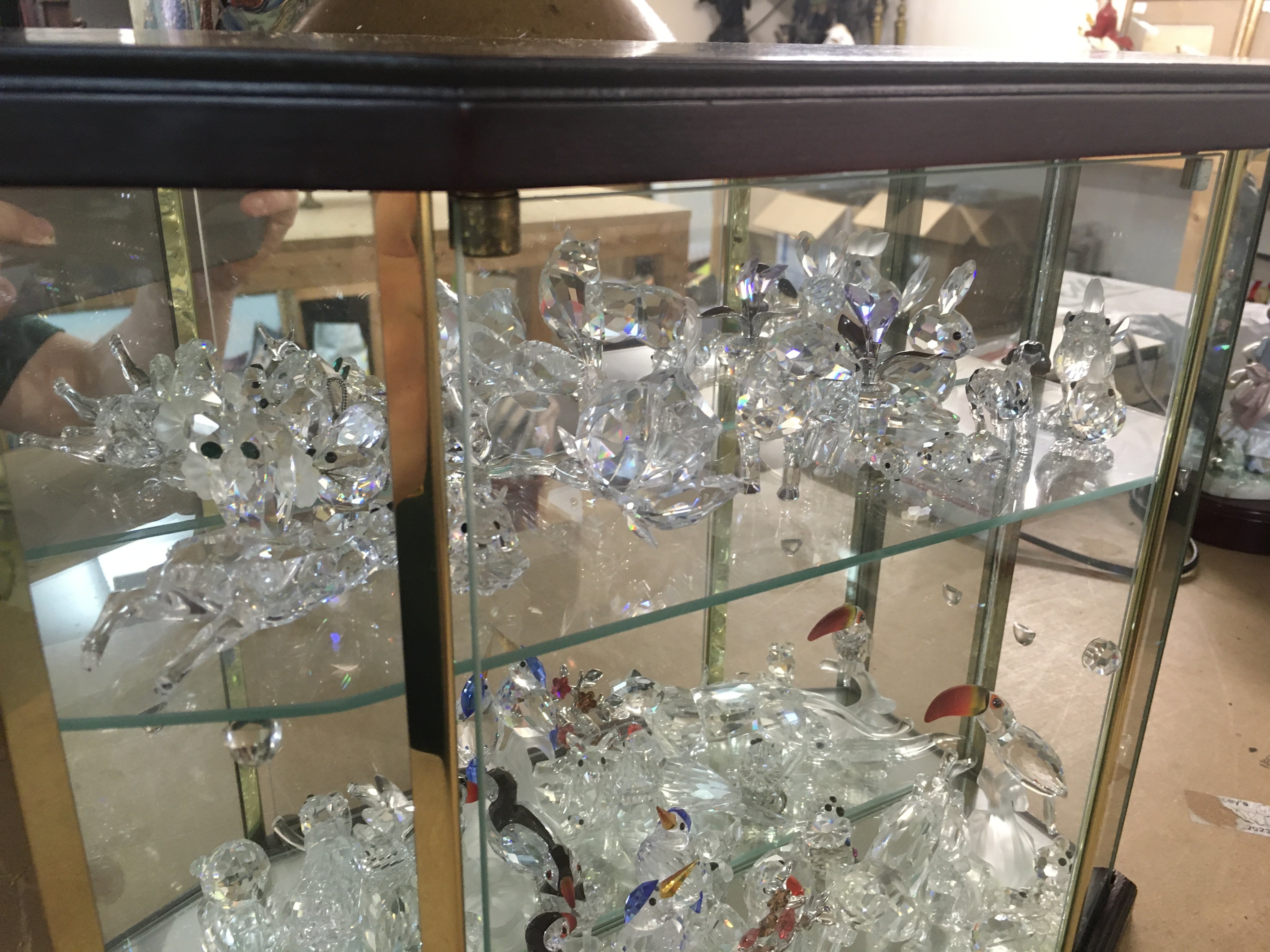 A collection of Swarovski crystal glass animal figures stored in a display case. This lot cannot be posted