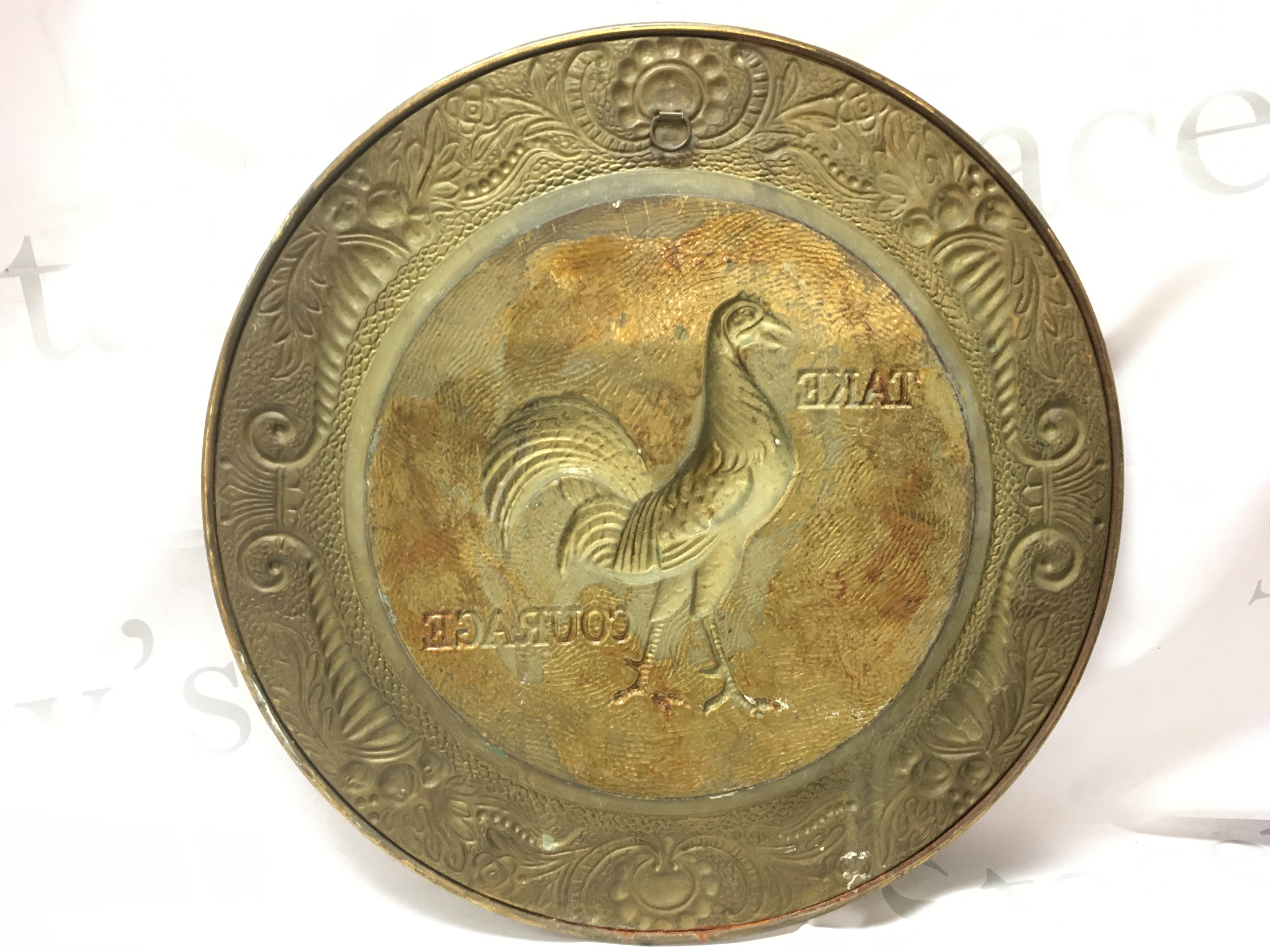 A vintage brass take courage embossed tray , 36cm wide. postage catB
