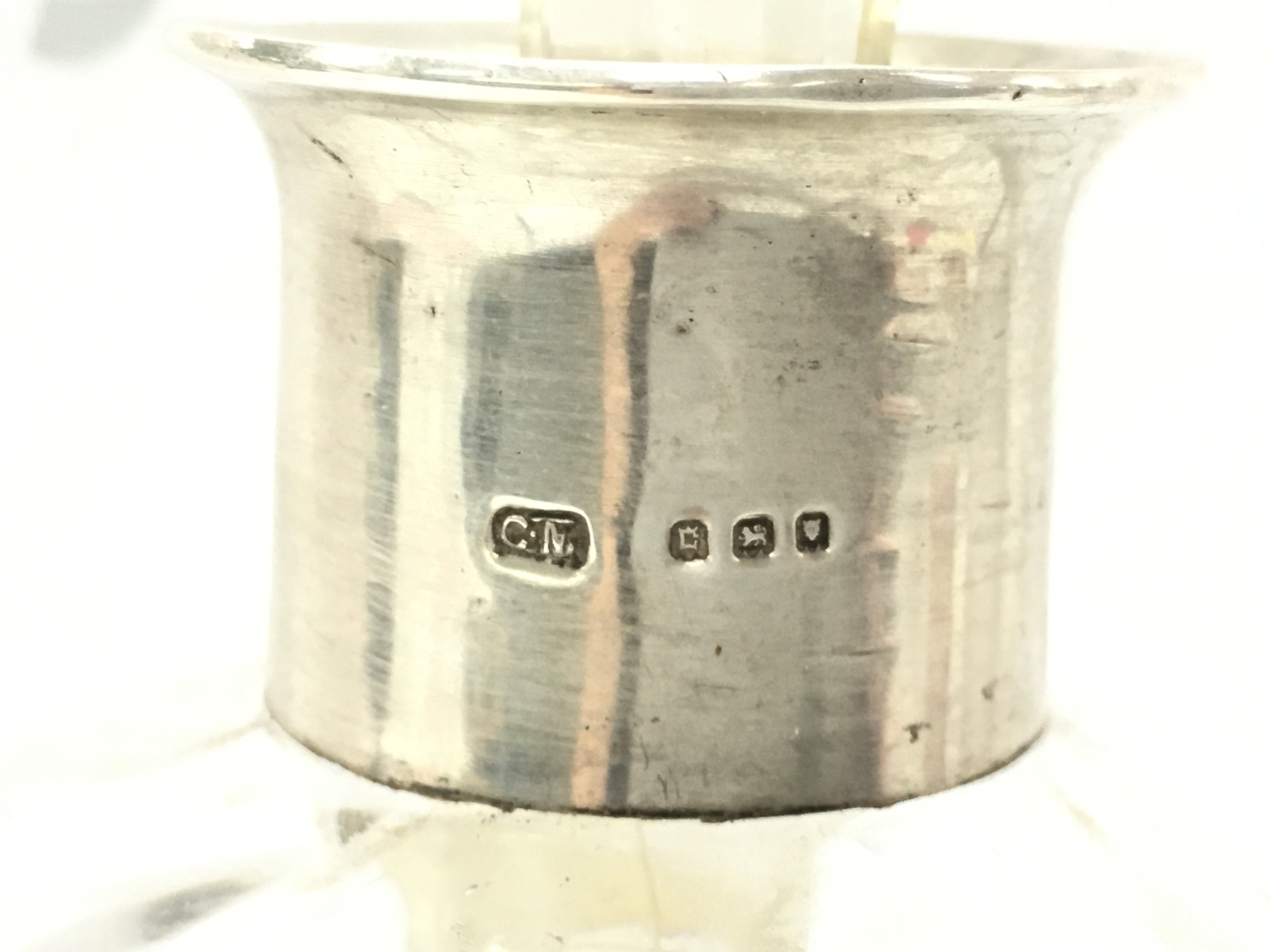 A vintage glass decanter with a hallmarked silver rim , 28.5cm tall. This lot cannot be posted