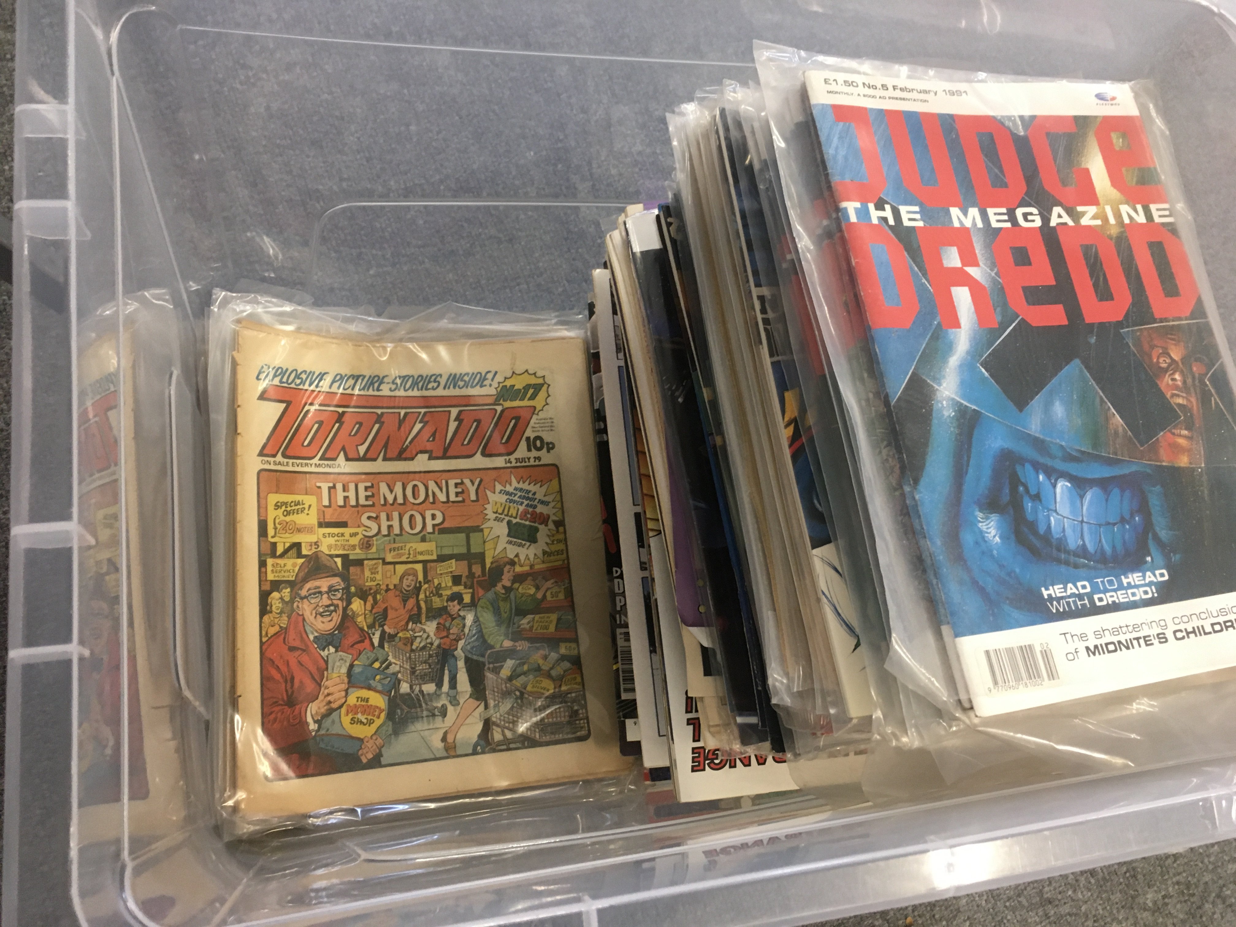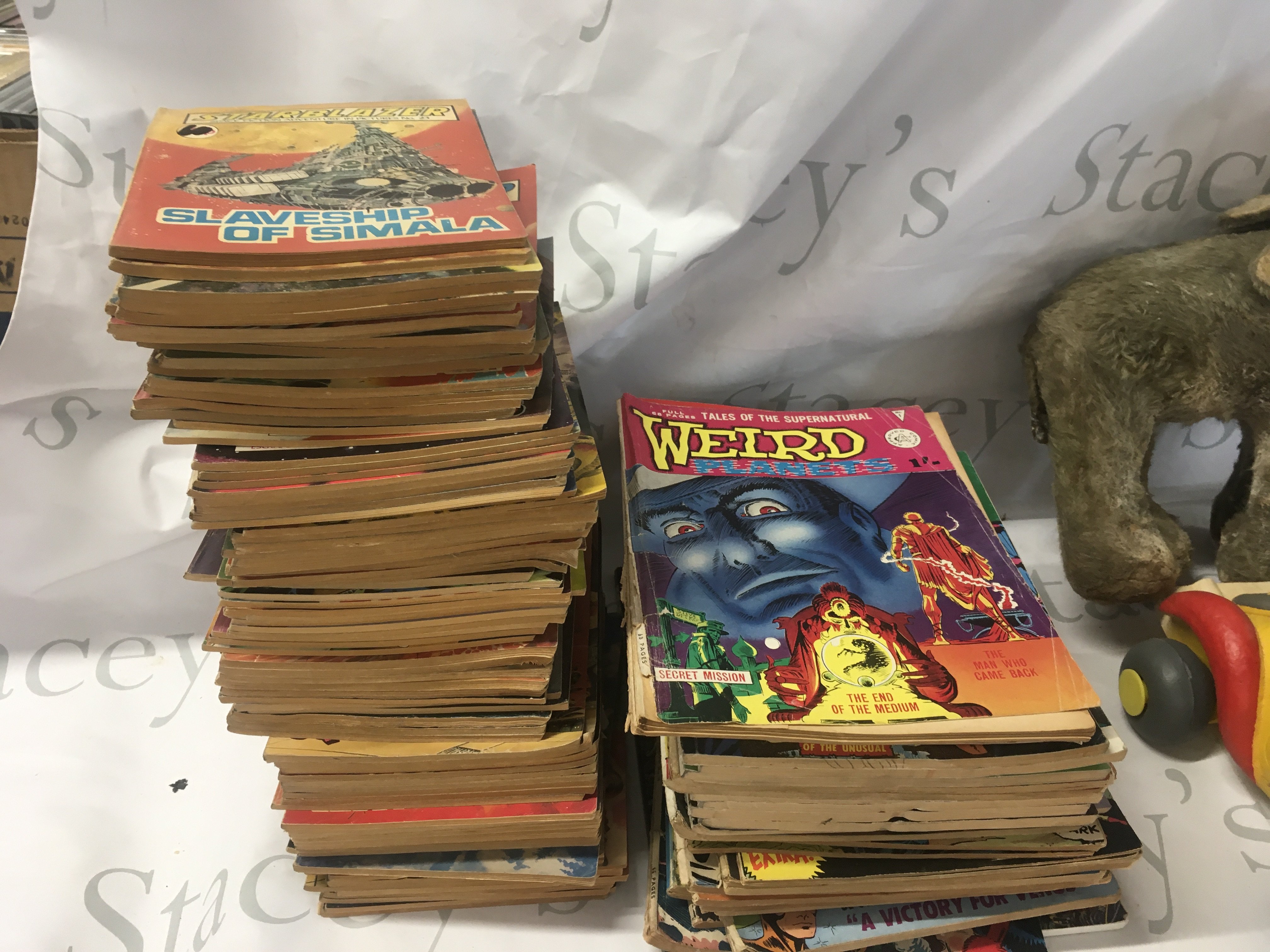 A box containing a vintage toy circus elephant..a Bendy Noddy Car and several hundred comics with titles including Starblazer..Tornado..Judge Dredd plus others including no.1 issues. No reserve.