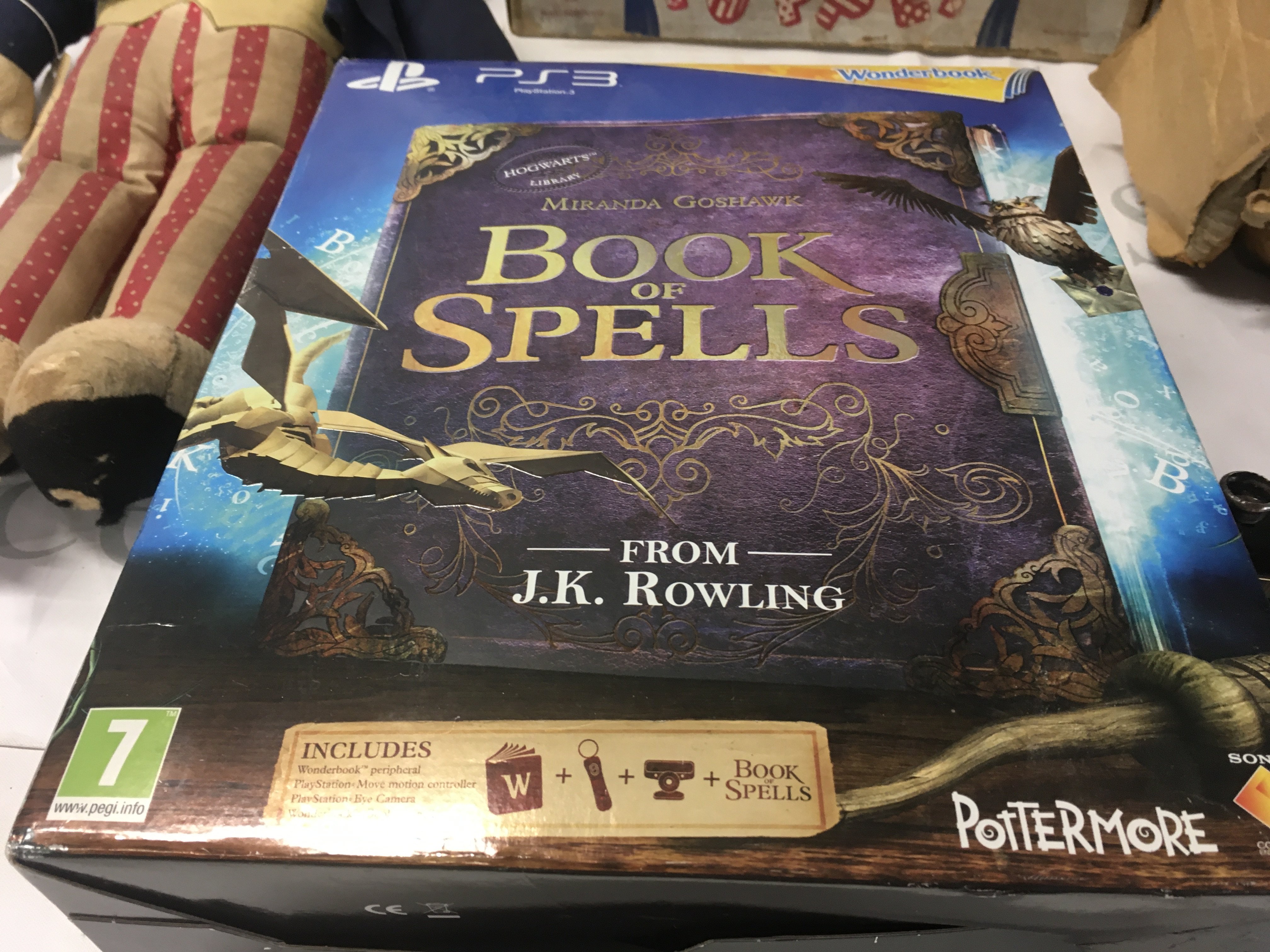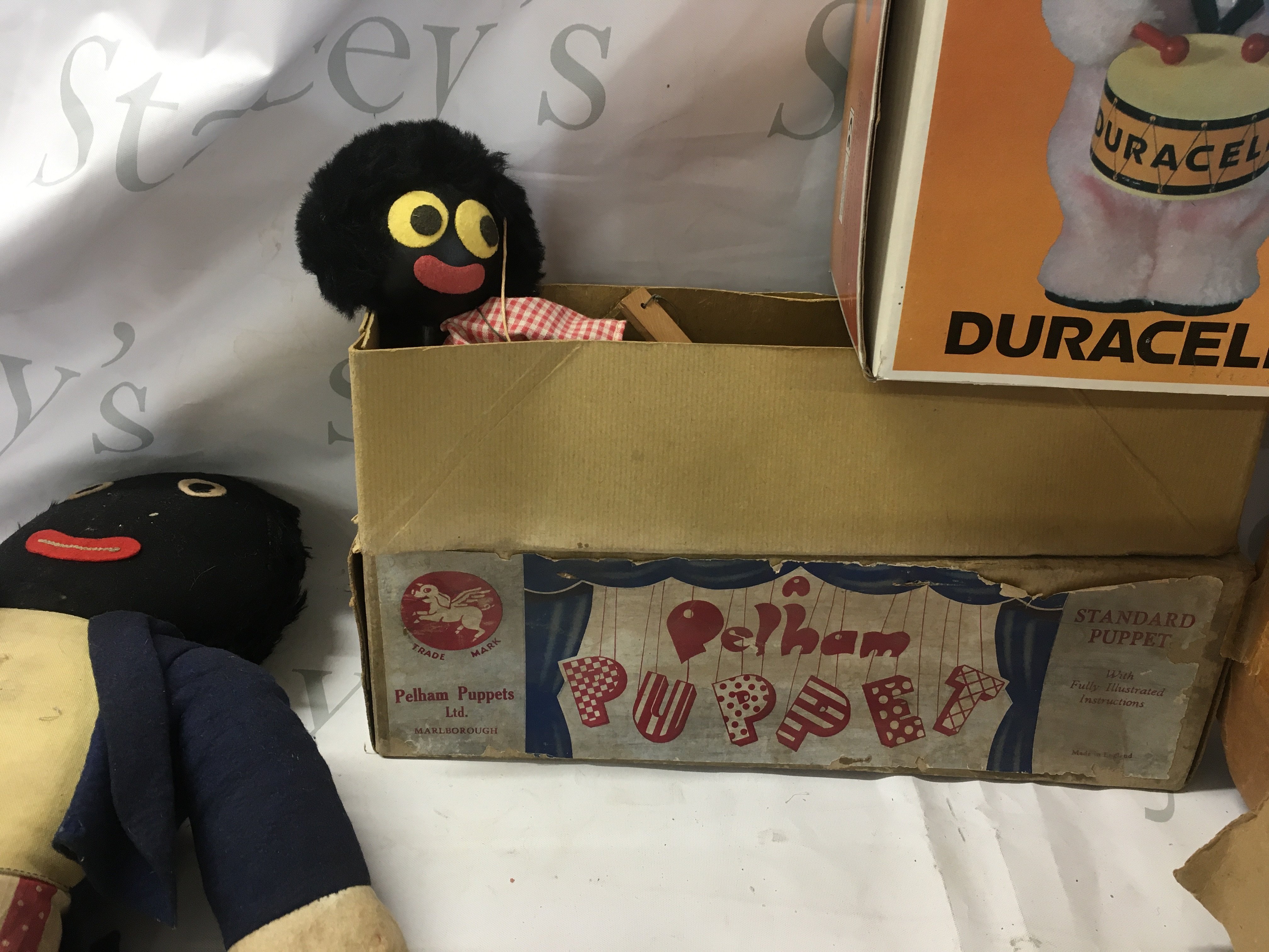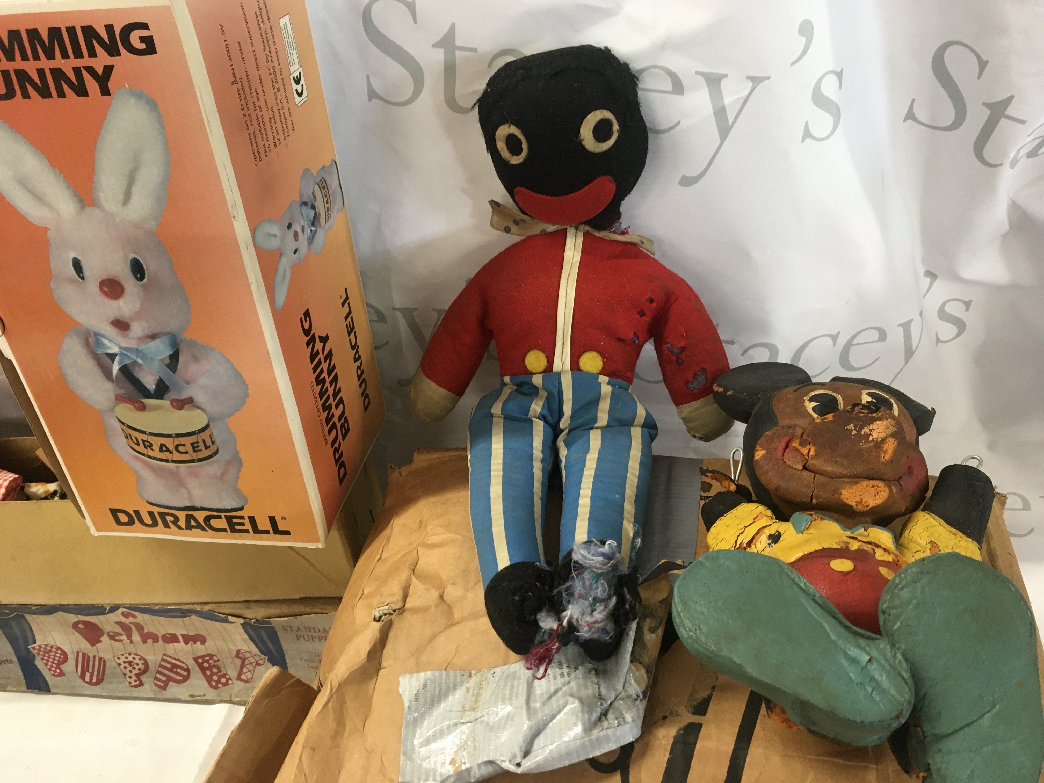An assorted collection including 3 Gollies one being a Pelham puppet..a boxed Duracell drumming bunny..a Triang clockwork train with track 0 gauge..a perished vintage Mickey Mouse and a PS3 Book of Spells. No reserve