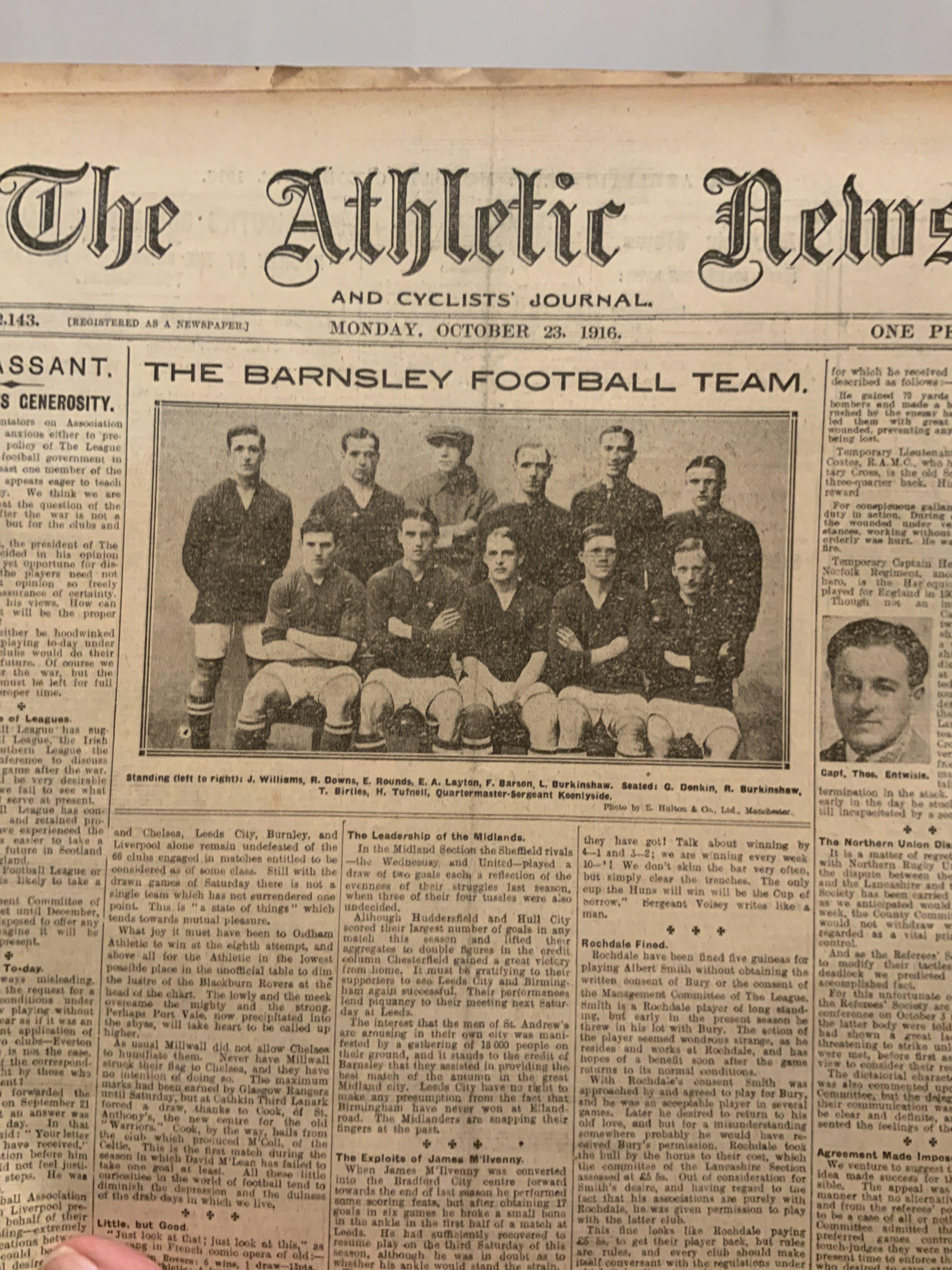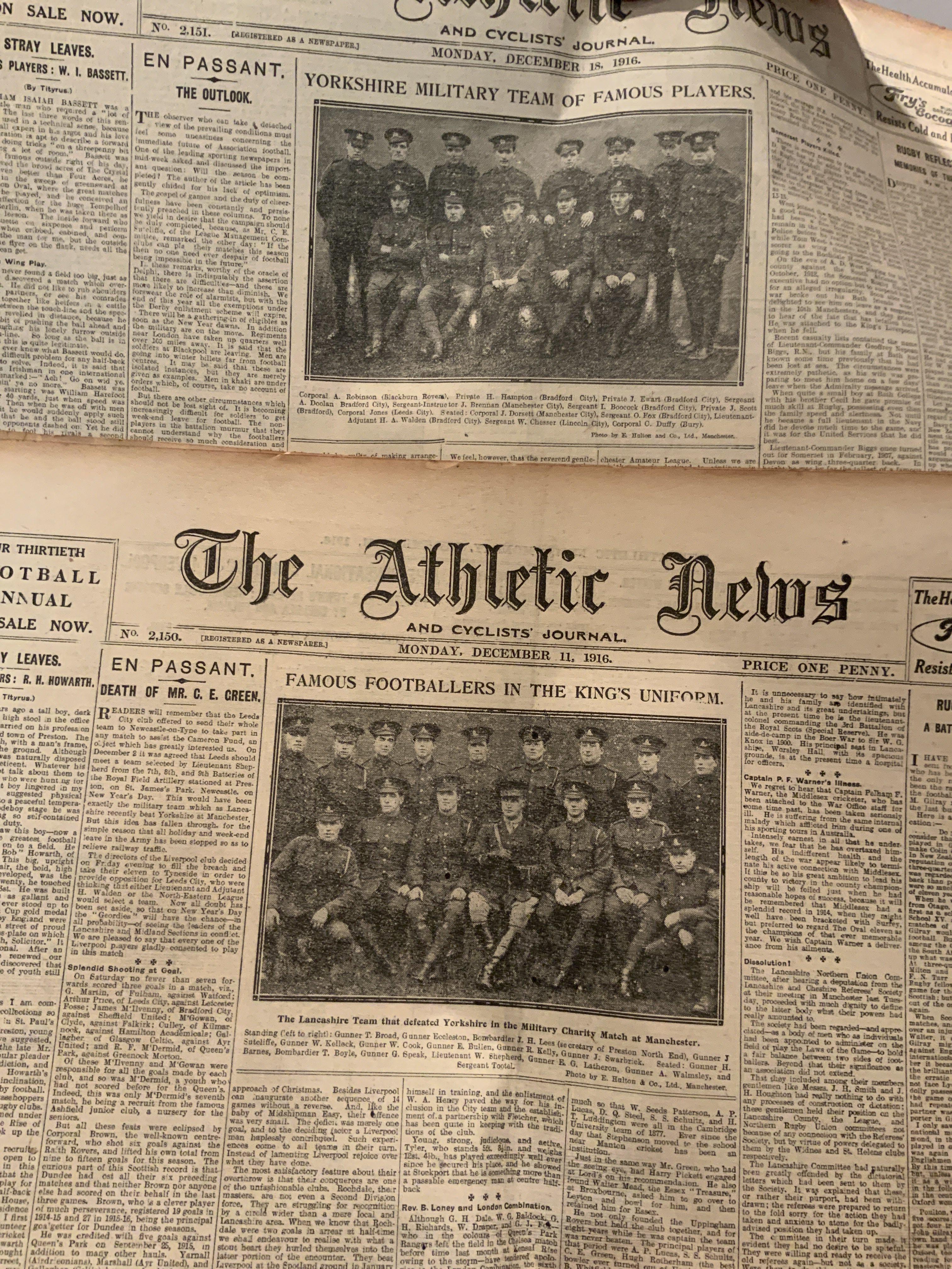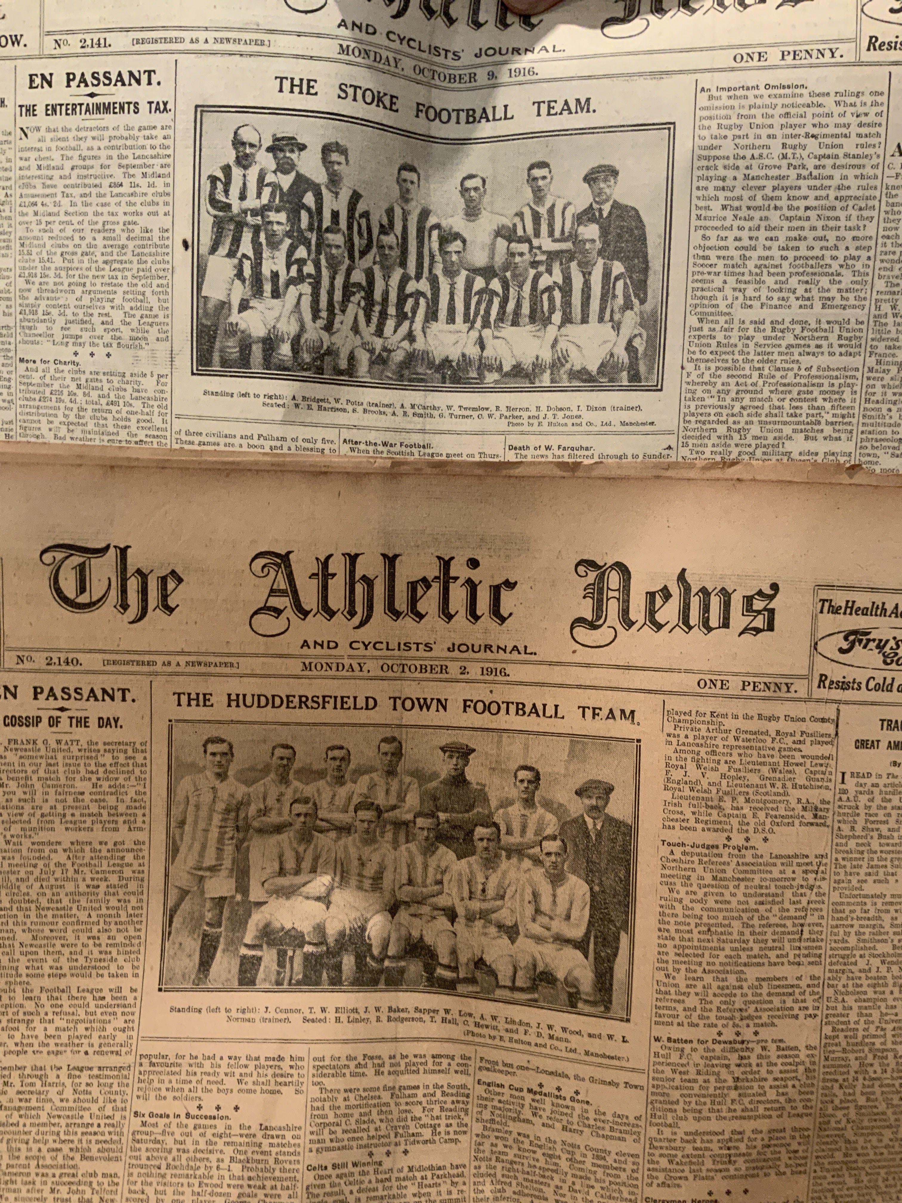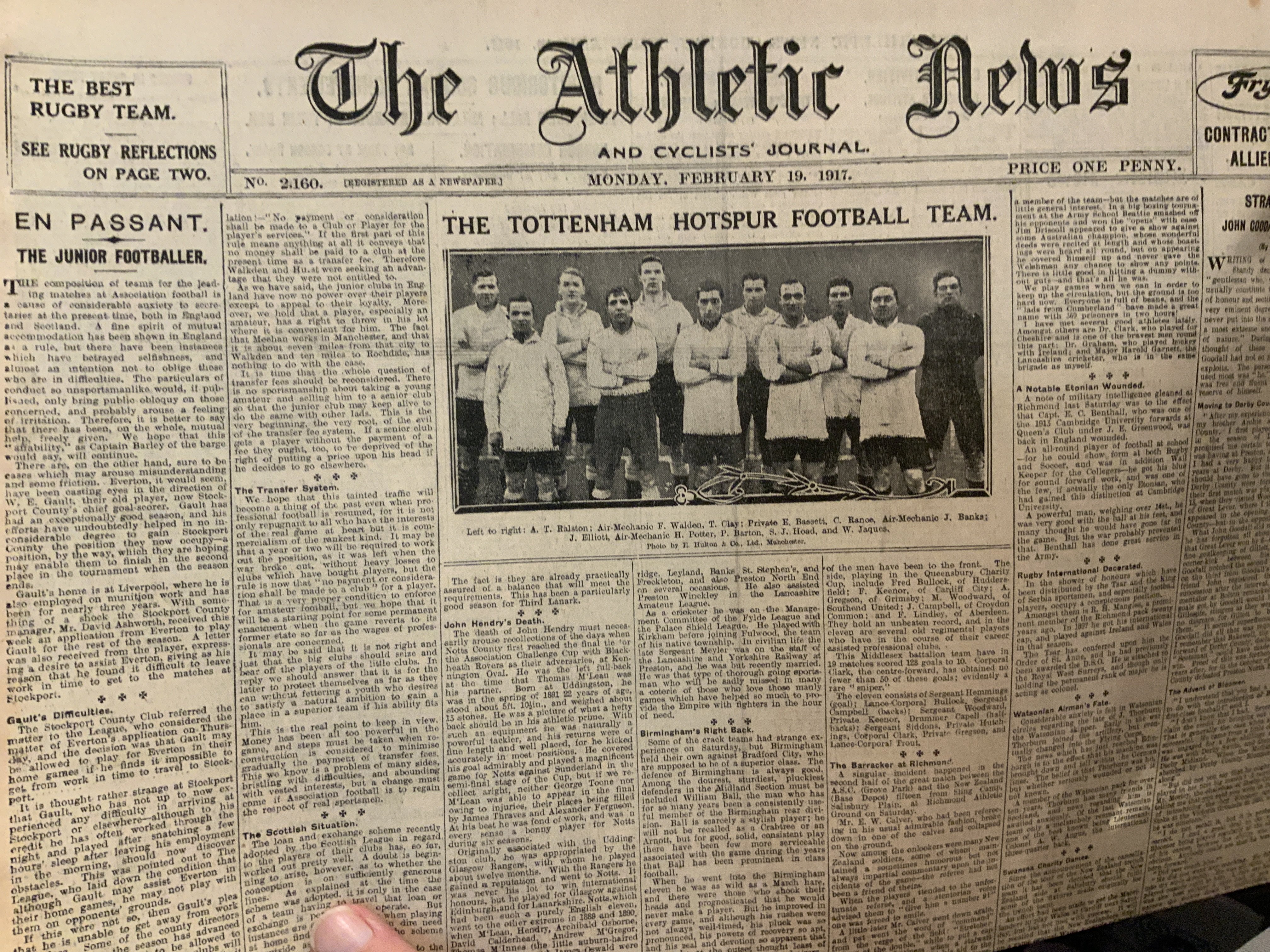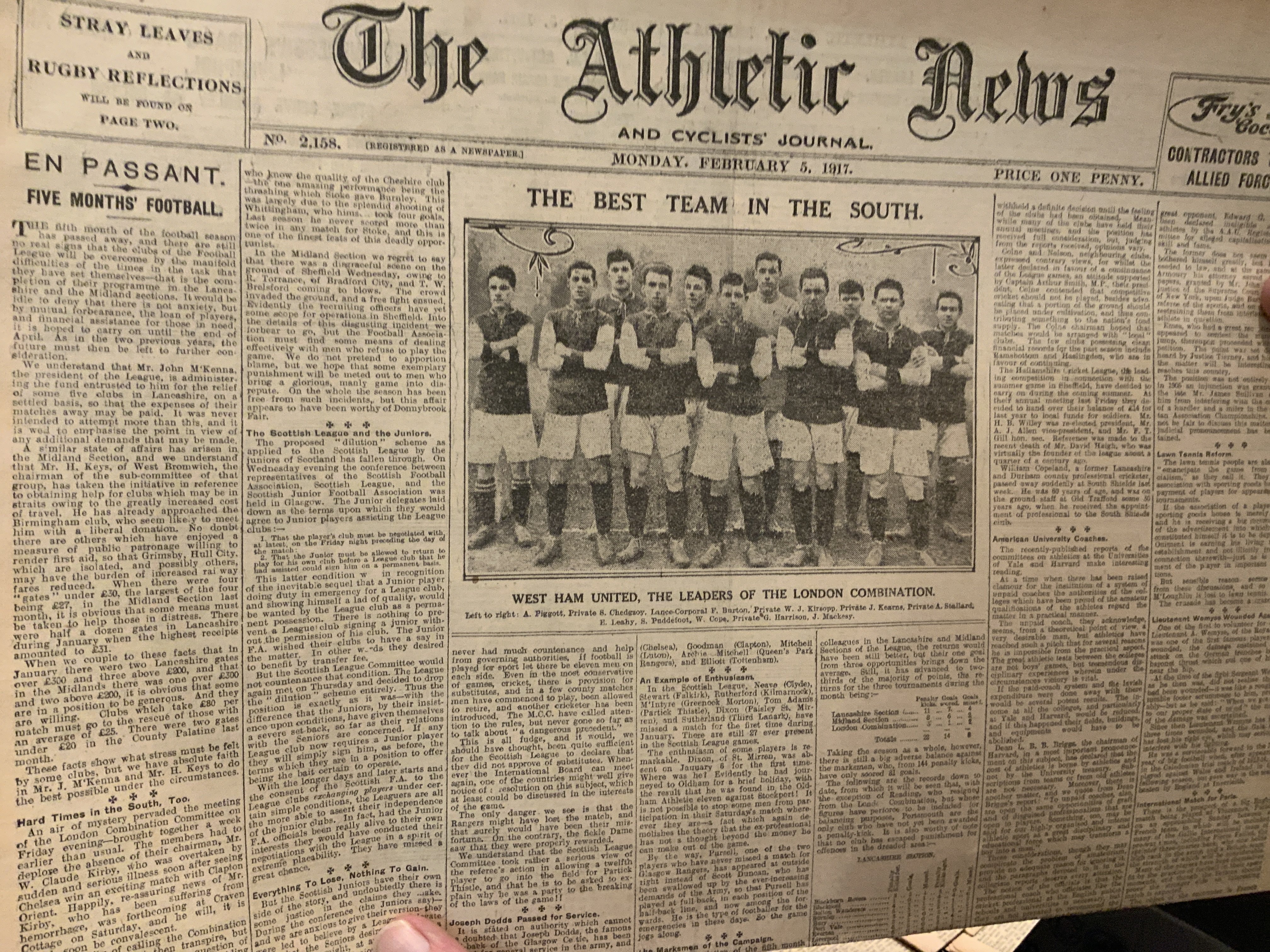 First World War Football Newspapers: The Athletics News in fair condition for 110 years old. Covering all sports with good football content. March 1917 features the Leeds City players to cover under the heading first champions of the football season, February 1917 features the Tottenham team group on the front and a further team group of West Ham stating the best team in the south and refers to the London Combination. There are pictures of players that have died in the First World War and also currently away on service. (35)