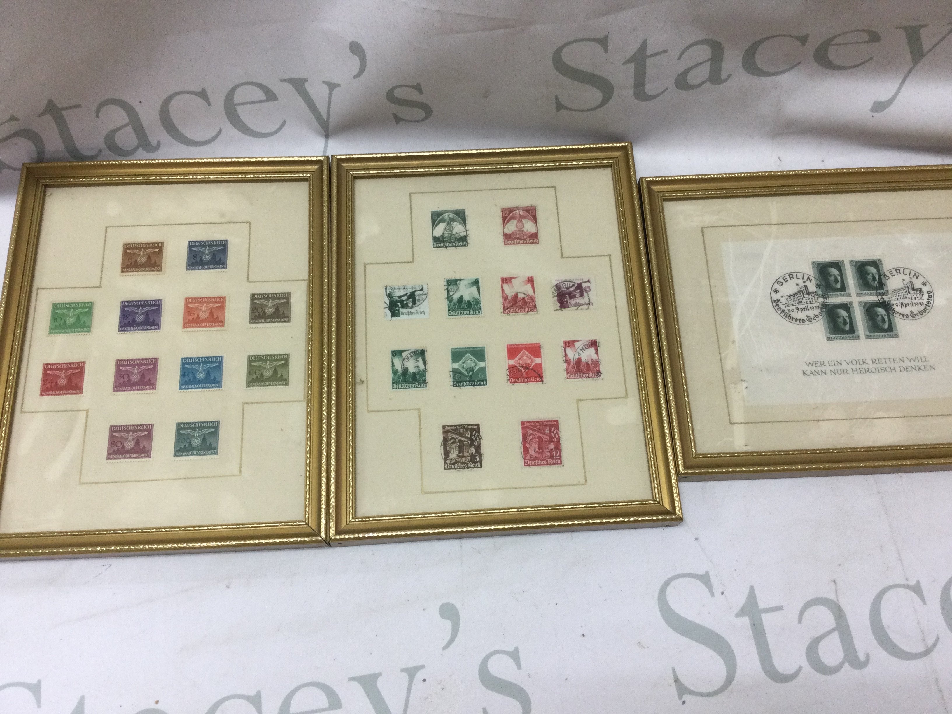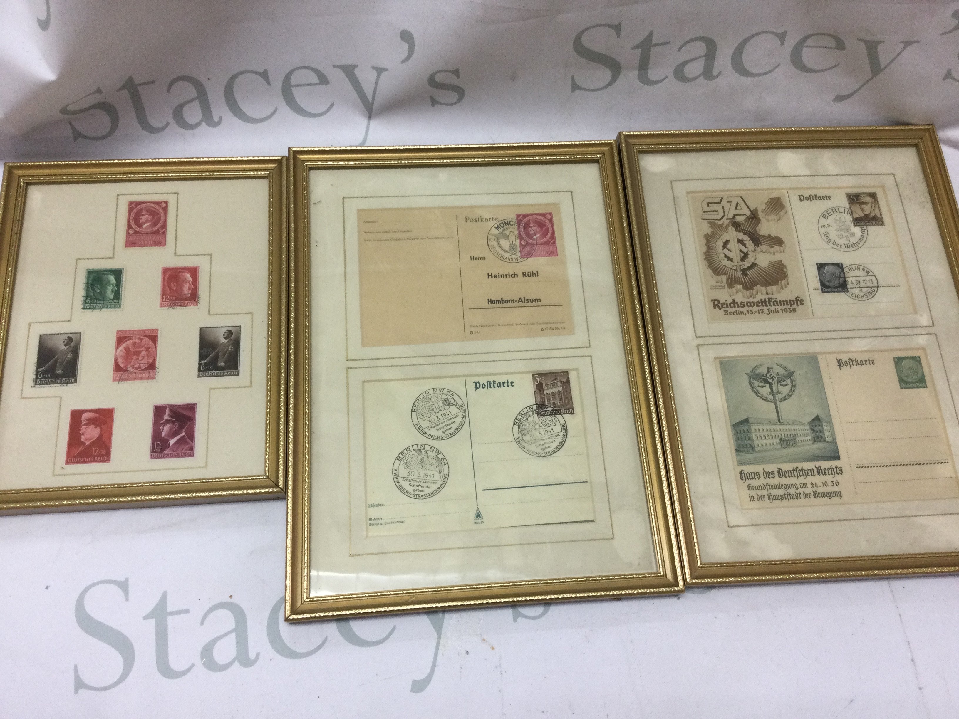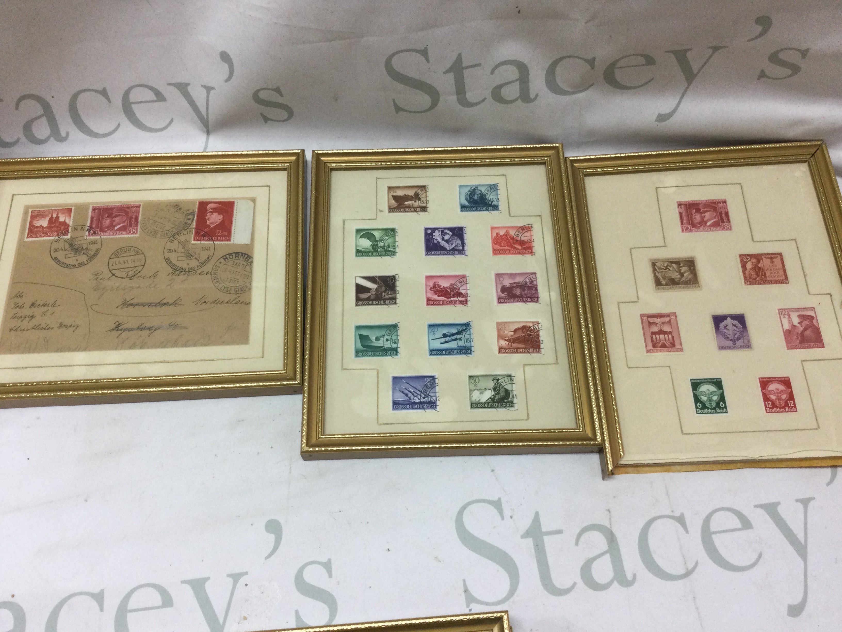 A collection of framed unused and used German Third Reich stamps, Proclamation to the population of the isle of jersey and postcards . This lot can be posted without frames.