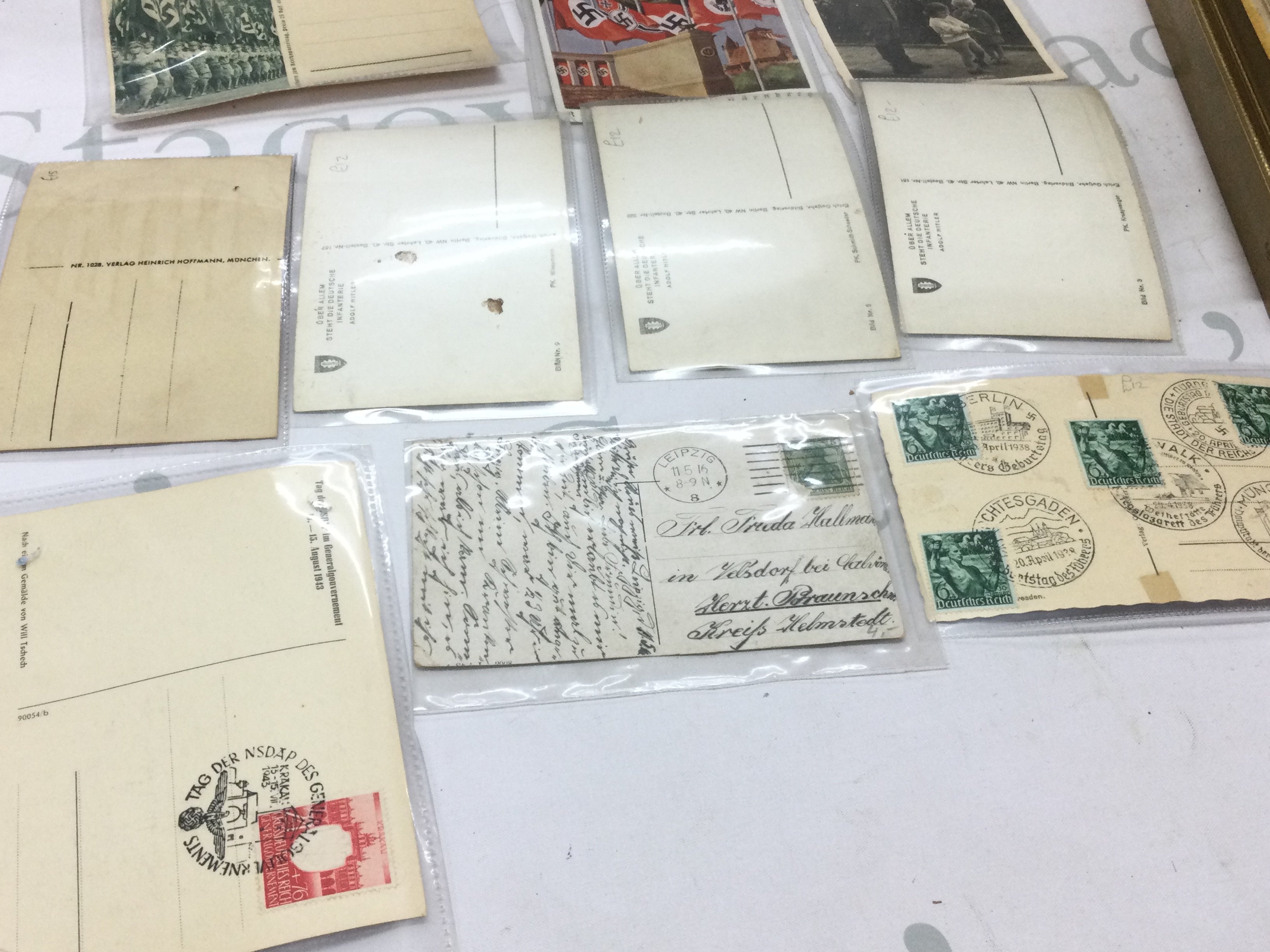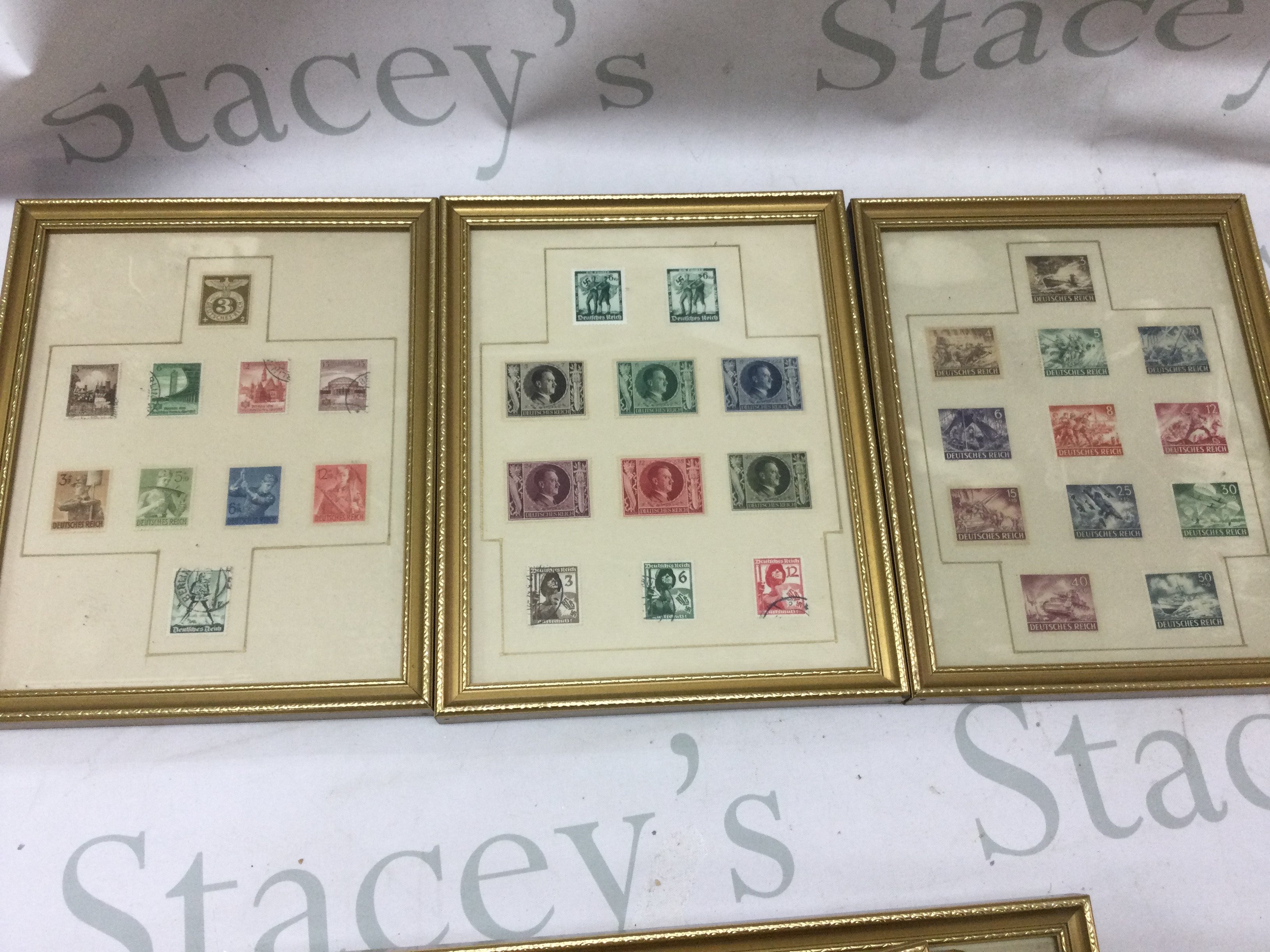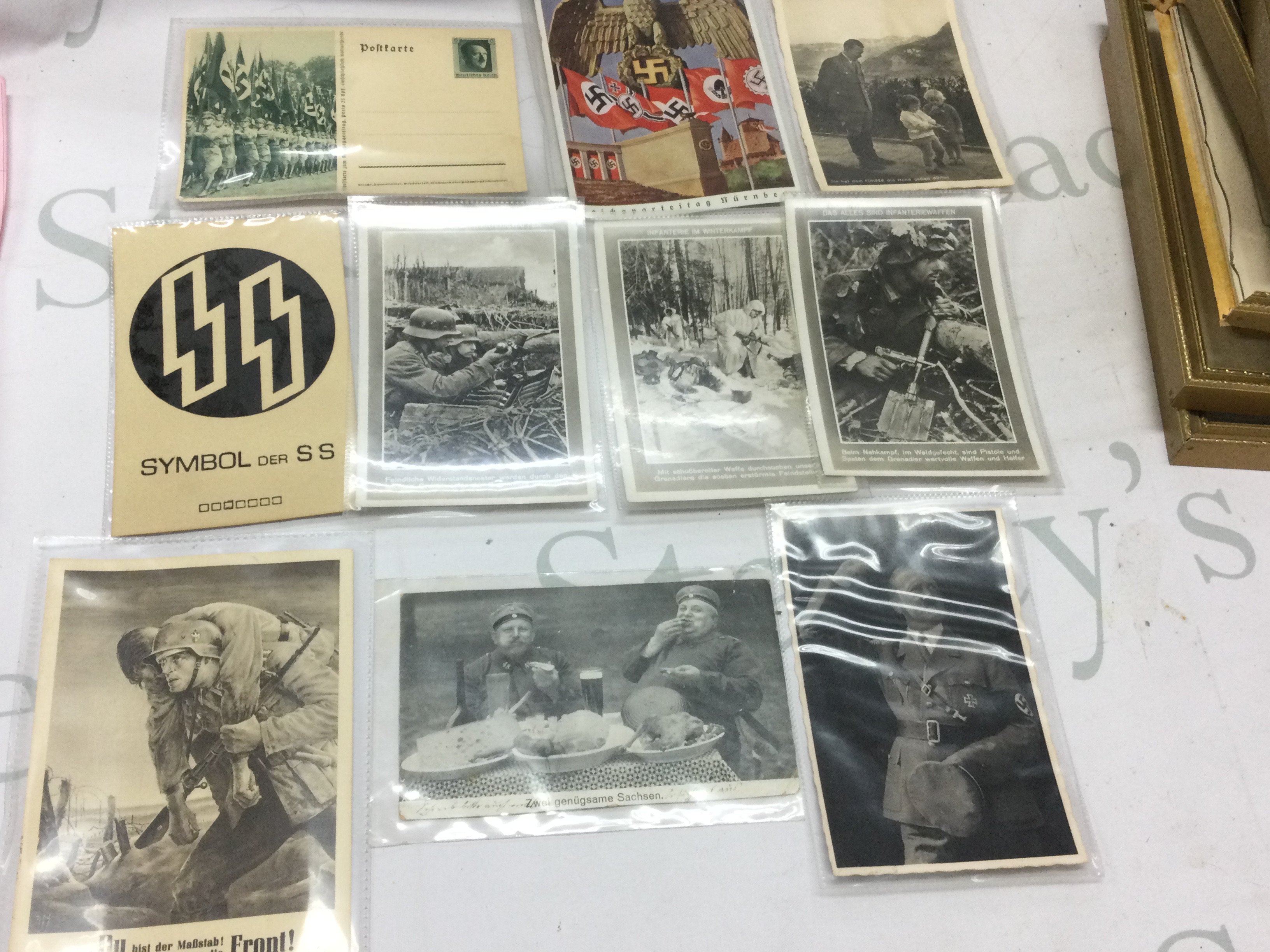 A collection of framed unused and used German Third Reich stamps, Proclamation to the population of the isle of jersey and postcards . This lot can be posted without frames.