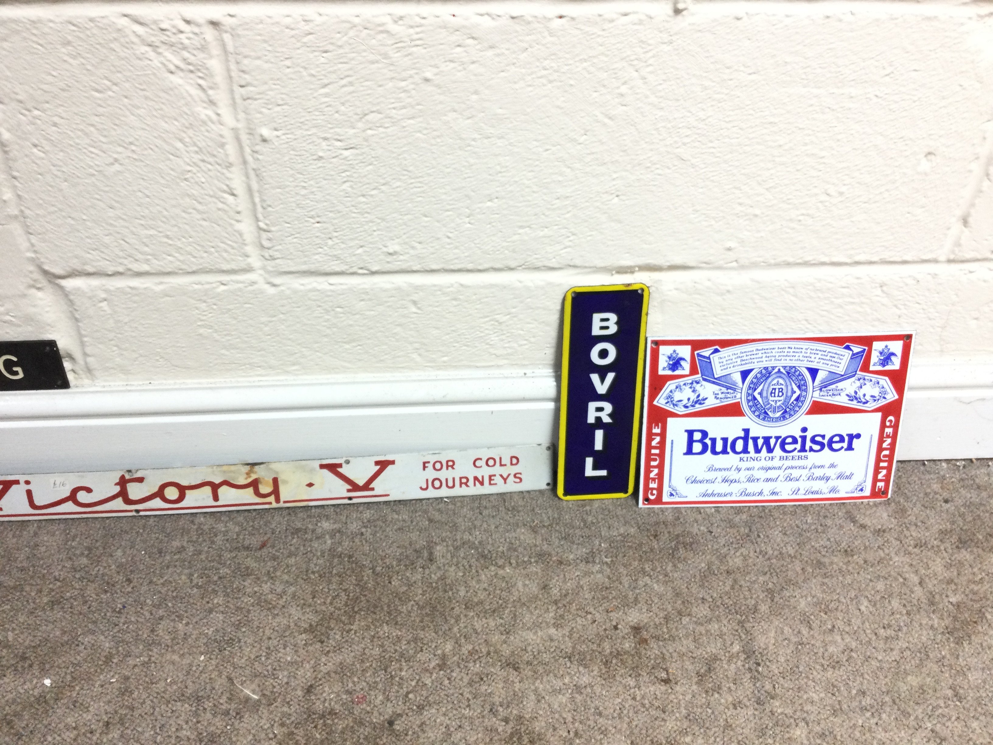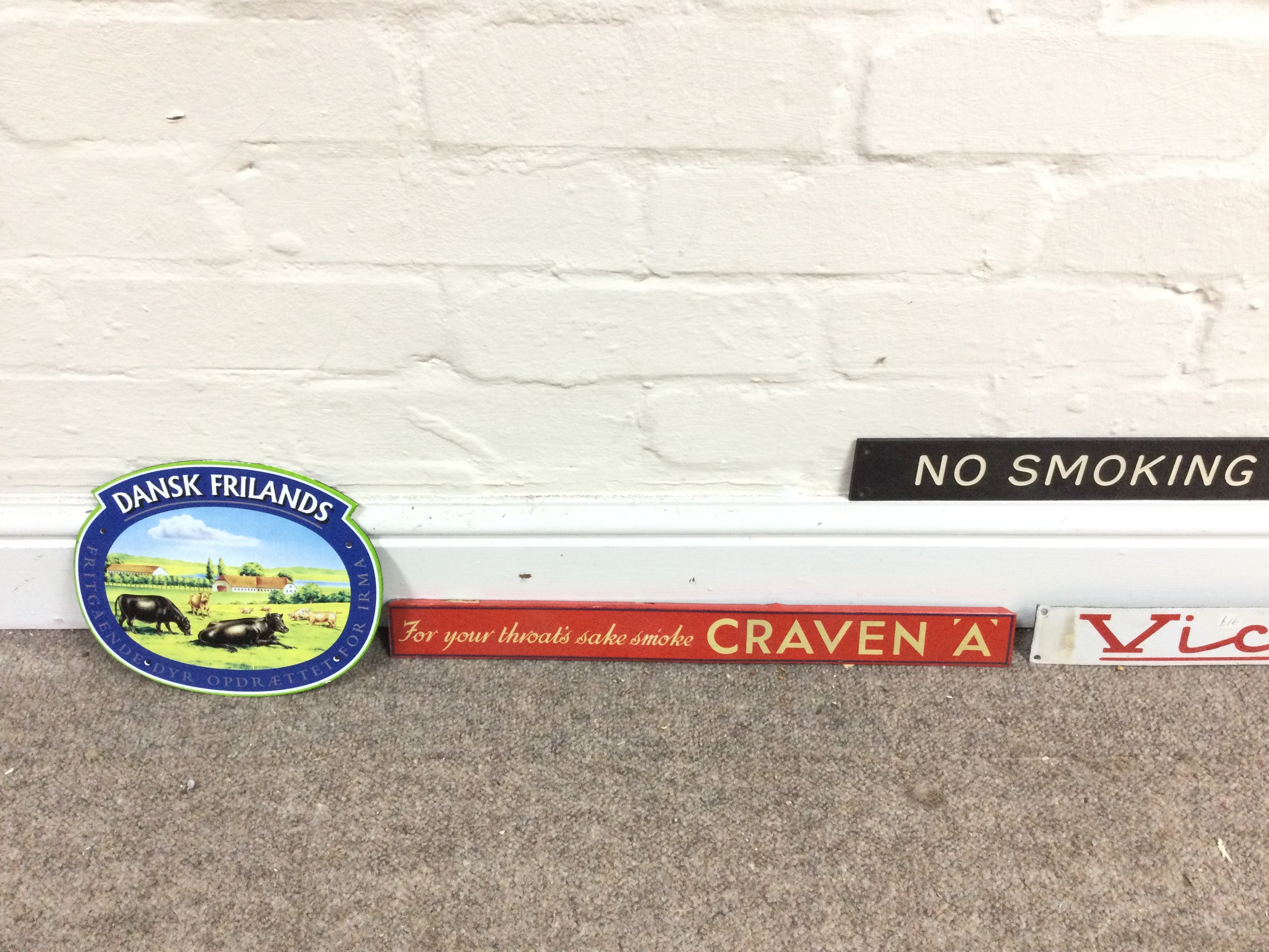 A collection of assorted small advertising signs including bovril and craven A