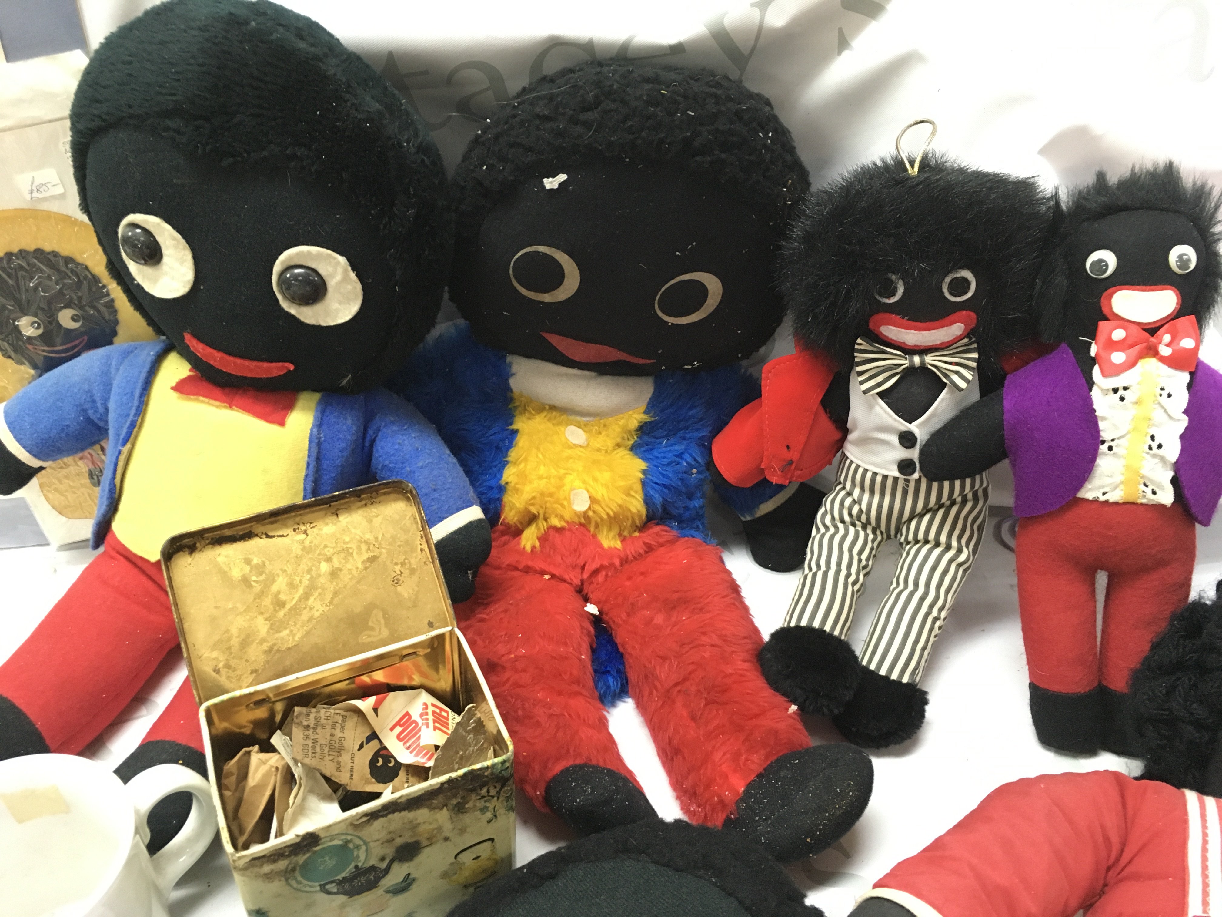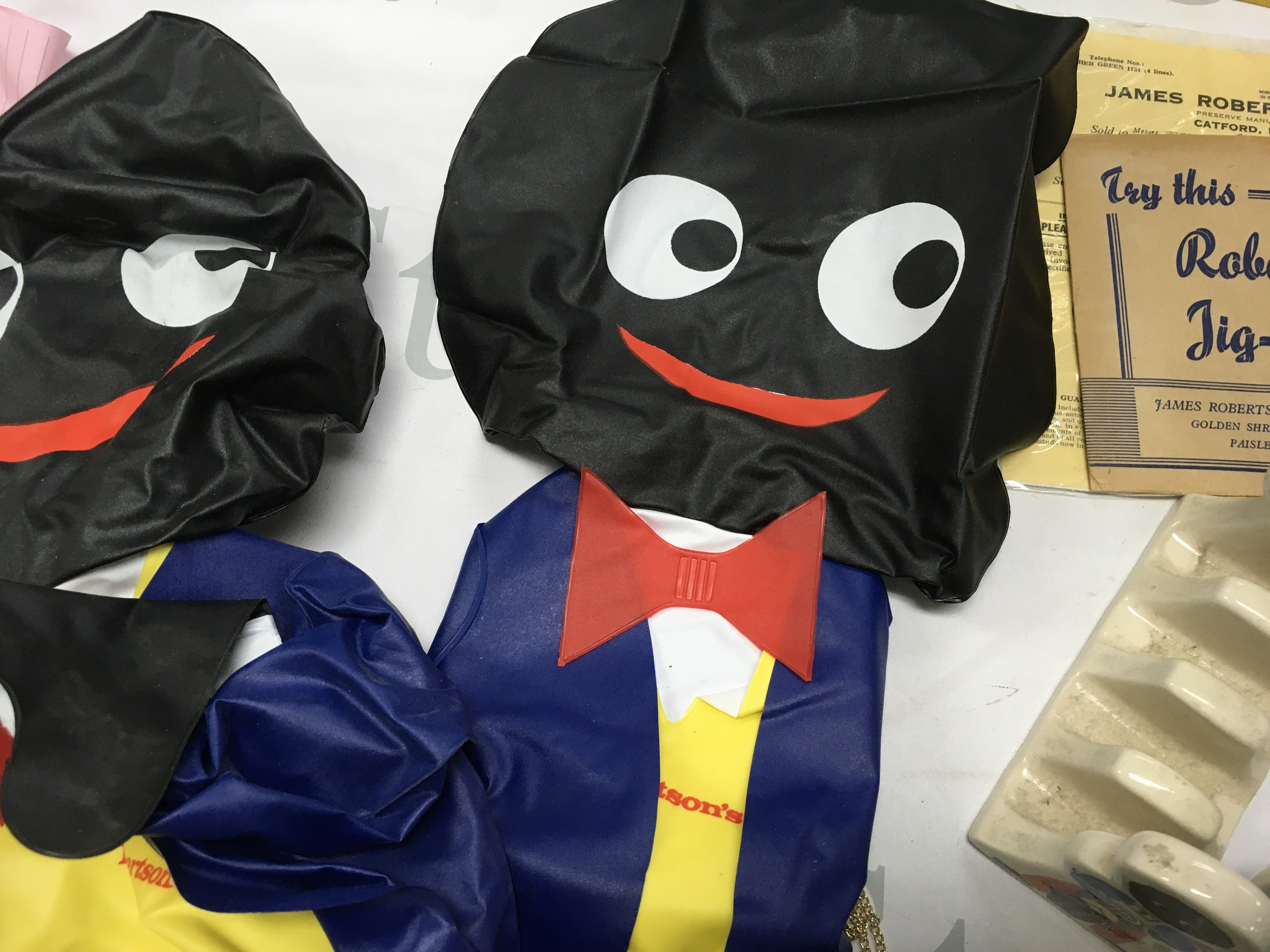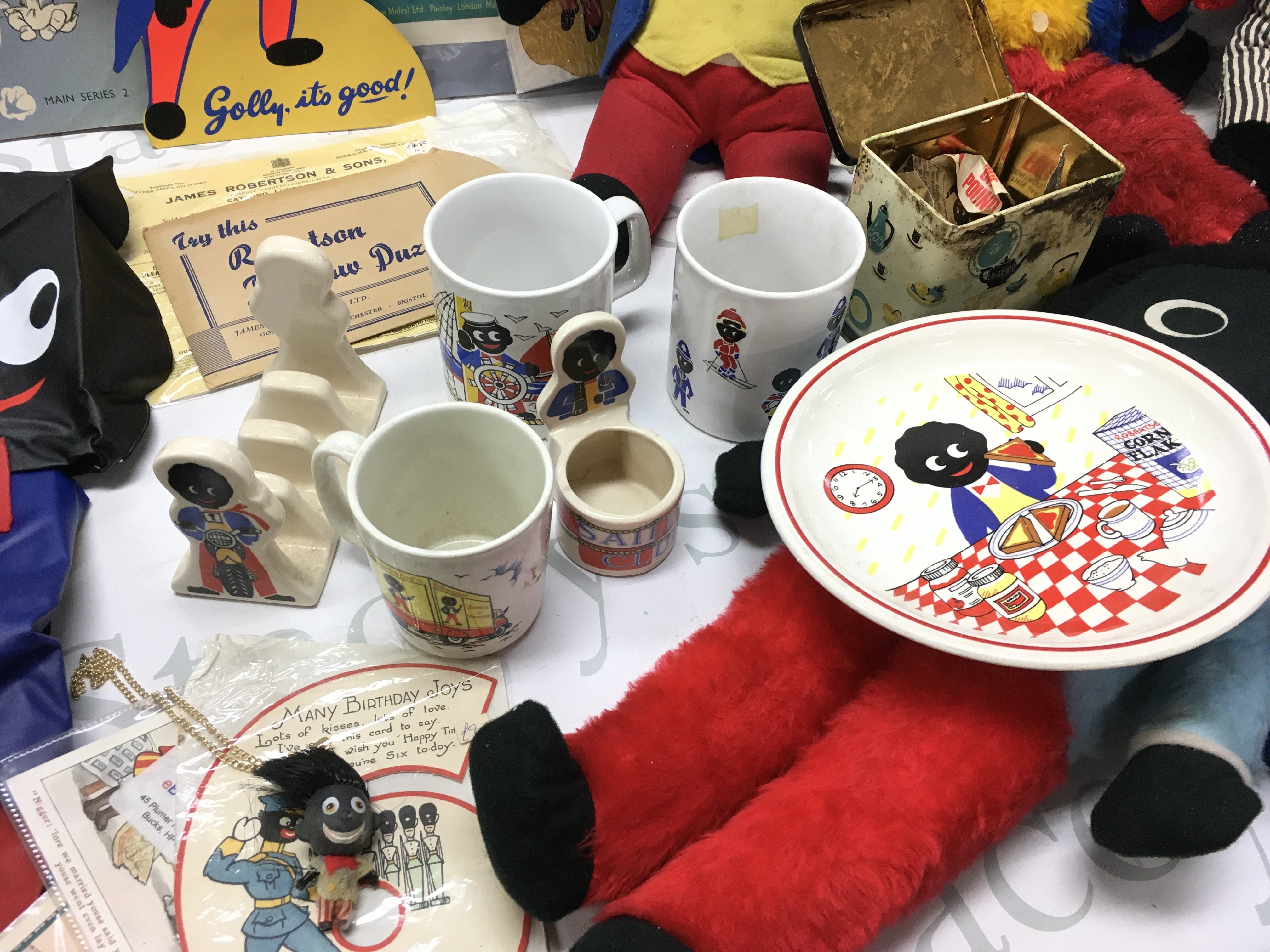 A collection of vintage golly items including soft toys, Robertsons mugs, plate, sailing club egg cup , inflatable blow up figures, shop window adverts and other advertising items. This lot cannot be posted