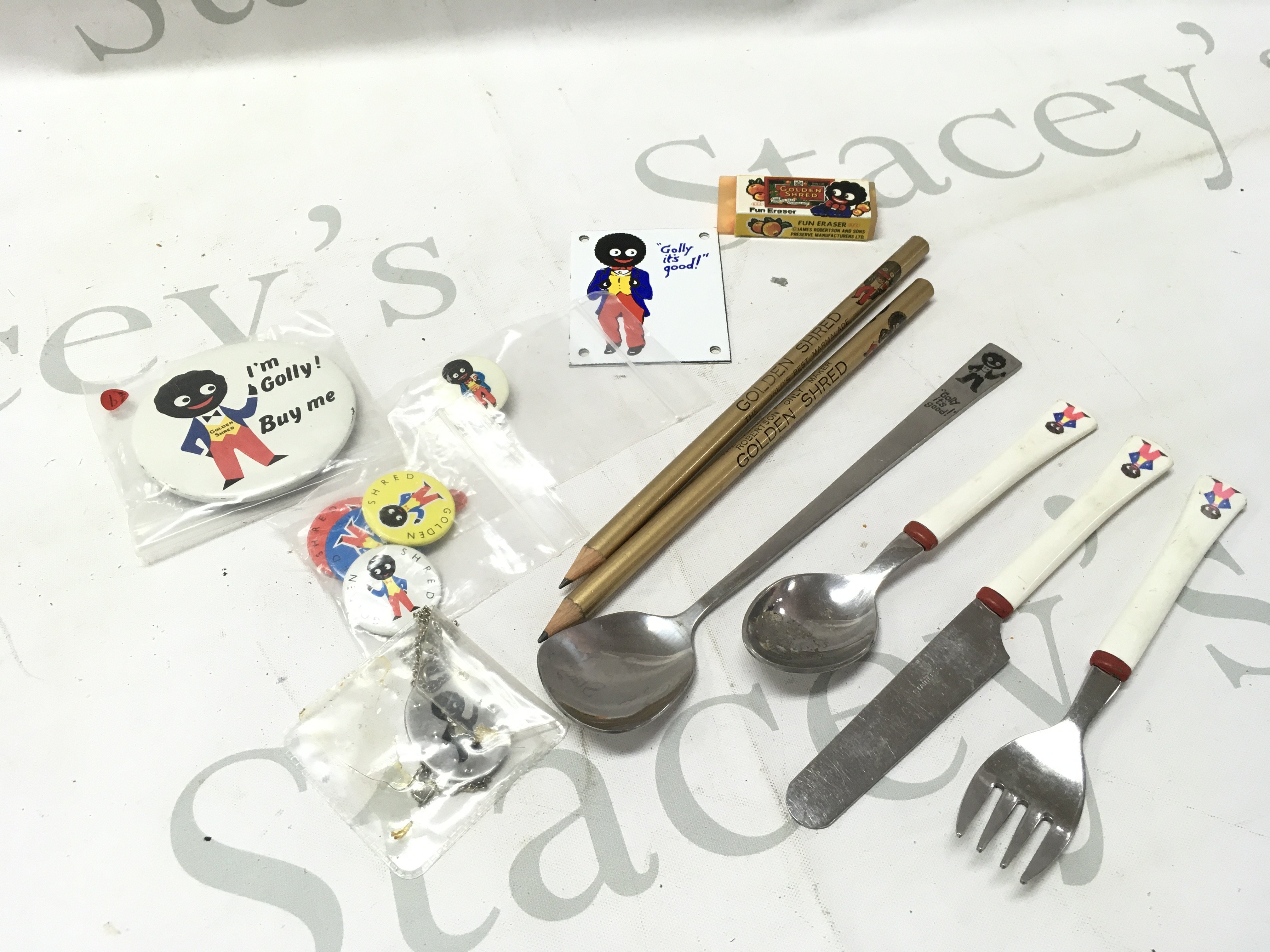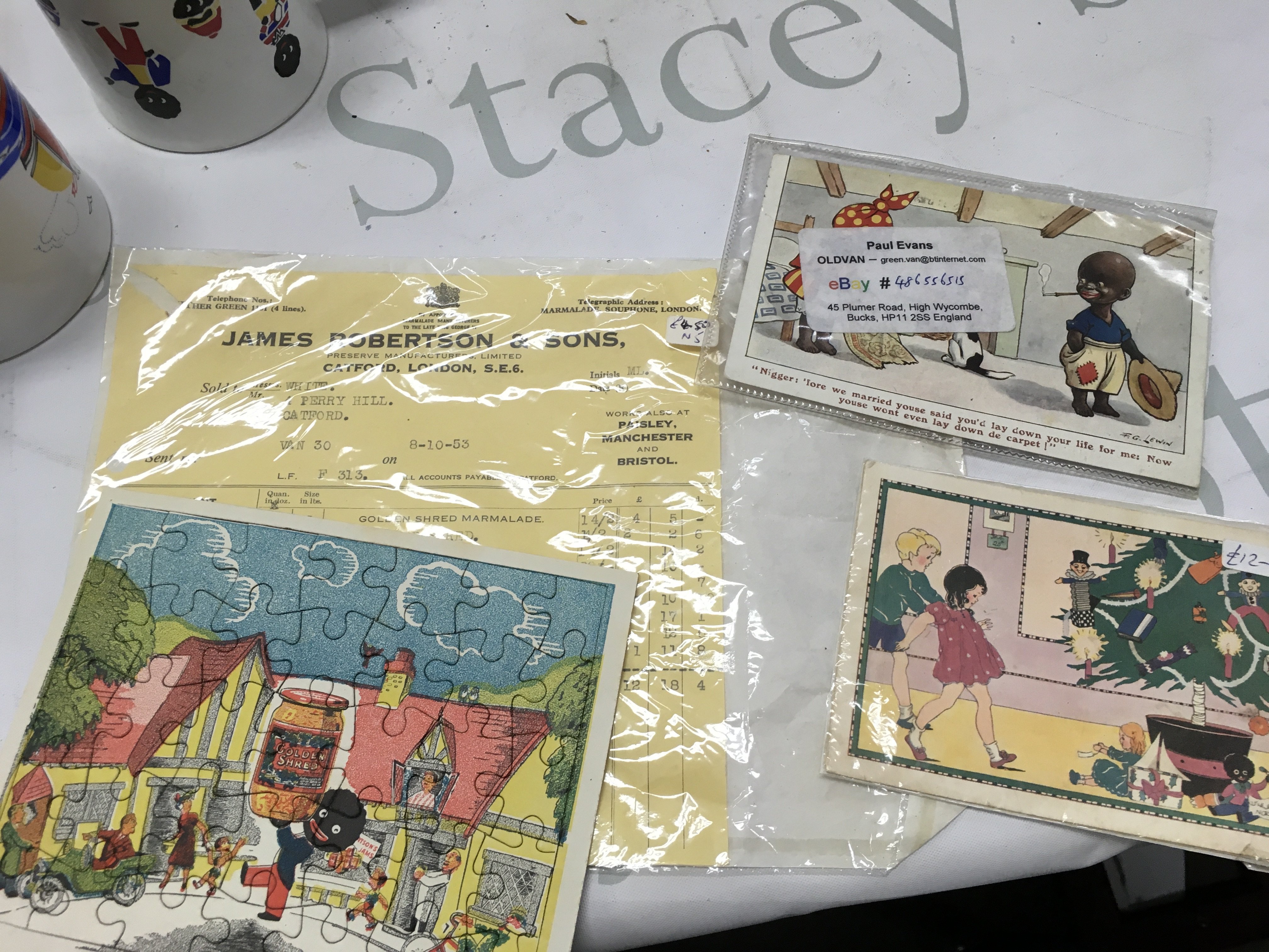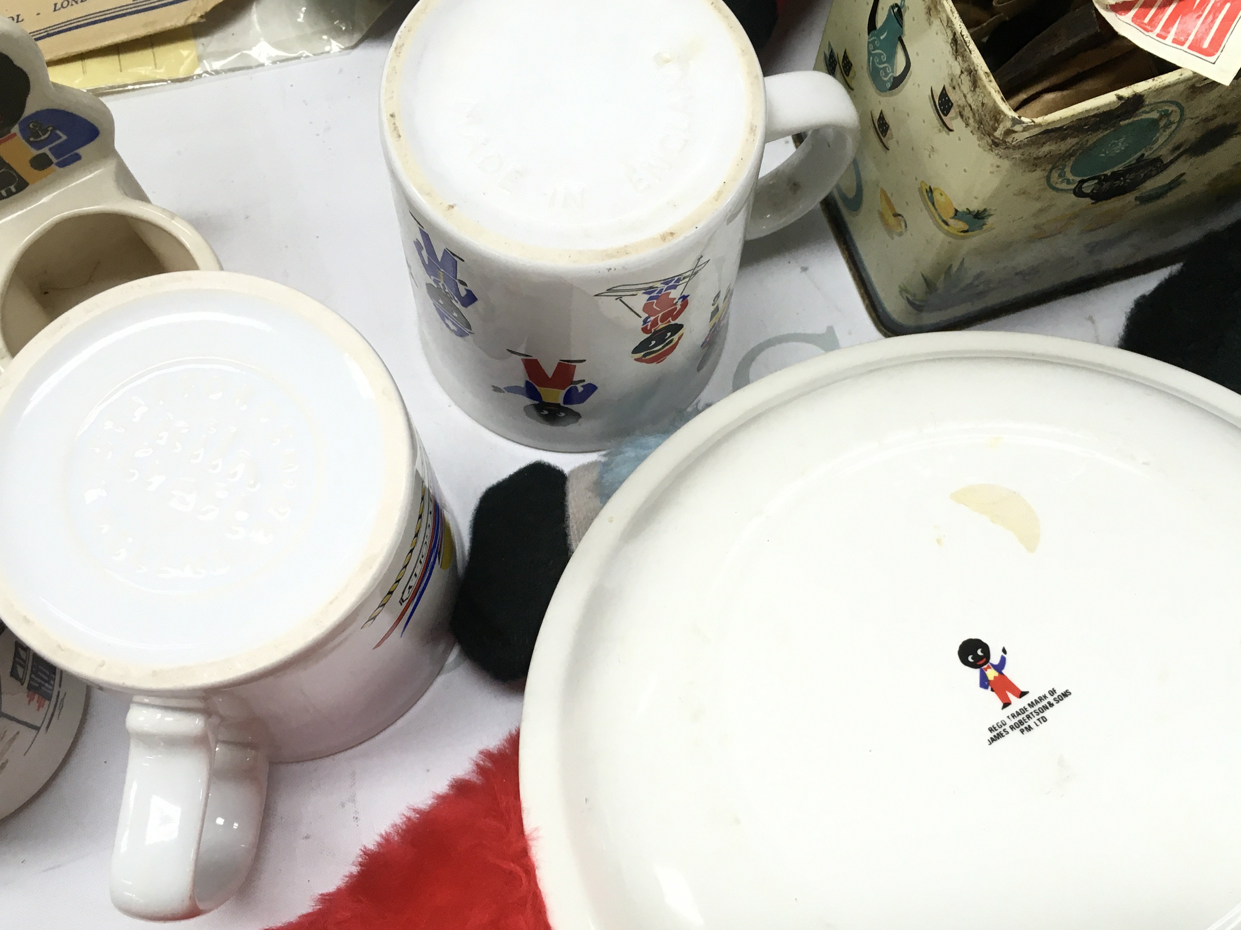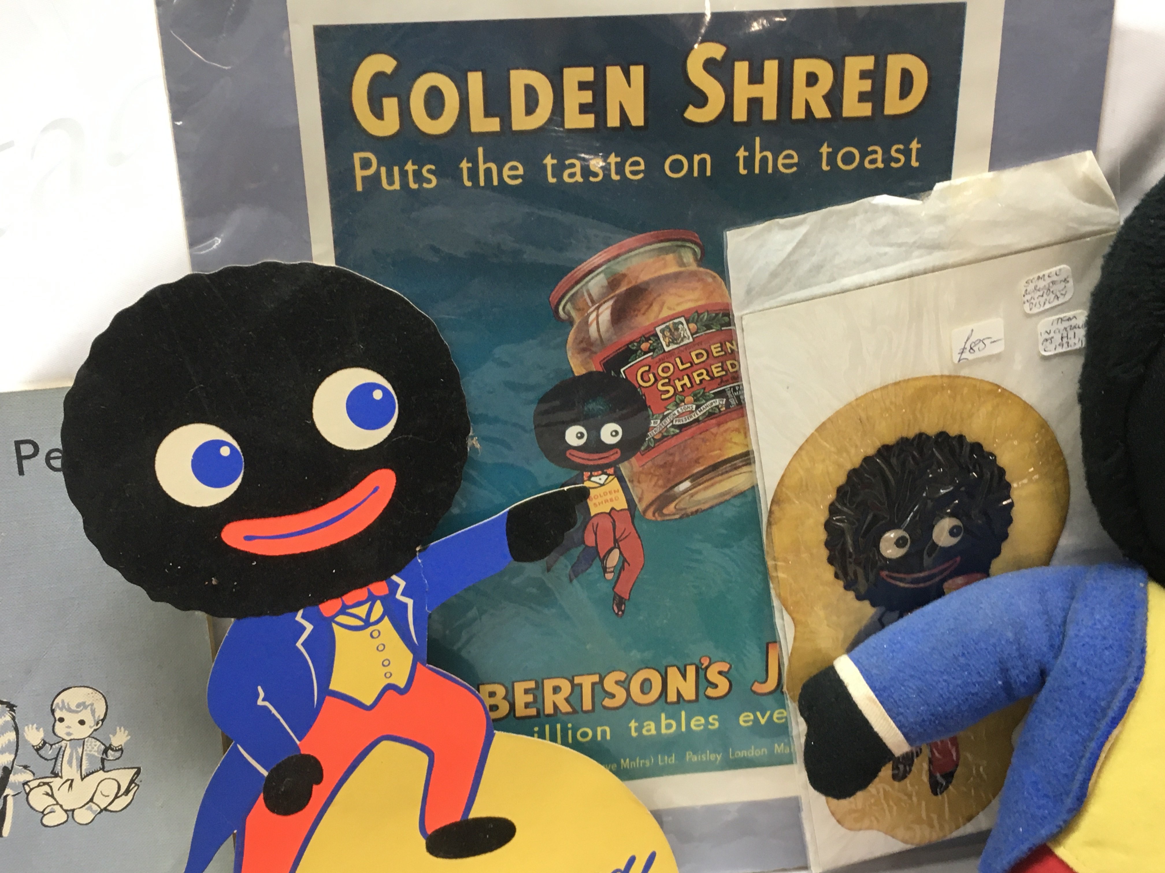 A collection of vintage golly items including soft toys, Robertsons mugs, plate, sailing club egg cup , inflatable blow up figures, shop window adverts and other advertising items. This lot cannot be posted