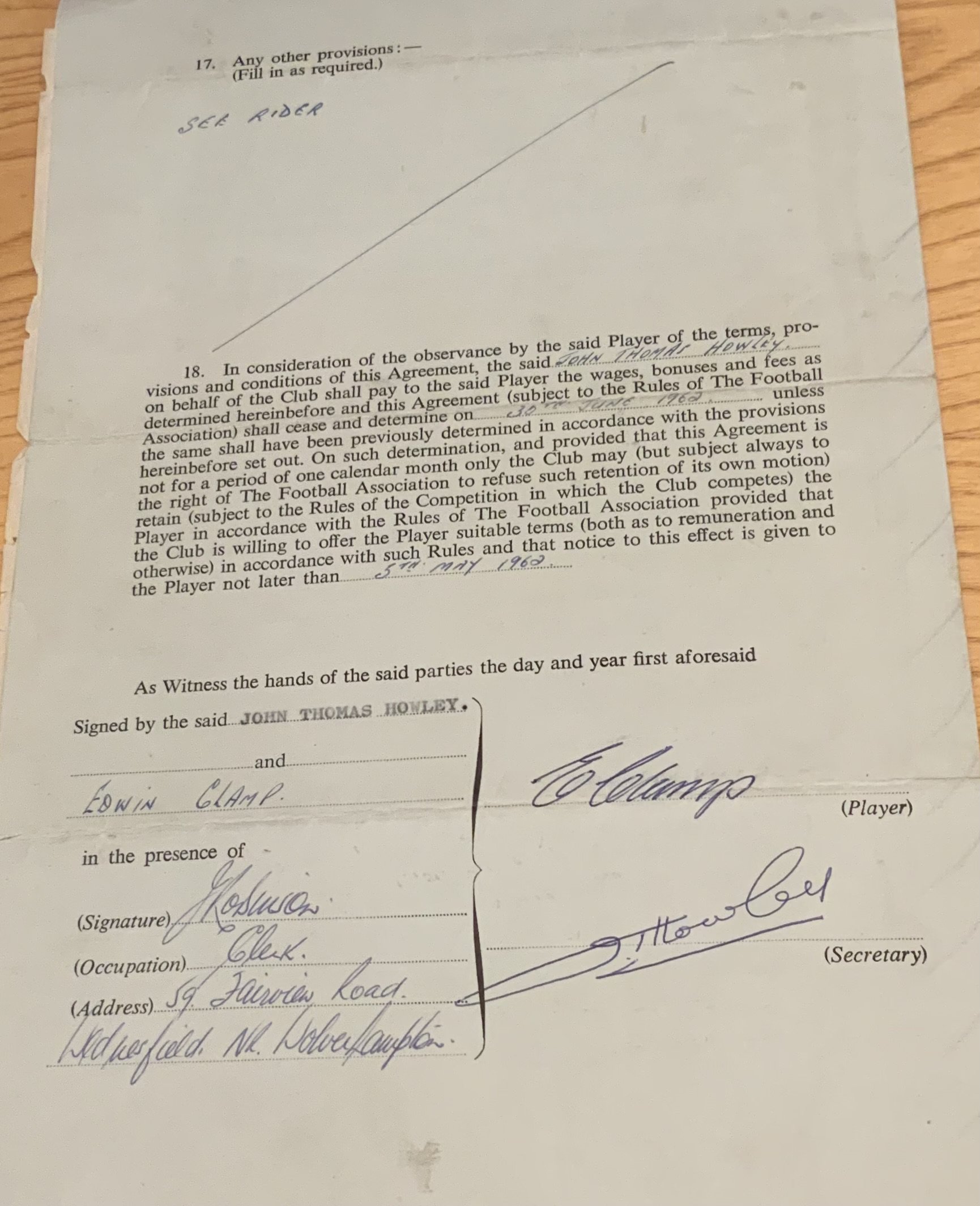61/62 Wolves Football Players Contract: 28 pounds per week contract awarded to England player Eddie Clamp with 10 bonus if they win the 1st division. Signed by player to rear and inside on clause.