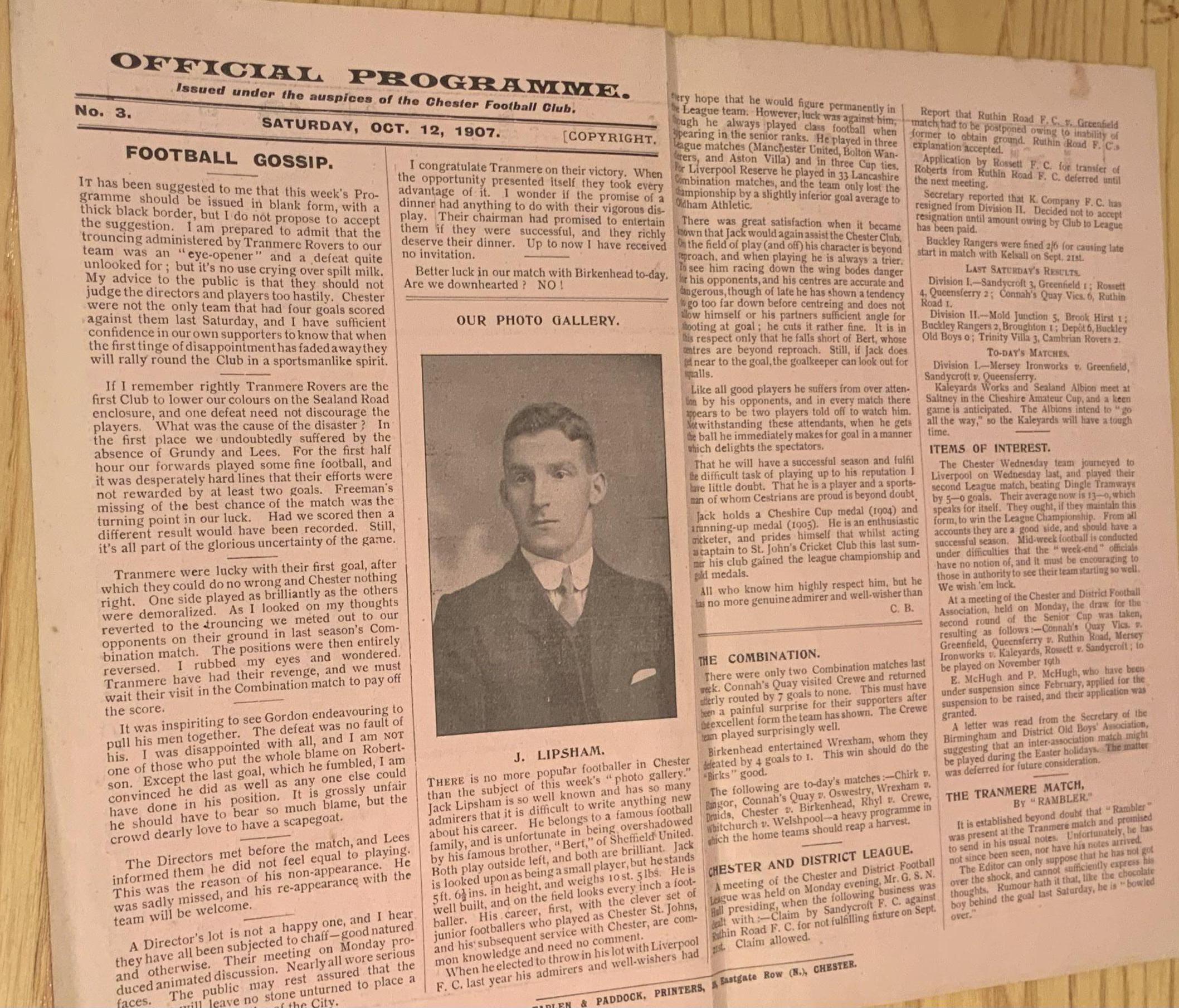 1907 - 1908 Chester v Birkenhead Football Programme: Excellent condition league match with no team changes. Dated 12 10 2007 at an original cost of one penny.