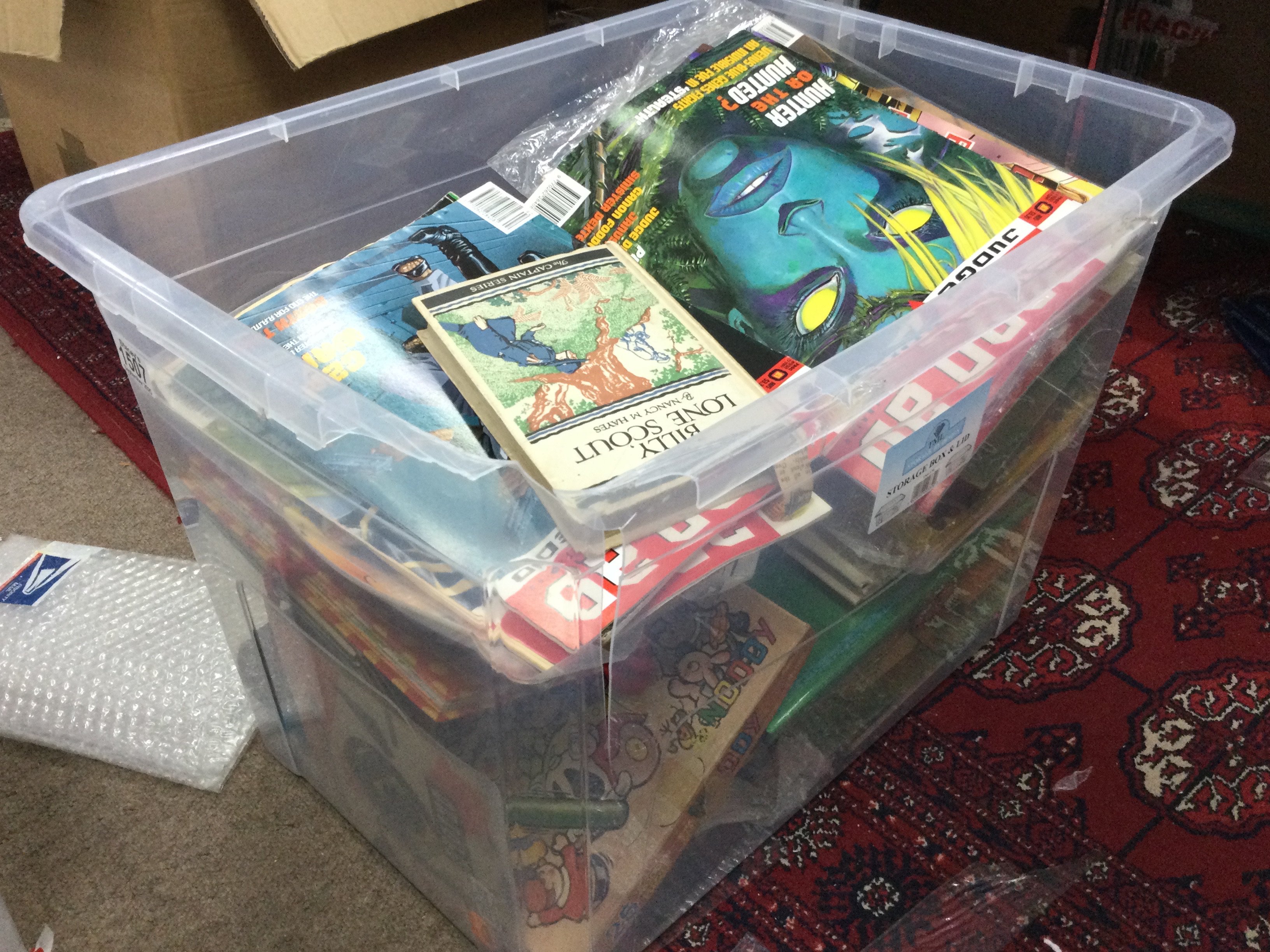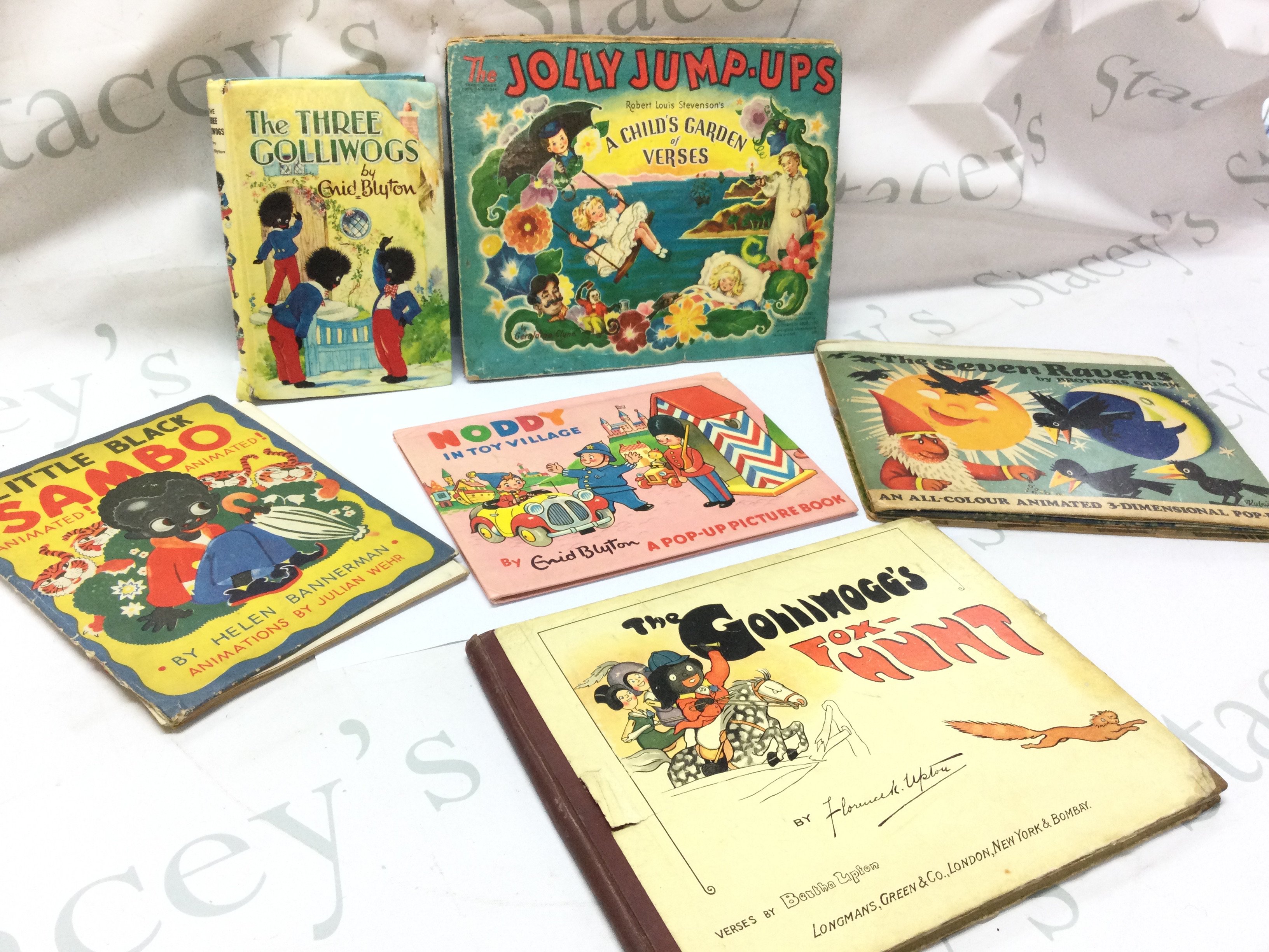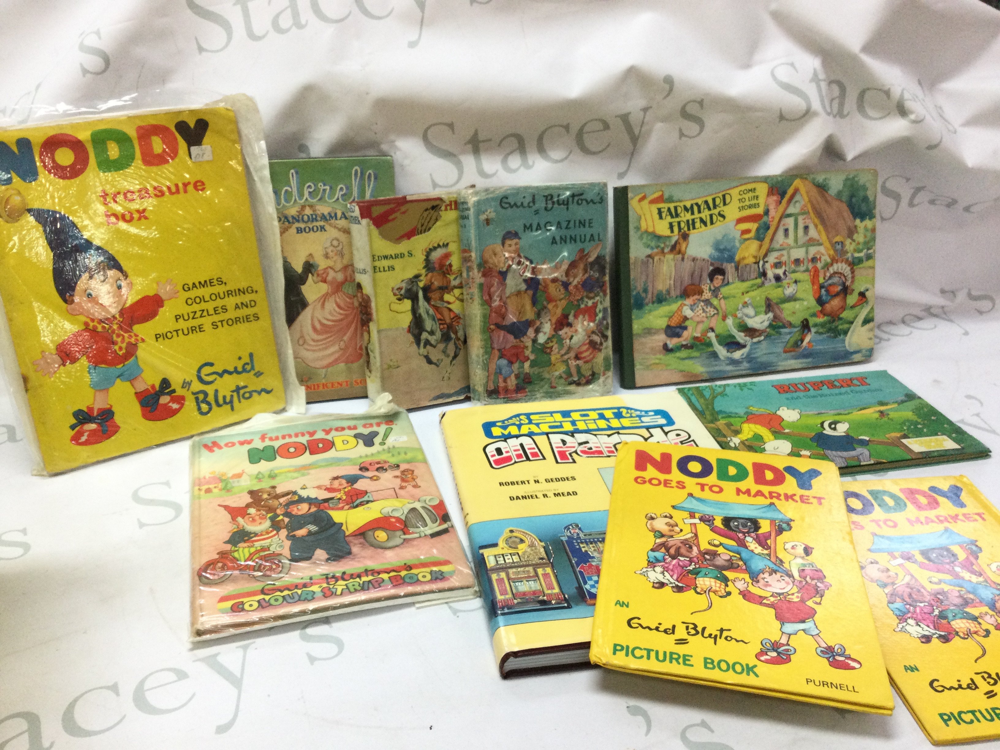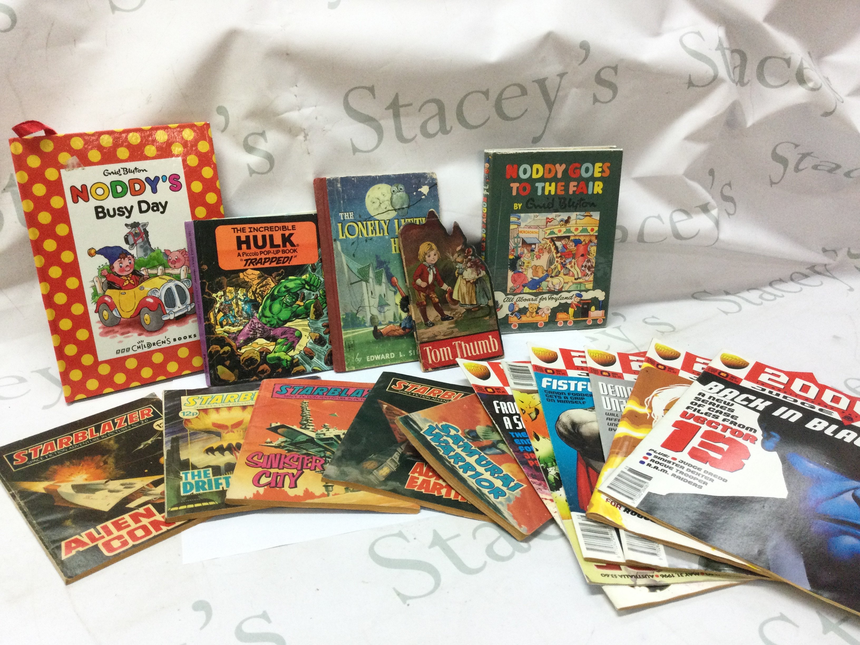 A large collection of vintage childrens books and magazines including Noddy, Enid Blyton, Slot machines on parade, StarBlazer, 2000 AD, little black sambo animated by Helen bannerman.