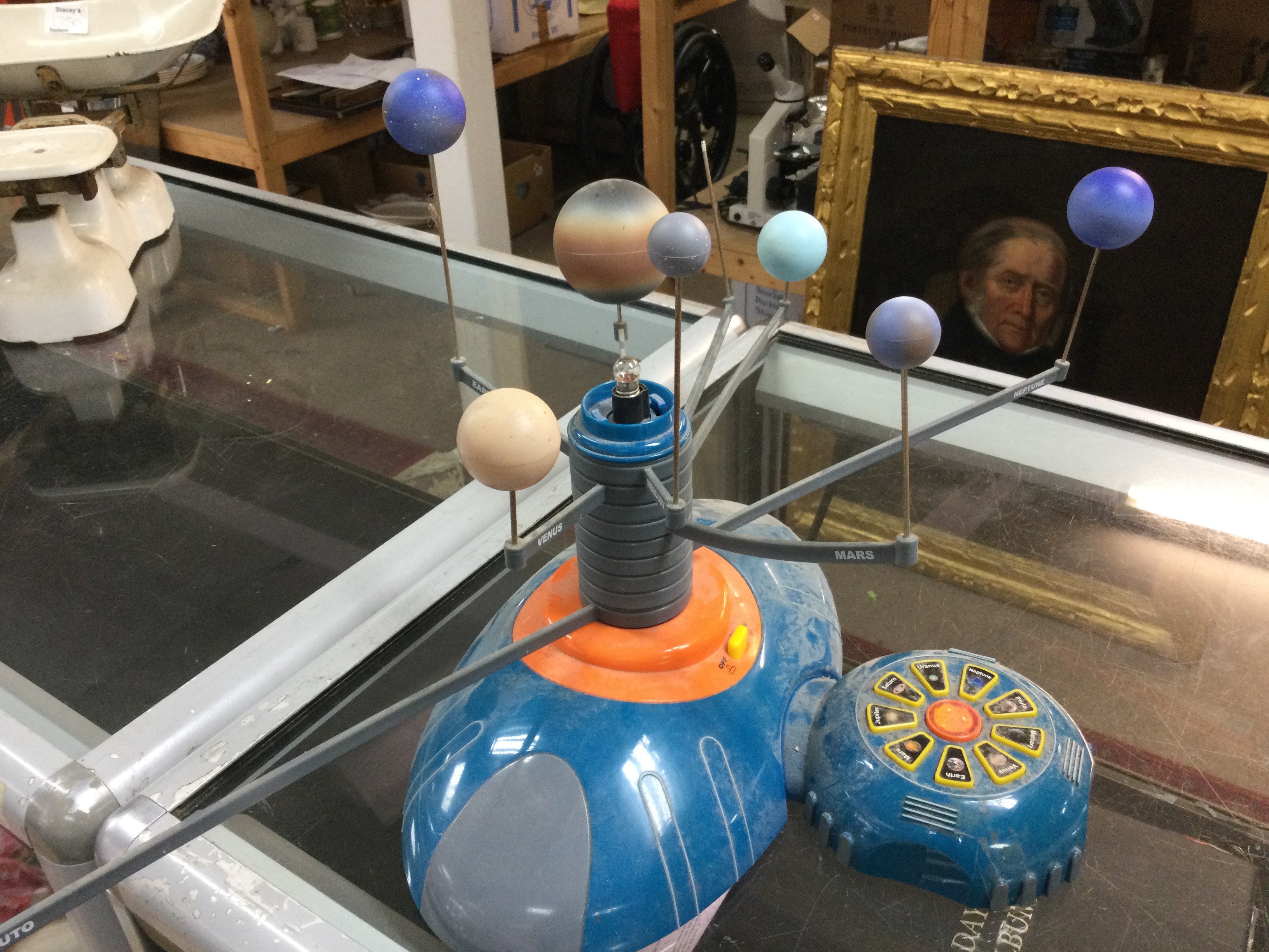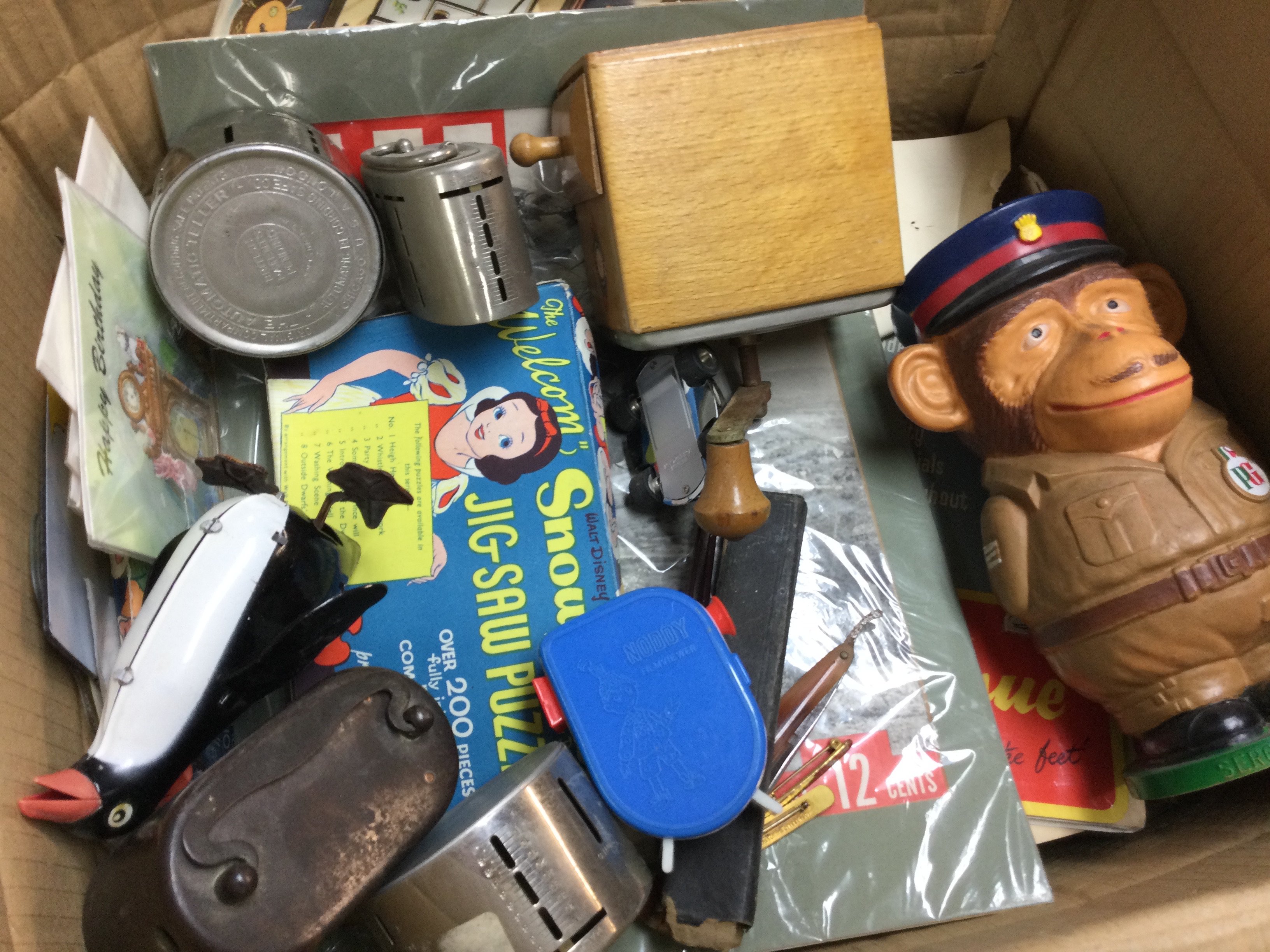 A box of mixed vintage items including a PG Tips monkey money box, Snow White jig saw puzzle, solar system toy etc. this lot cannot be posted