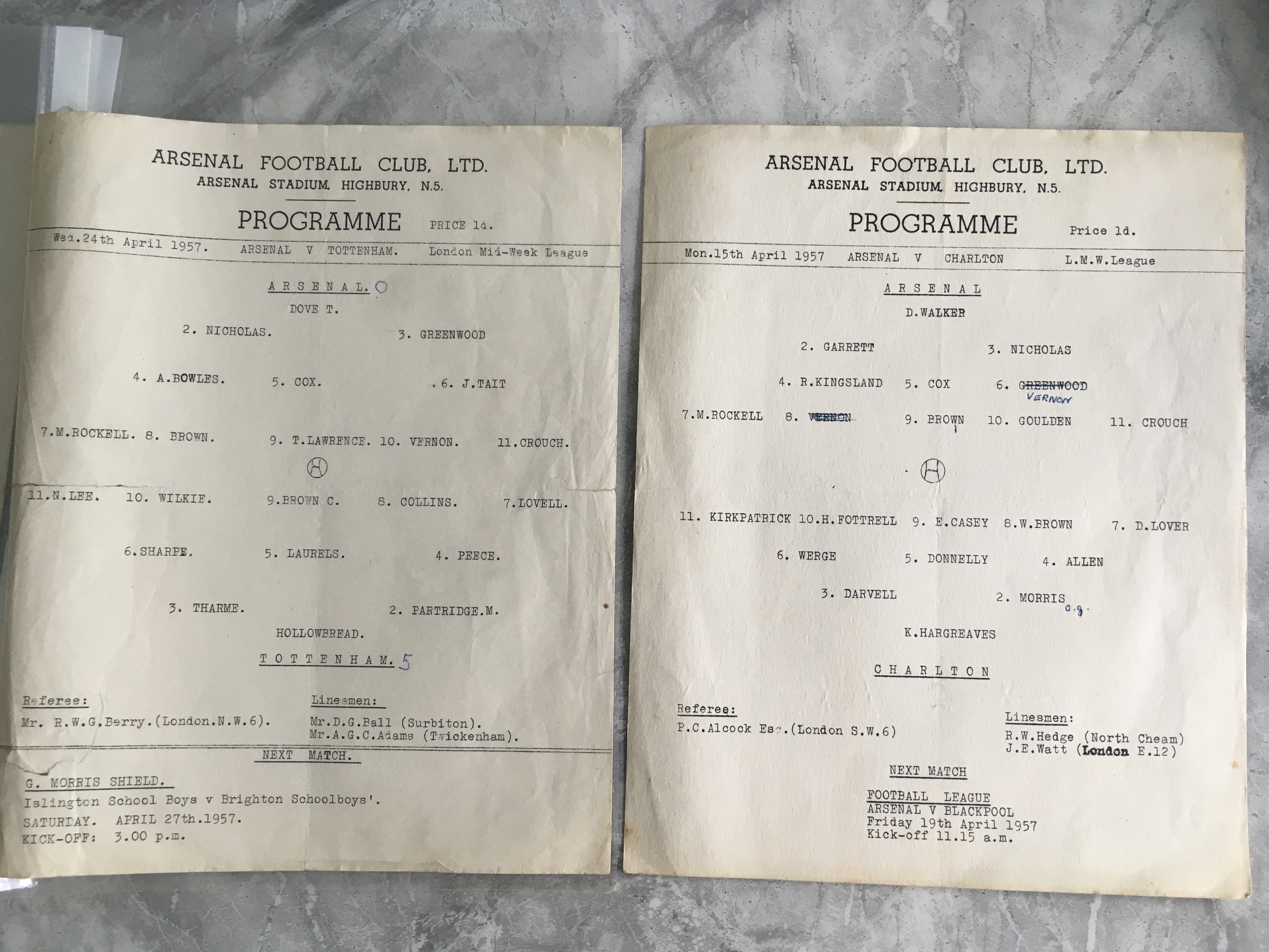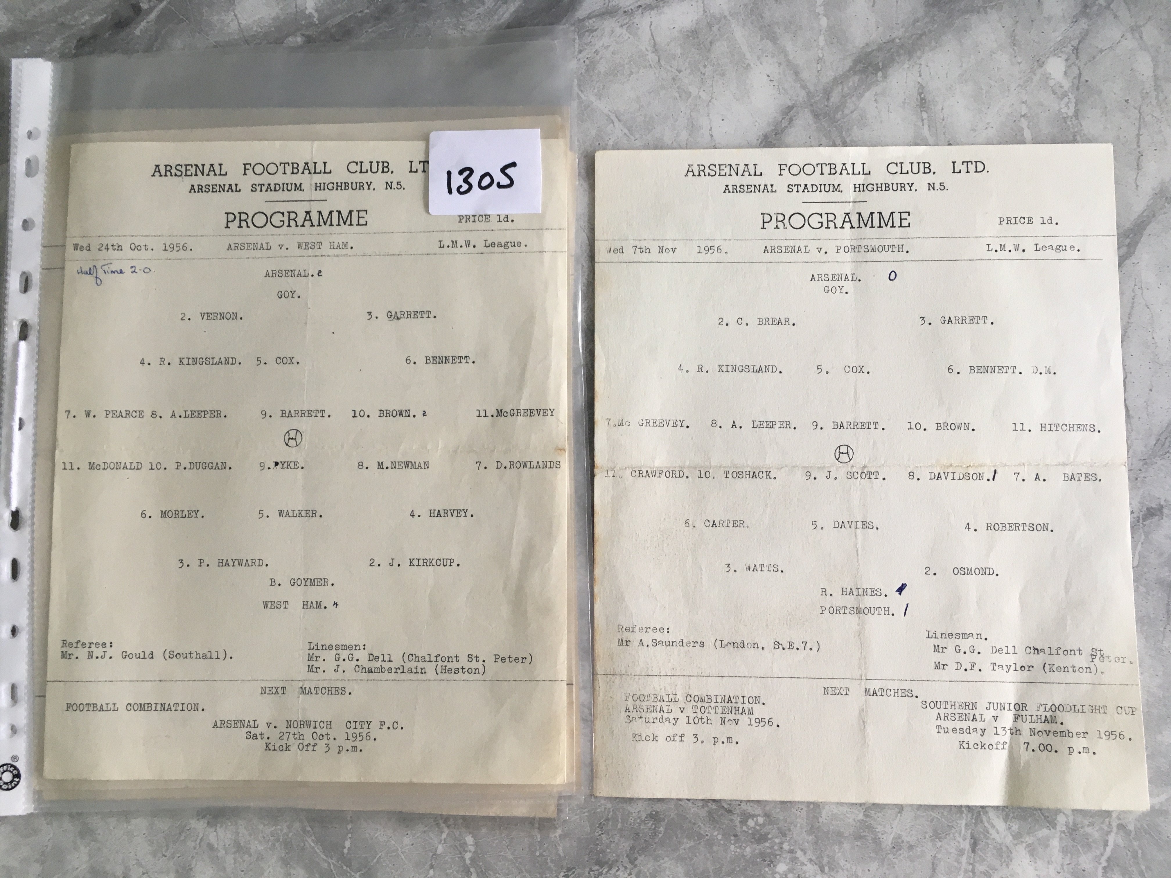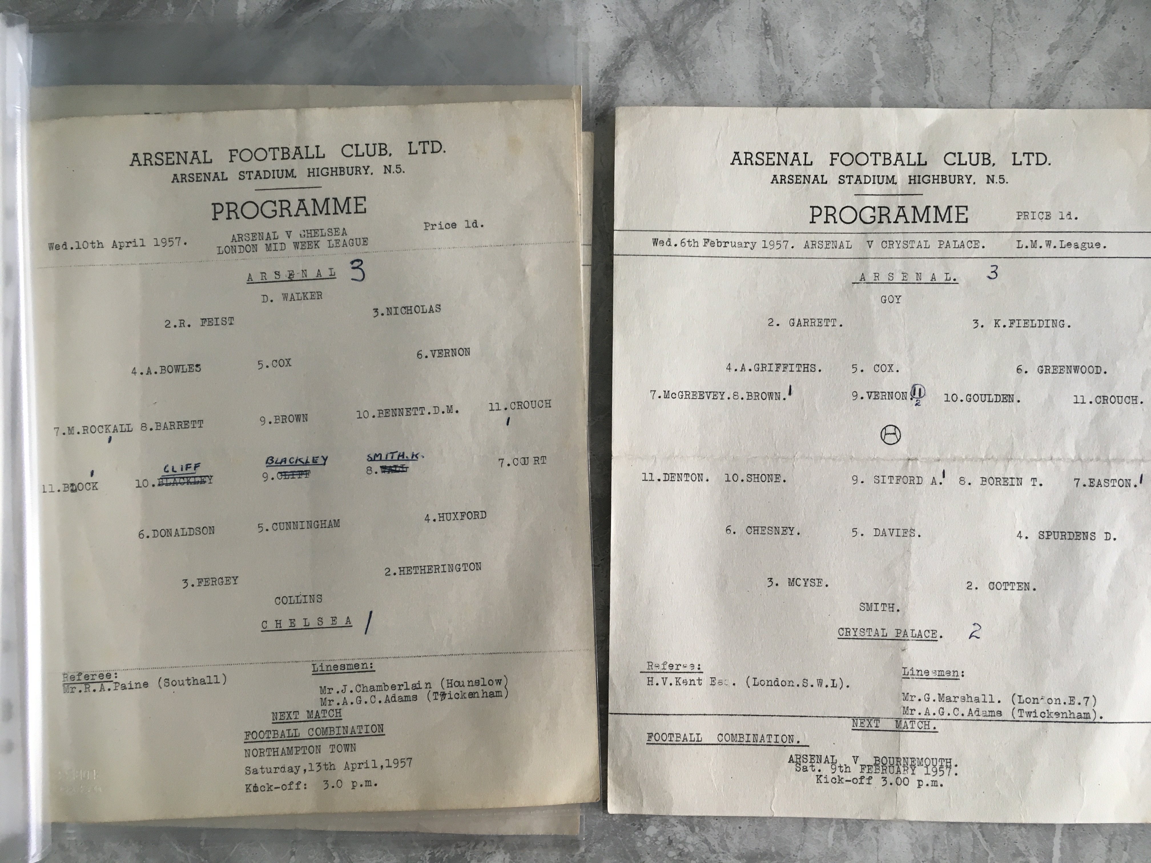 56/57 Arsenal Home LMWL Football Programmes: Large single sheets v West Ham Portsmouth Crystal Palace Chelsea Charlton and Tottenham. Some have team changes and most have score written. Very good. (6)
