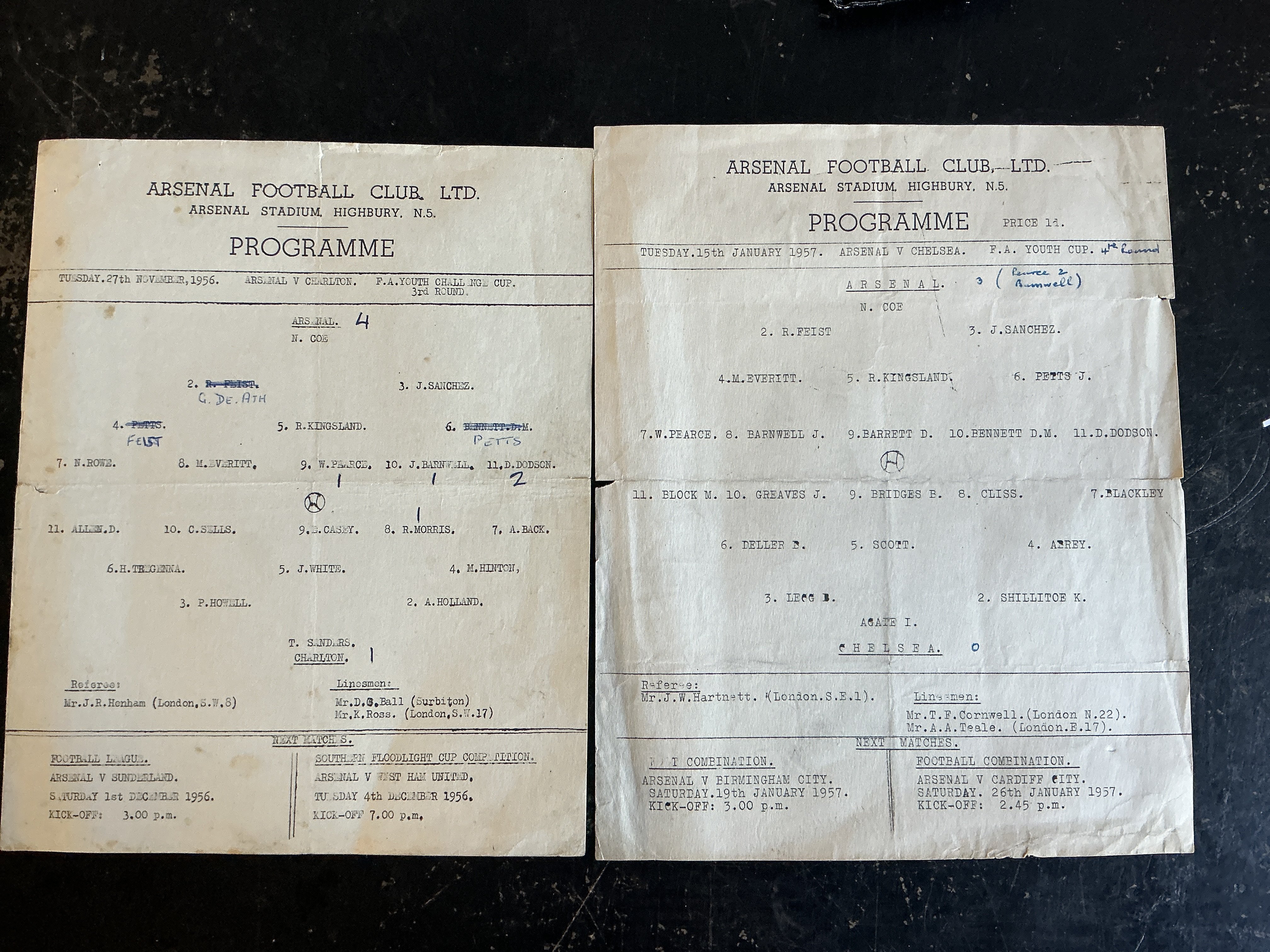 56/57 Arsenal Youth Cup Football Programmes: Good condition single sheets v Aveley Leyton Orient Charlton and Chelsea. 3 have score and scorers noted. (4)