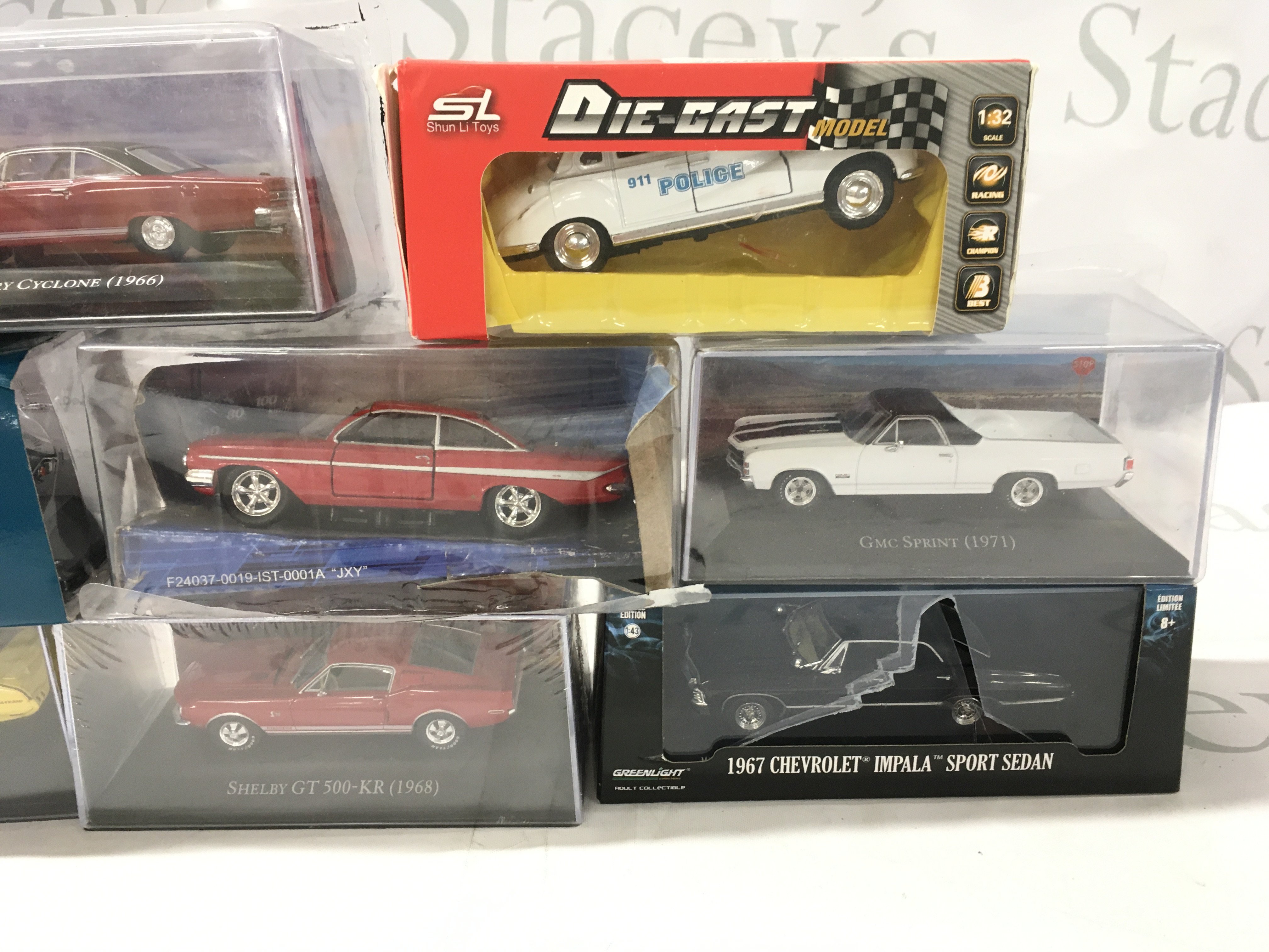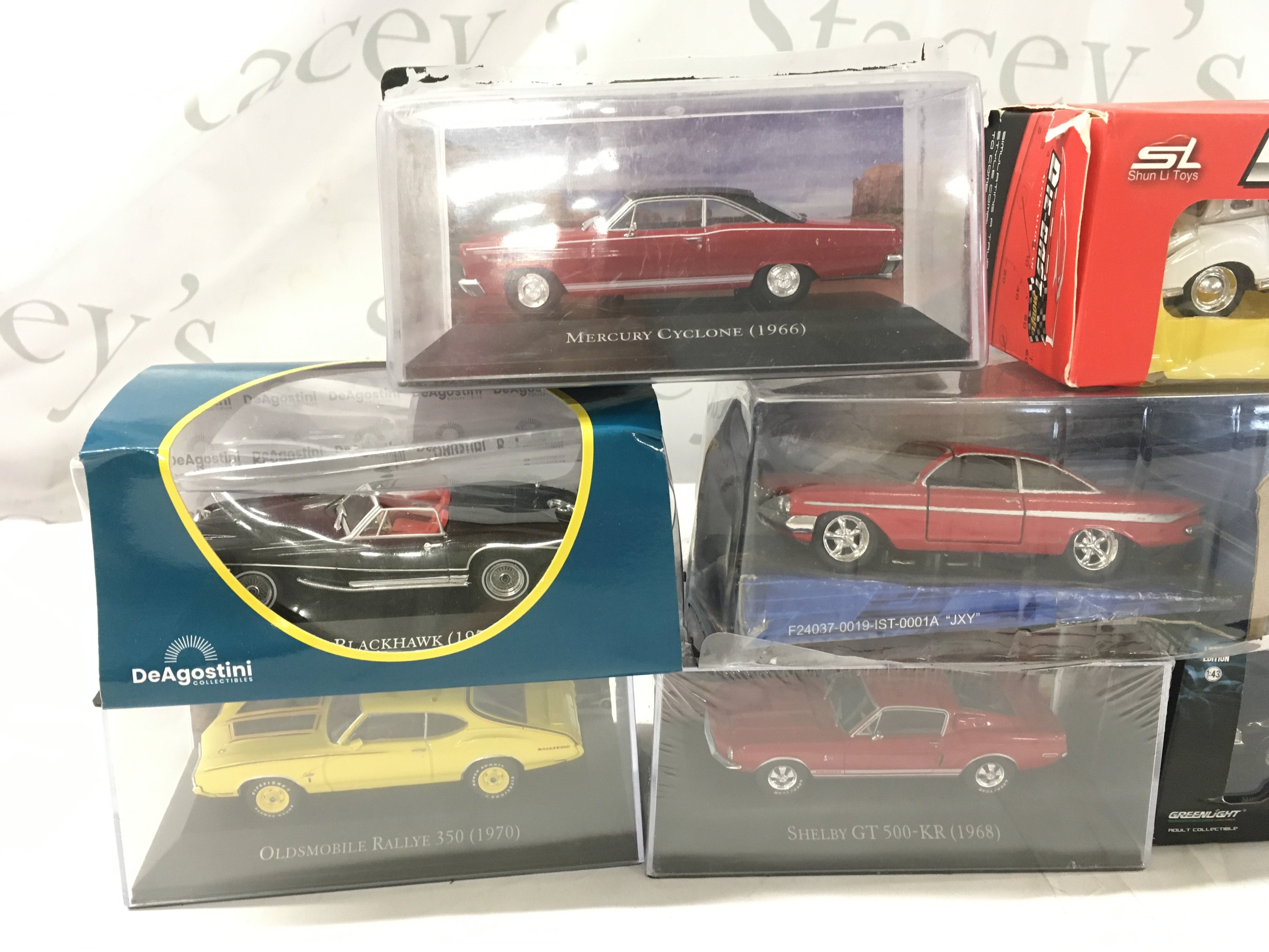 A collection of boxed diecast model vehicles by various manufacturers featuring American cars. No reserve