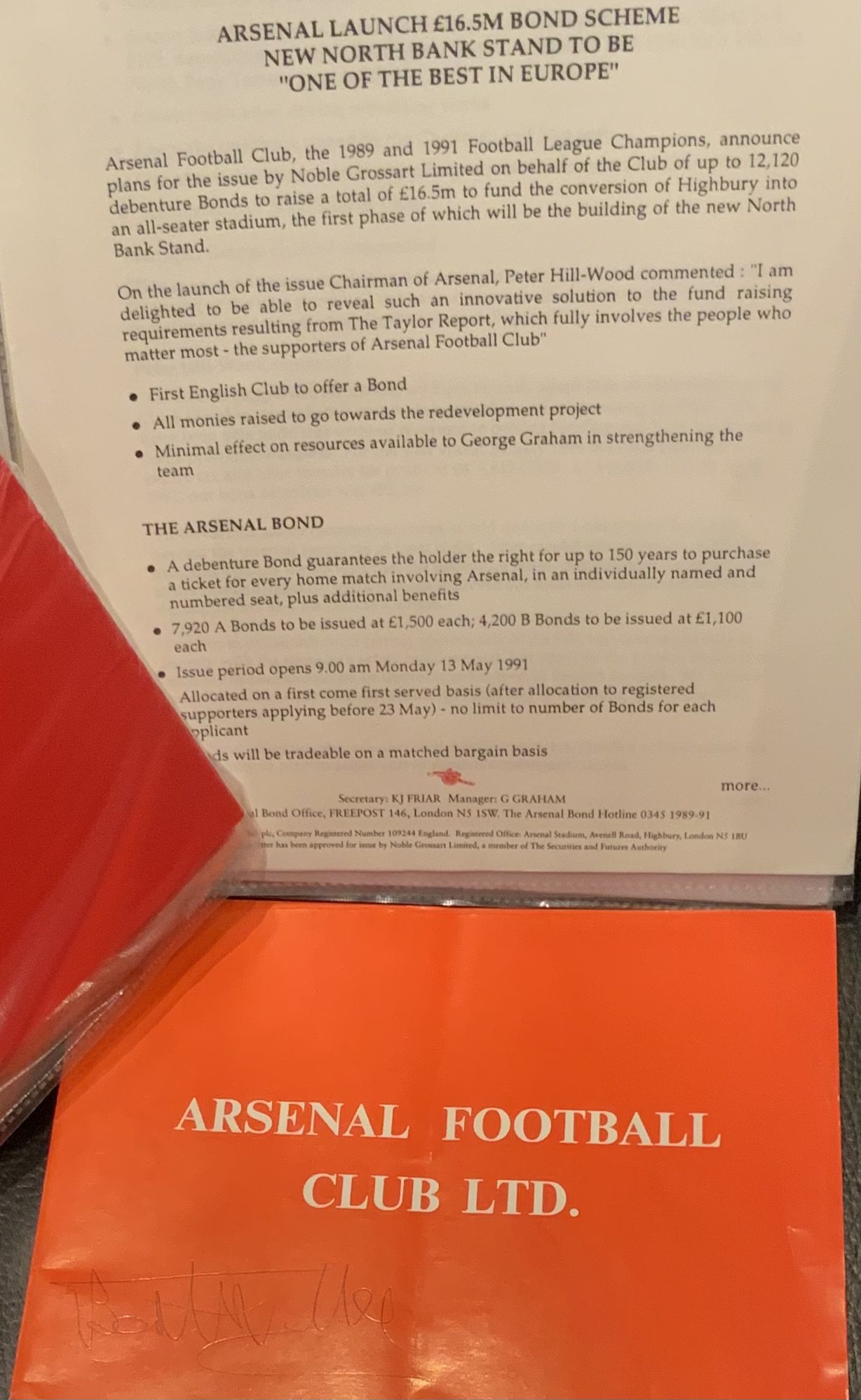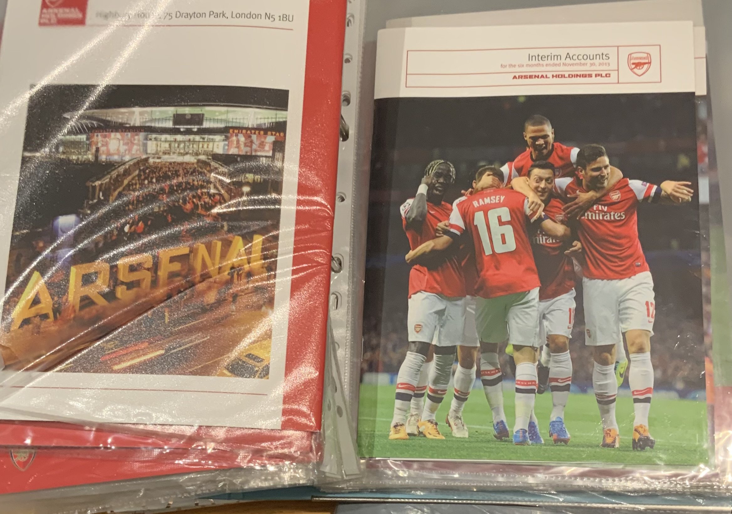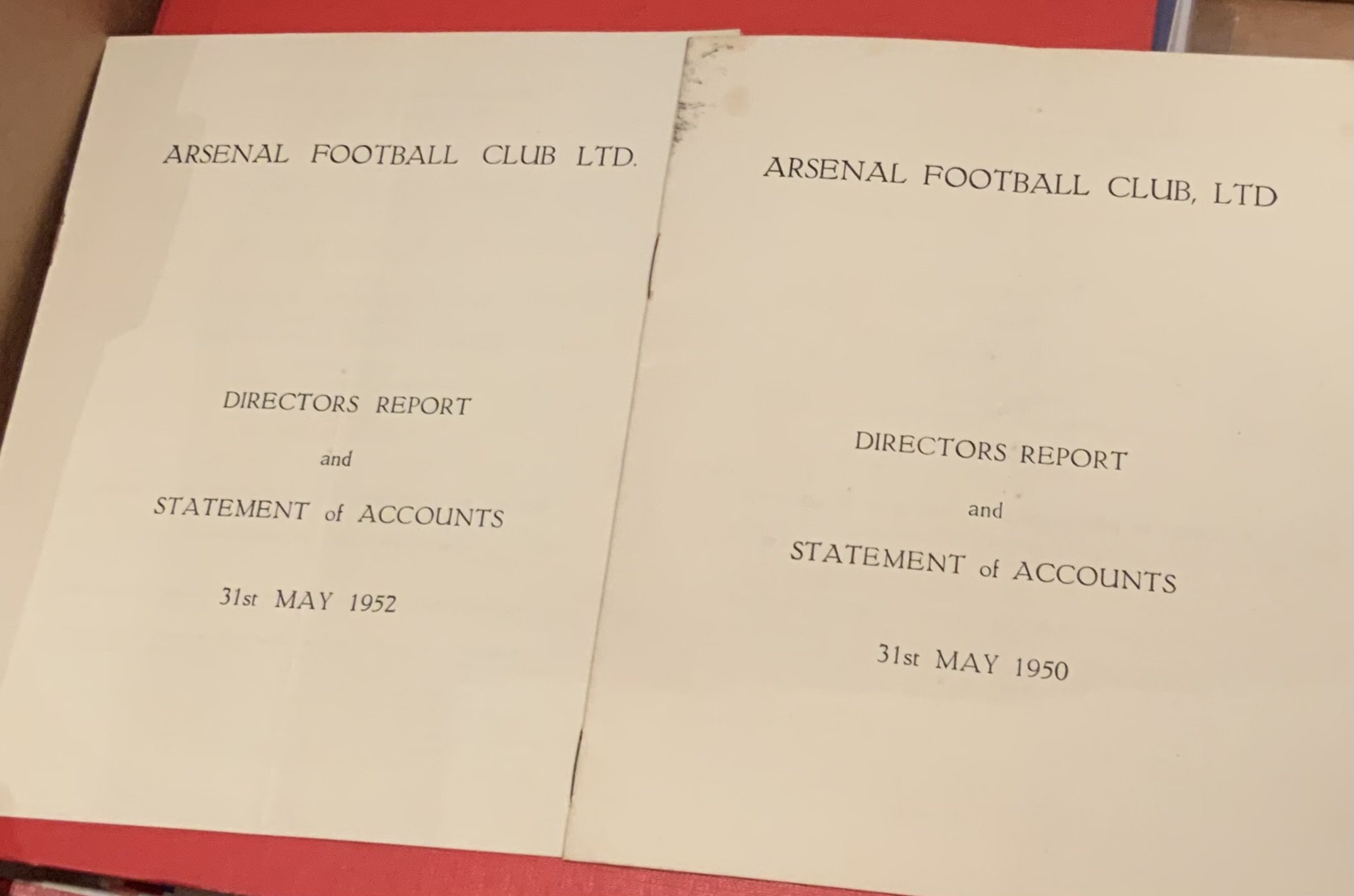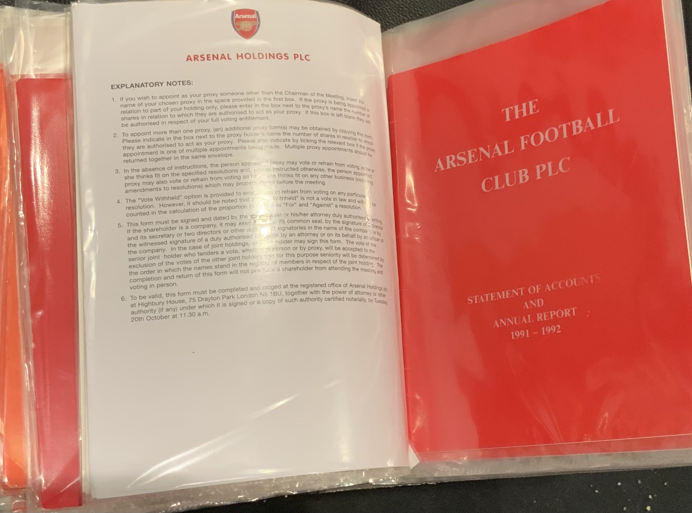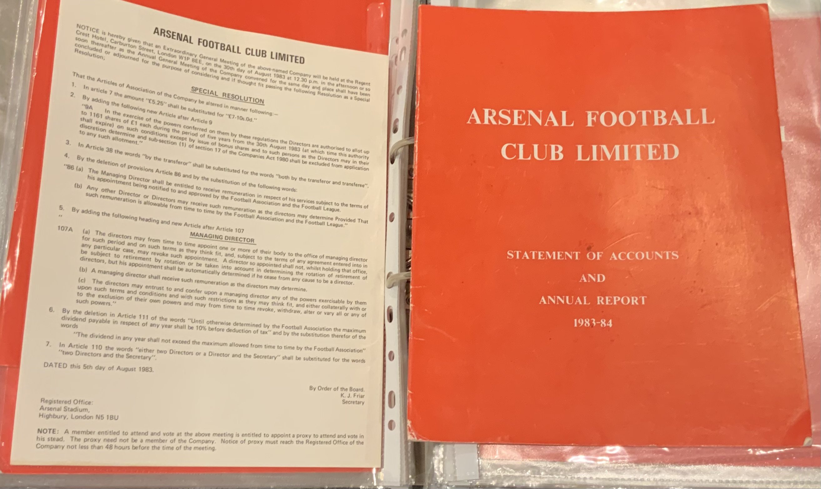 Arsenal Football Club Accounts + Reports: End of year Directors Reports and Statements of Accounts starting with 1950 and 1952 and then a near complete run from 1965 to 2017. A Bertie Mee autograph on 1971 - 72 report. Also present are some meeting invites as well as a folder of November half year reports from 1999 to 2016. Booklet referring to the 1991 bond scheme included. Three binders with some minor duplication. (Estimate 80)