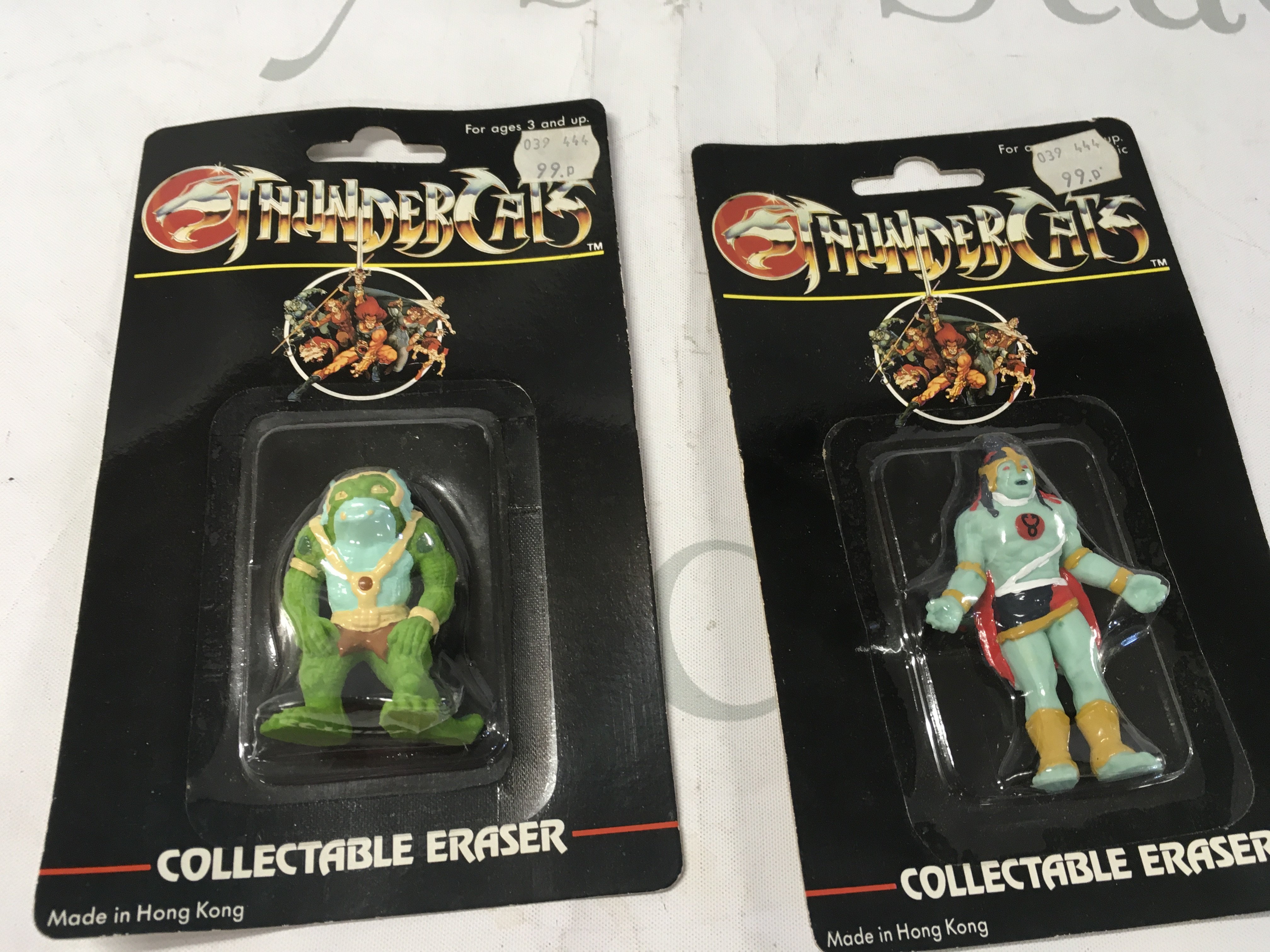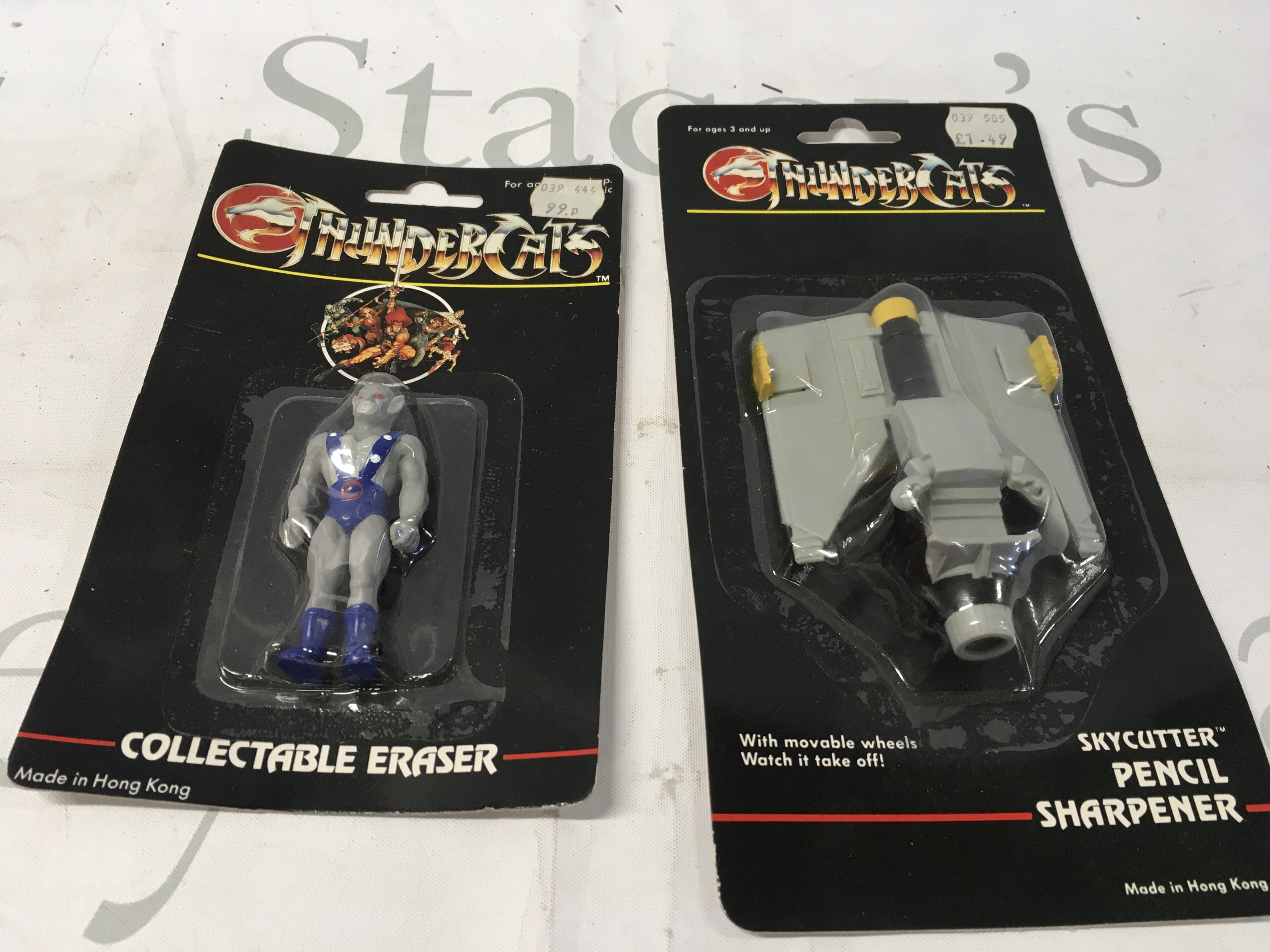 4 sealed Thundercats items featuring 3 Collectable erasers Mummra..Panthro…Slithe. and 1 pencil sharpener. Sky cutter.