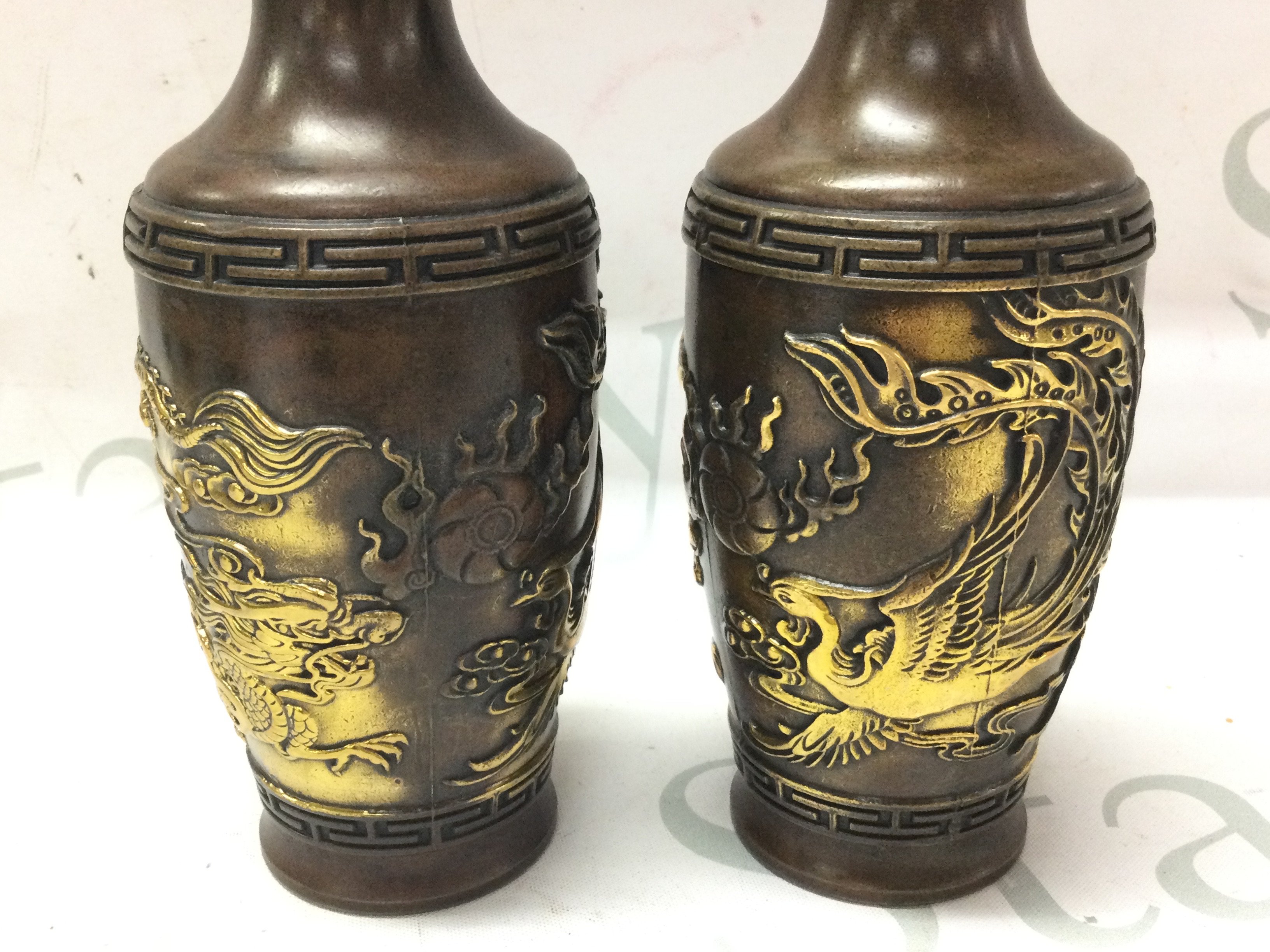 Two Chinese bronze Dragon and Phoenix vases with four character marks at base, 15cm tall. Postage category B